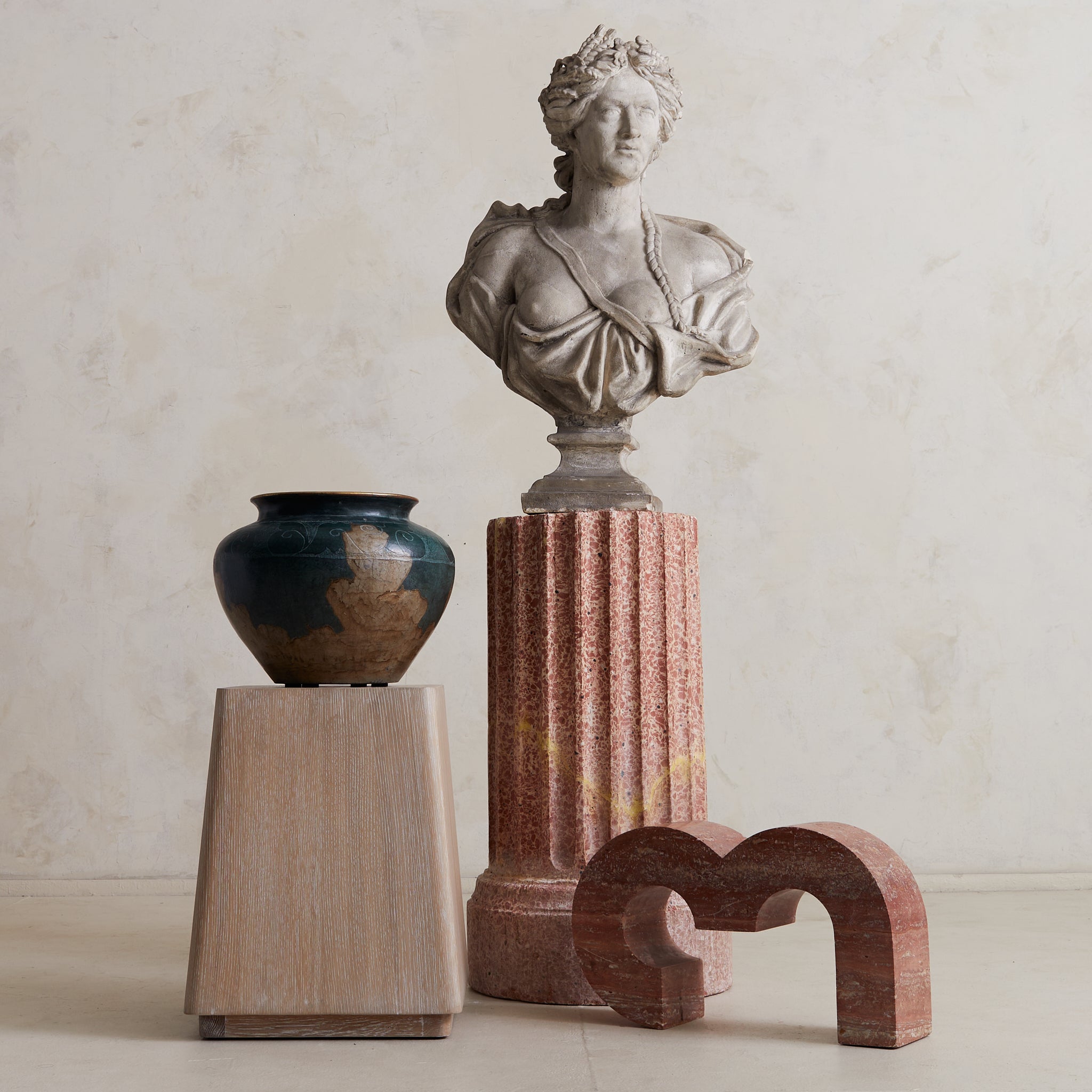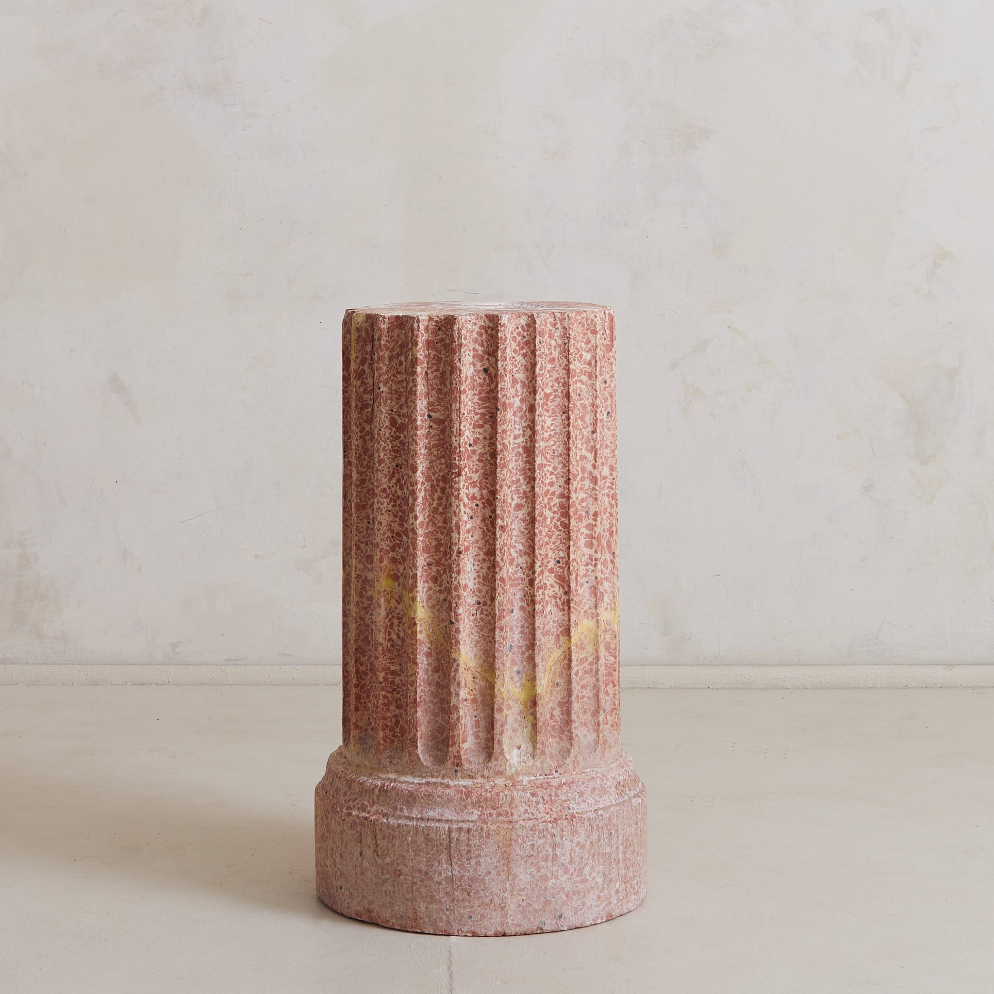 This Neoclassical pedestal features vertical fluting and a robust plinth, drawing upon the architectural language of ancient Rome. Its rose-toned body is subtly animated with golden ochre veining and tonal mottling. The piece functions equally well as an object of display or as a base for sculpture.