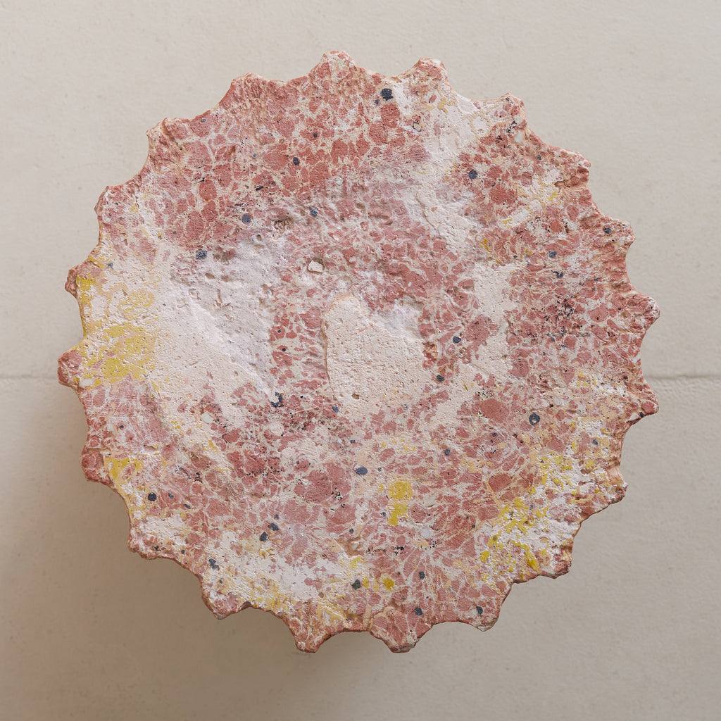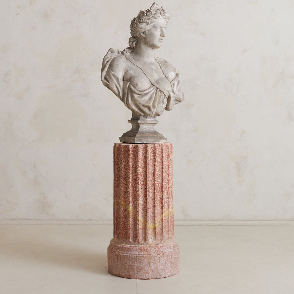 A fluted pedestal in deep rose veining, this sculptural column is crafted from richly pigmented scagliola—a refined composite developed in 17th-century Italy as a visually opulent alternative to natural marble. The technique was especially prized for its ability to imitate the extravagant richness of stones such as breccia, porphyry, and lapis lazuli, offering a palette of colours and patterns unachievable with quarried marble alone.