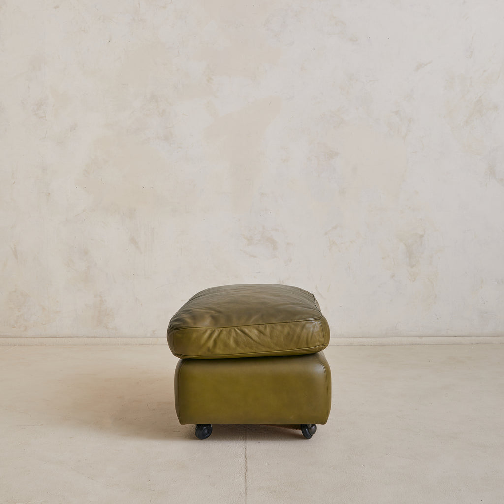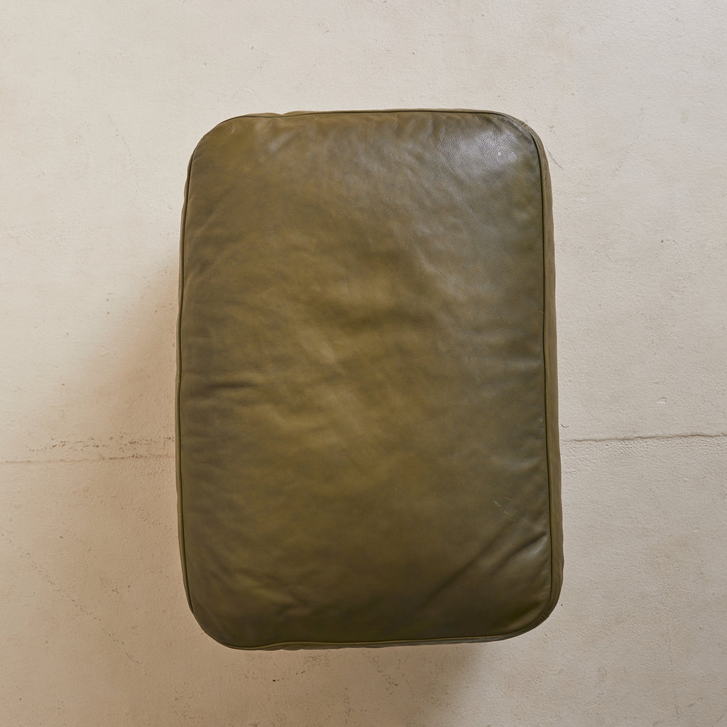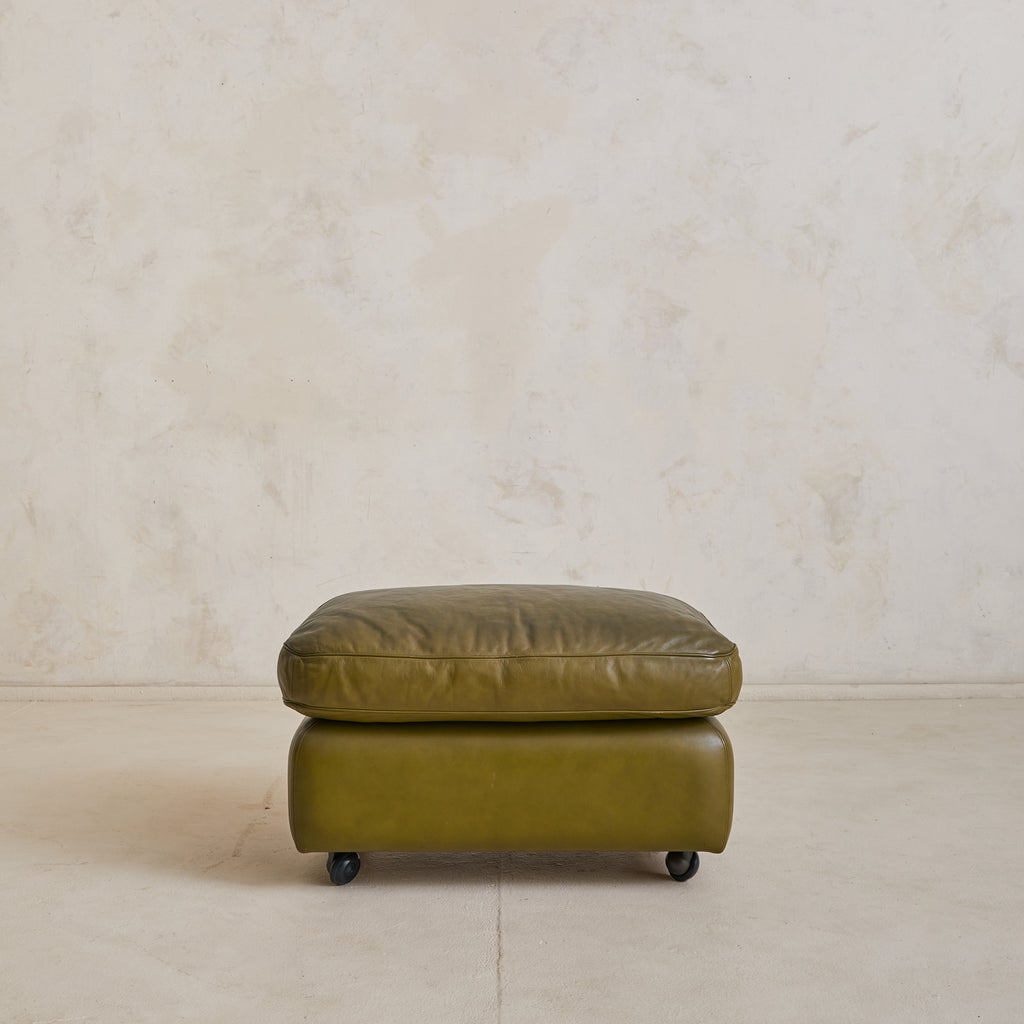 Designed by Tito Agnoli for Poltrona Frau in the 1970s, this ottoman captures the essence of Italian modernism. Upholstered in supple, olive-toned leather, its clean lines are softened by an overstuffed, down-filled cushion that invites repose. Resting on discreet casters, the piece moves with ease—lending flexibility to its sculptural presence. Over time, the leather has developed a rich patina, a tactile record of decades of leisure.