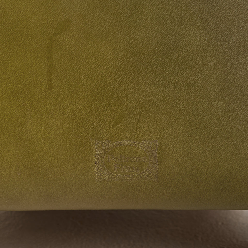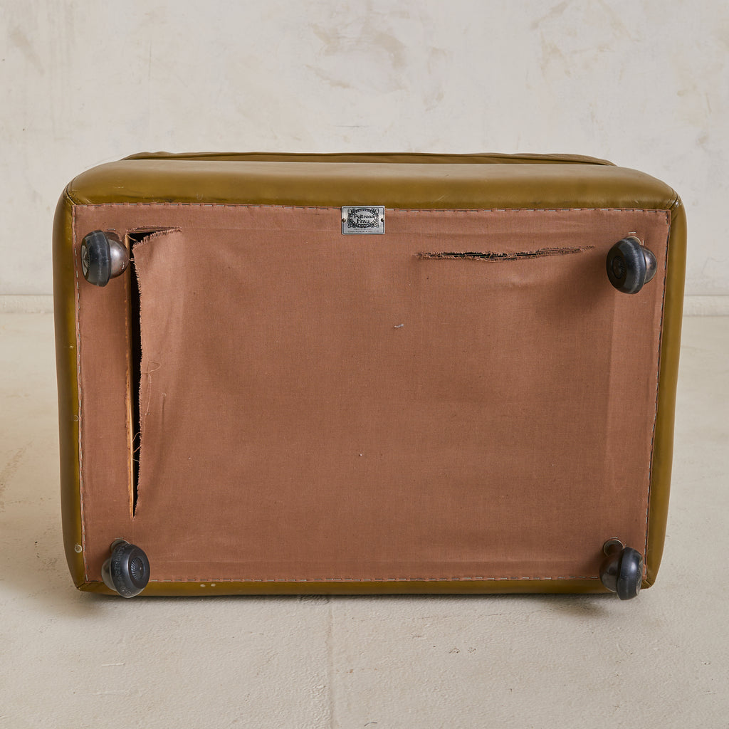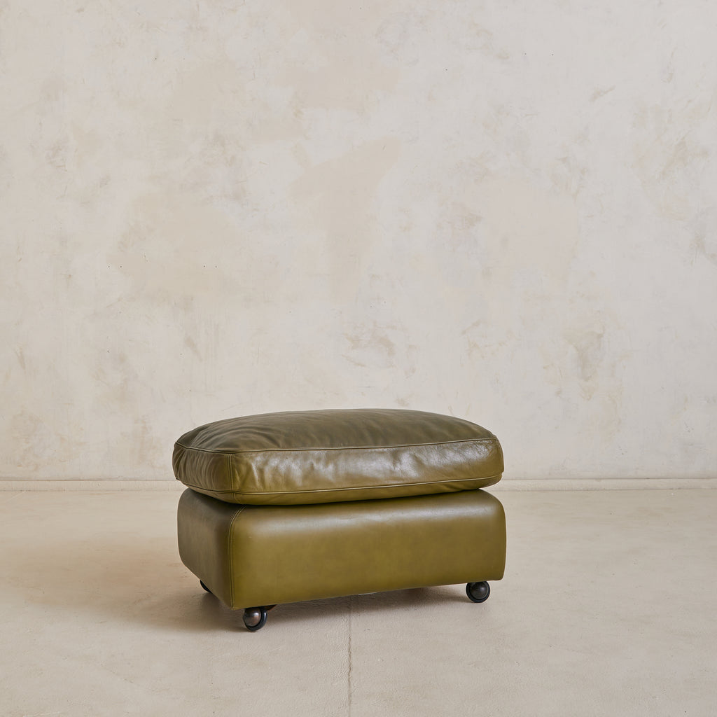 Designed by Tito Agnoli for Poltrona Frau in the 1970s, this ottoman captures the essence of Italian modernism. Upholstered in supple, olive-toned leather, its clean lines are softened by an overstuffed, down-filled cushion that invites repose. Resting on discreet casters, the piece moves with ease—lending flexibility to its sculptural presence. Over time, the leather has developed a rich patina, a tactile record of decades of leisure.