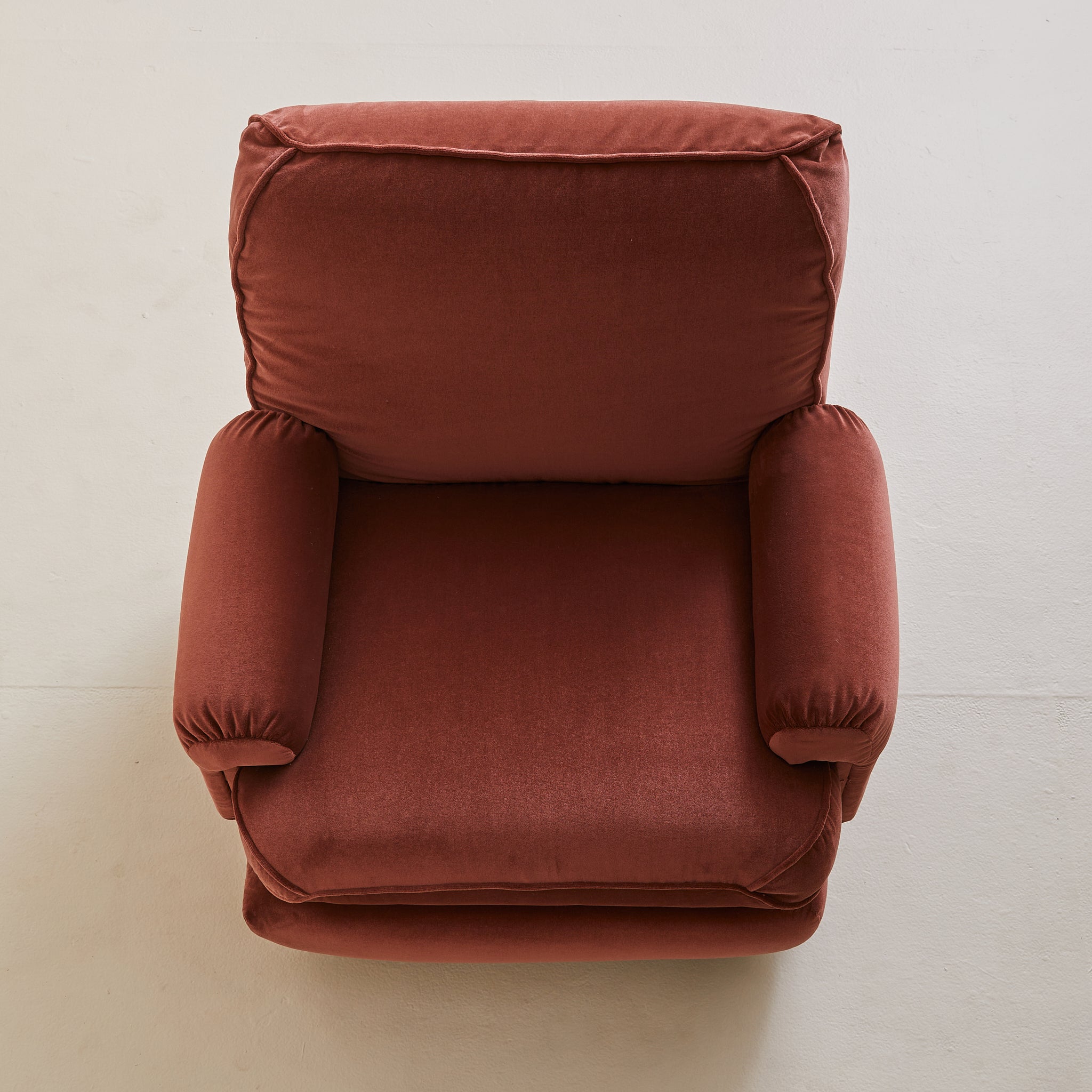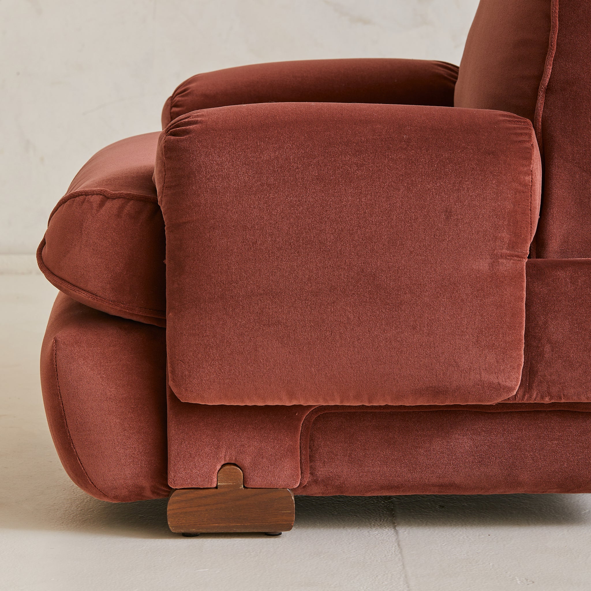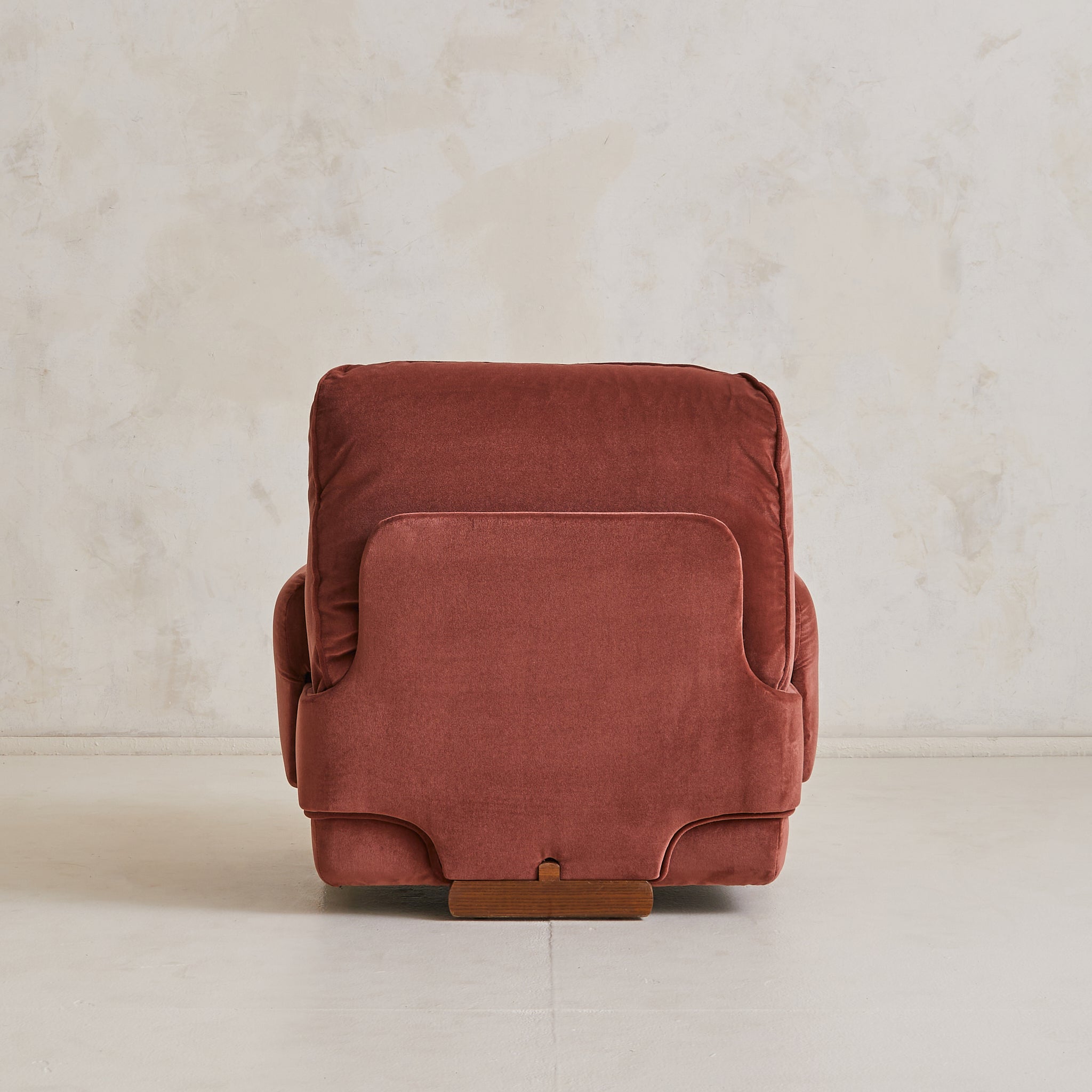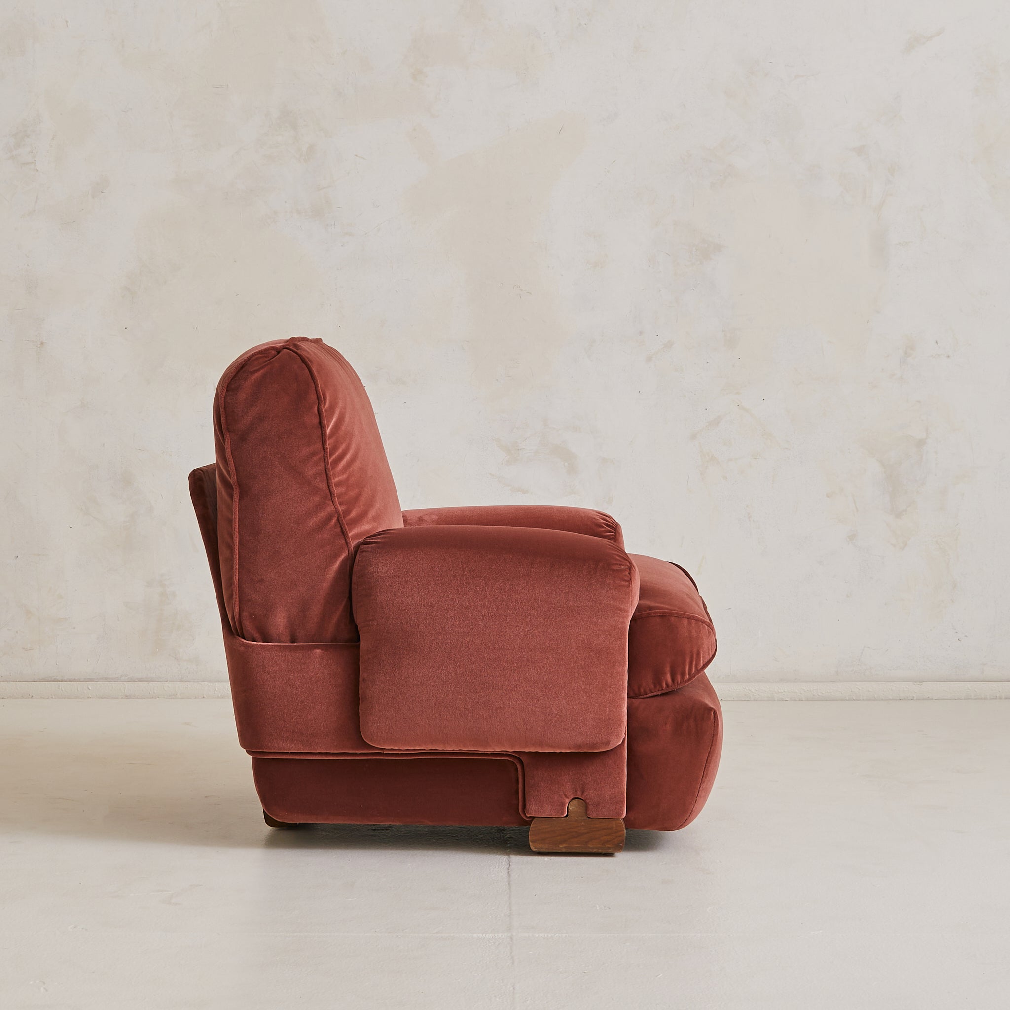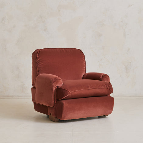 A 1970s Italian armchair wrapped in sumptuous oxblood velvet. Its silhouette is defined by overstuffed, gently rounded cushions with welt detailing and soft, gathered arms. The low-slung seat rests atop arched wooden feet, offering just a hint of lift beneath the plush, sculptural frame. A pocket along the back provides a discreet place for a book or magazine.