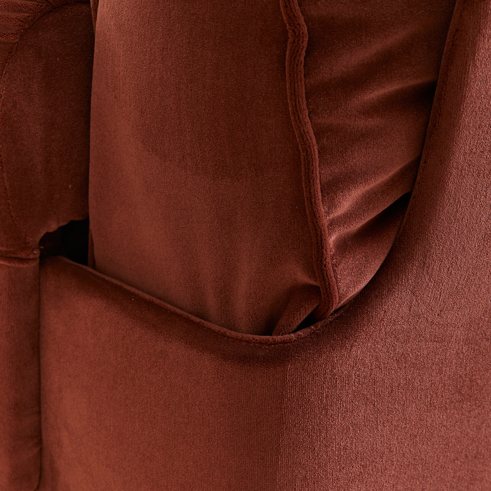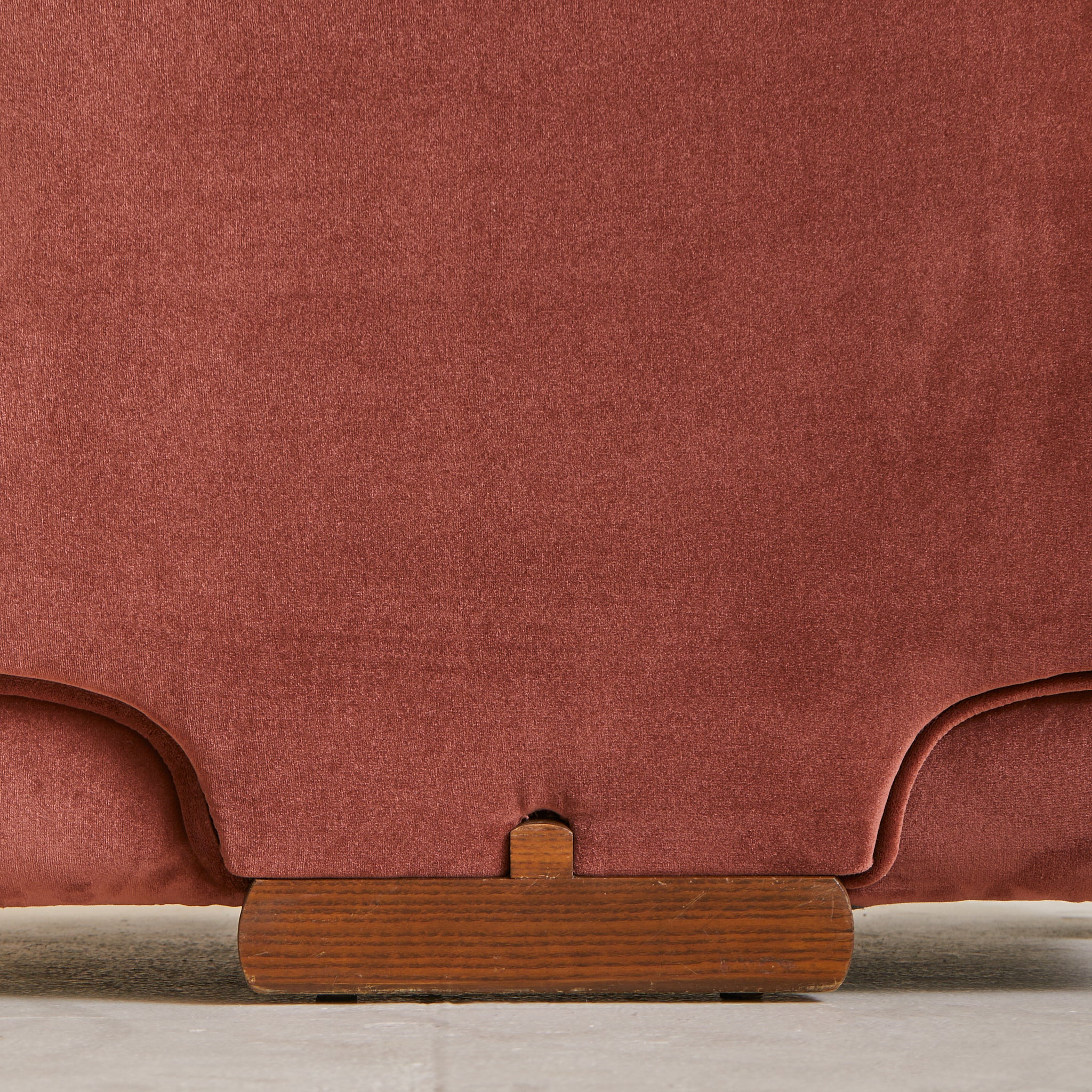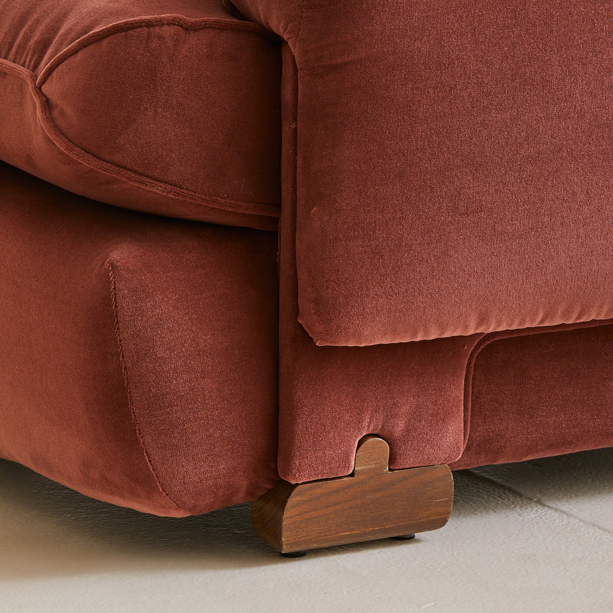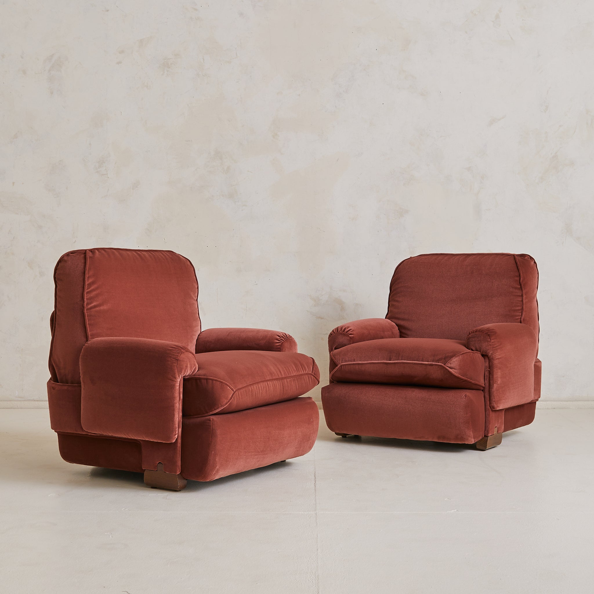 A 1970s Italian armchair wrapped in sumptuous oxblood velvet. Its silhouette is defined by overstuffed, gently rounded cushions with welt detailing and soft, gathered arms. The low-slung seat rests atop arched wooden feet, offering just a hint of lift beneath the plush, sculptural frame. A pocket along the back provides a discreet place for a book or magazine.