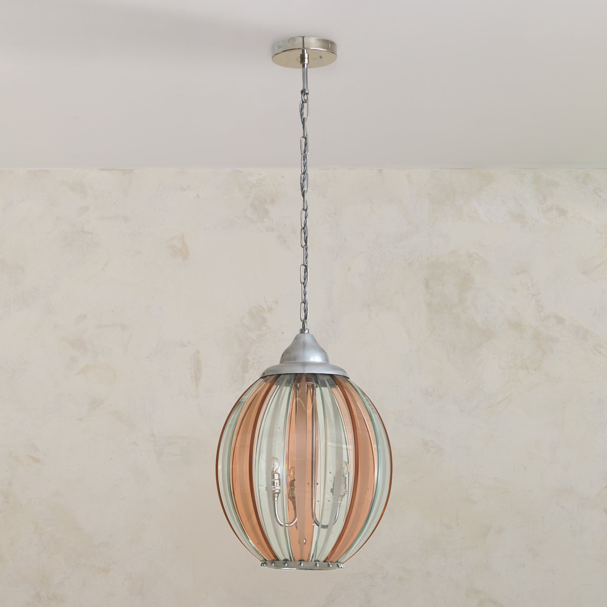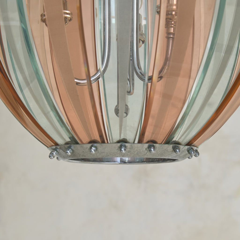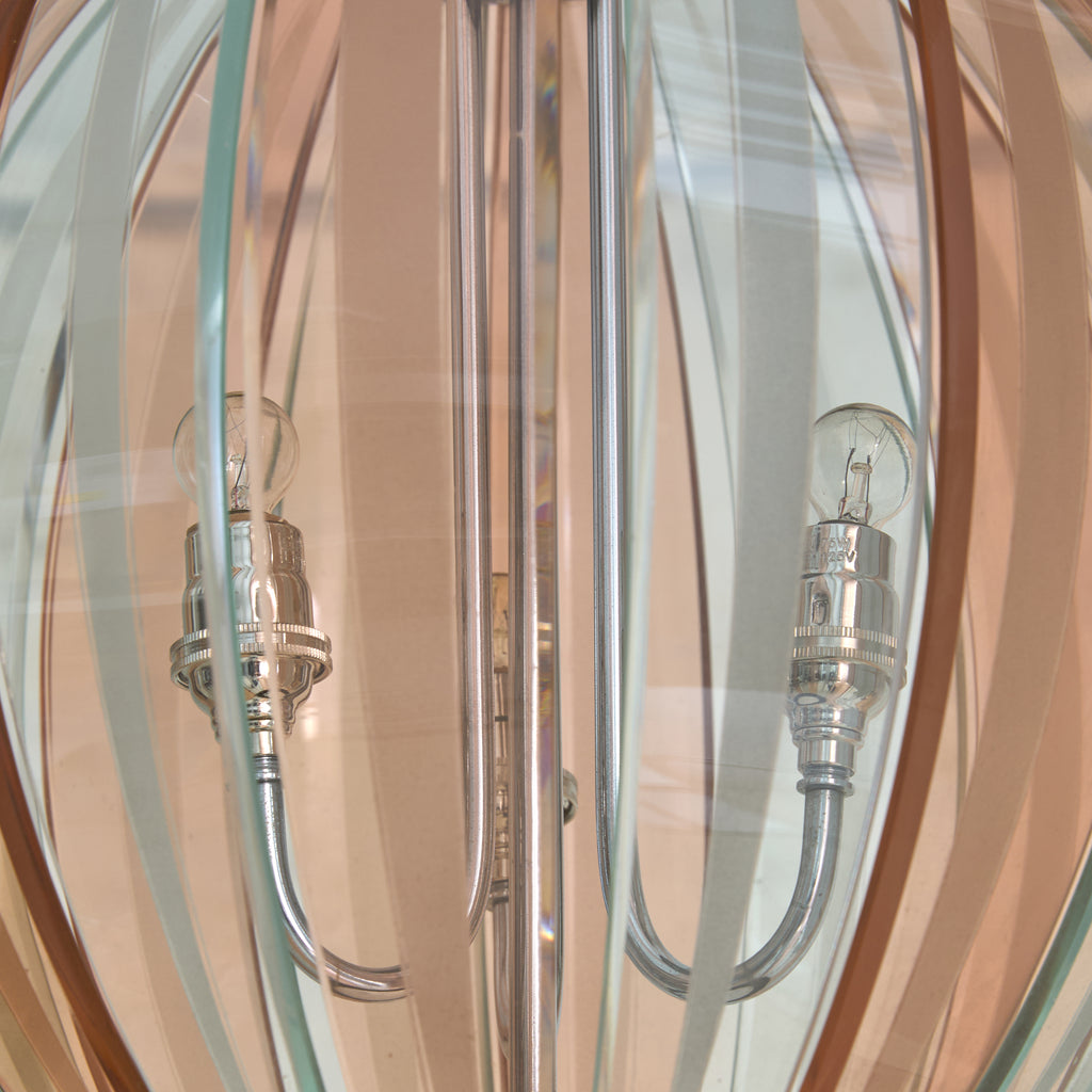 An Italian pendant from the 1970s, crafted in the manner of Veca. The lantern form is composed of alternating pink and transparent Murano glass, each gently curved and held in place by a silver-plated brass frame. The glass forms a rounded, ribbed silhouette—an airy globe measuring 12 inches in diameter.