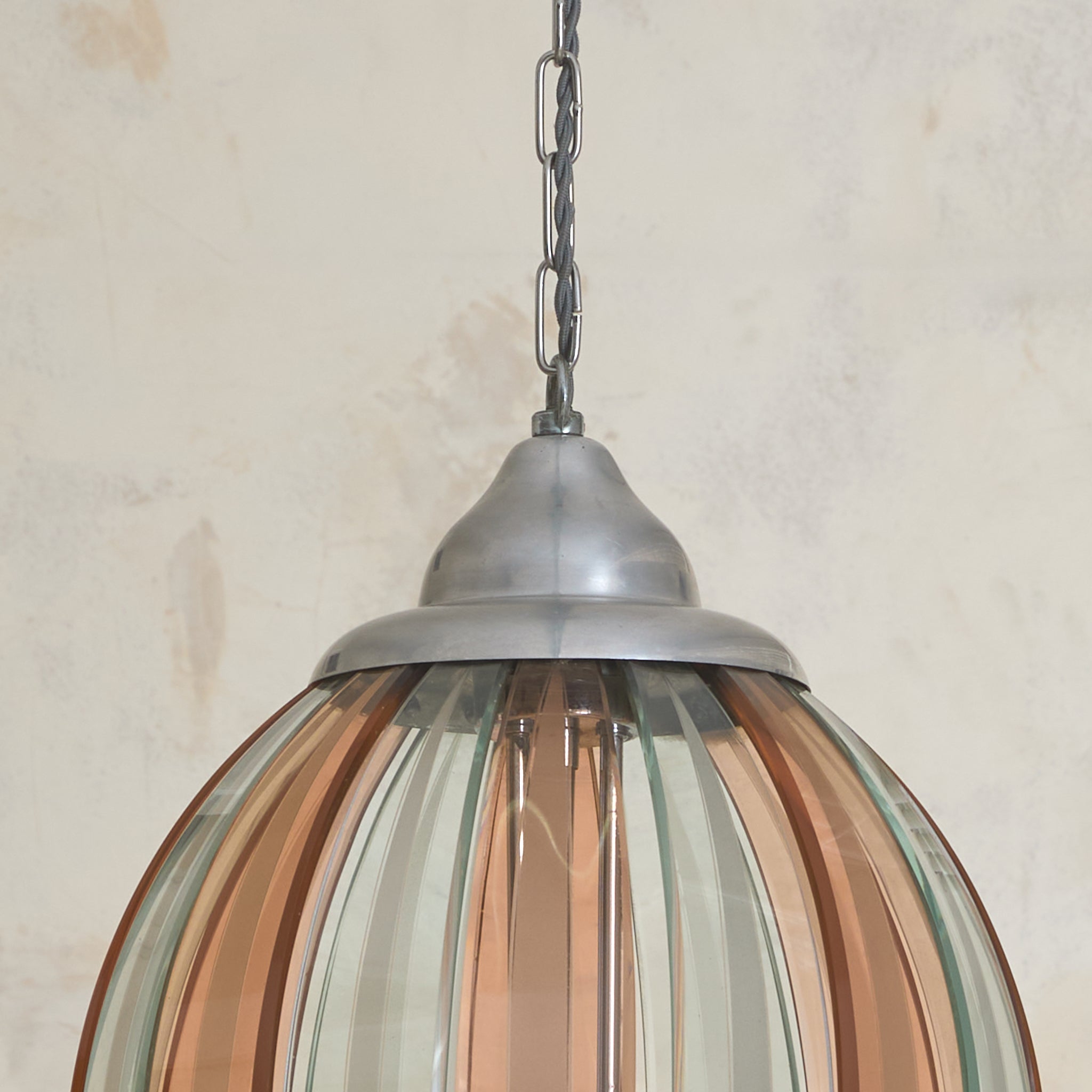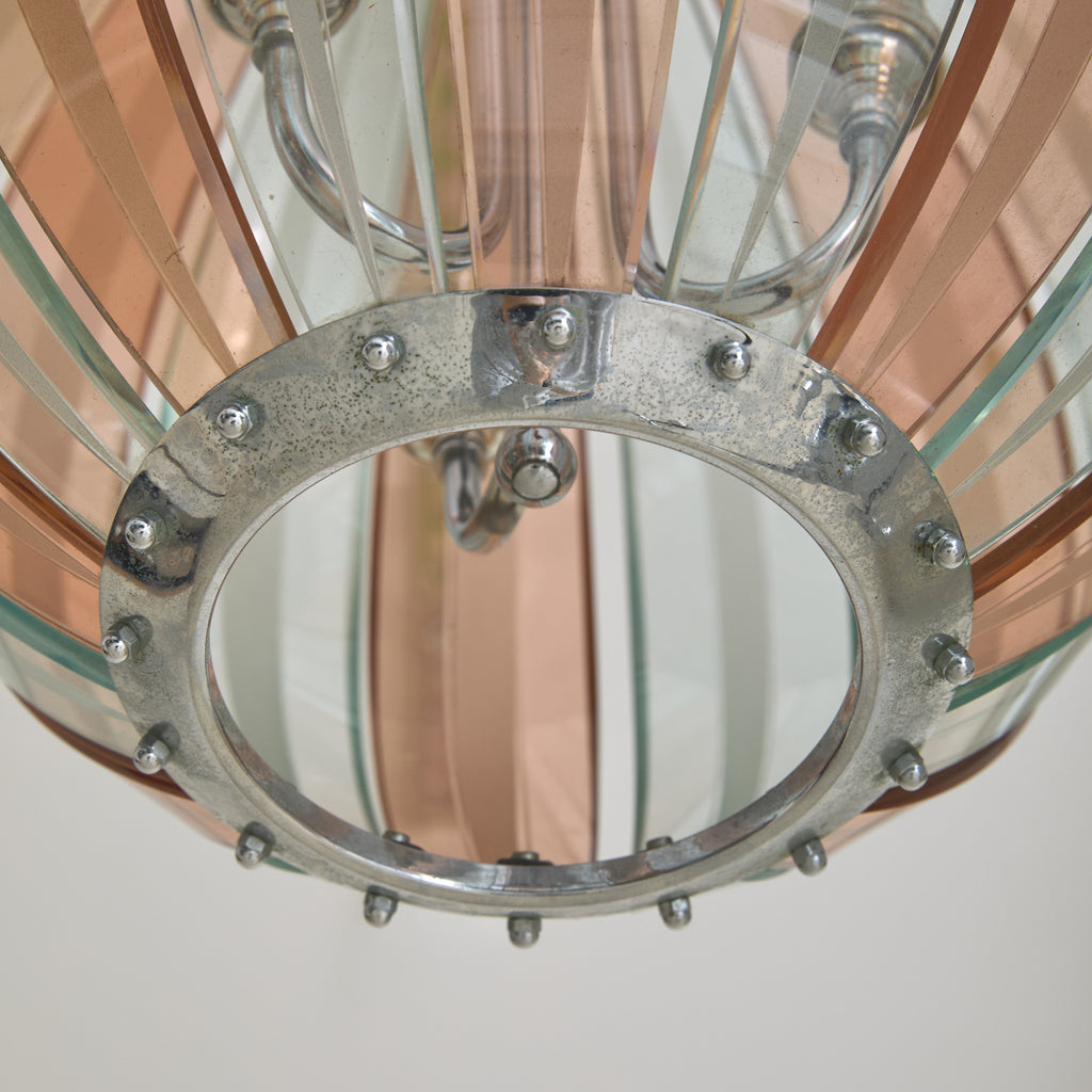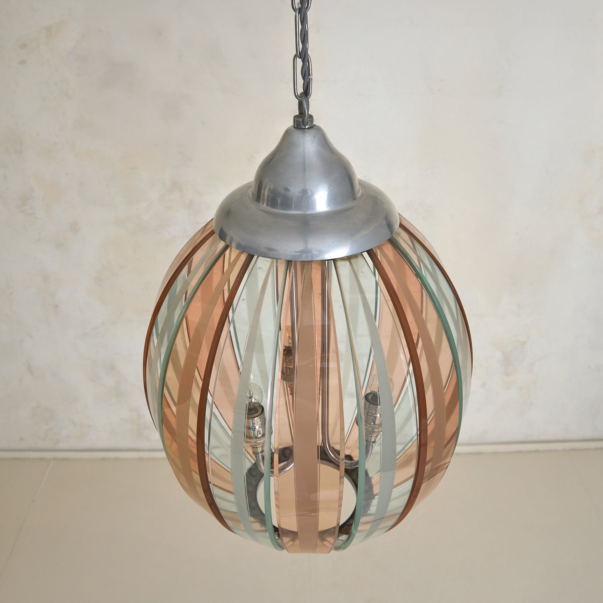An Italian pendant from the 1970s, crafted in the manner of Veca. The lantern form is composed of alternating pink and transparent Murano glass, each gently curved and held in place by a silver-plated brass frame. The glass forms a rounded, ribbed silhouette—an airy globe measuring 12 inches in diameter.
