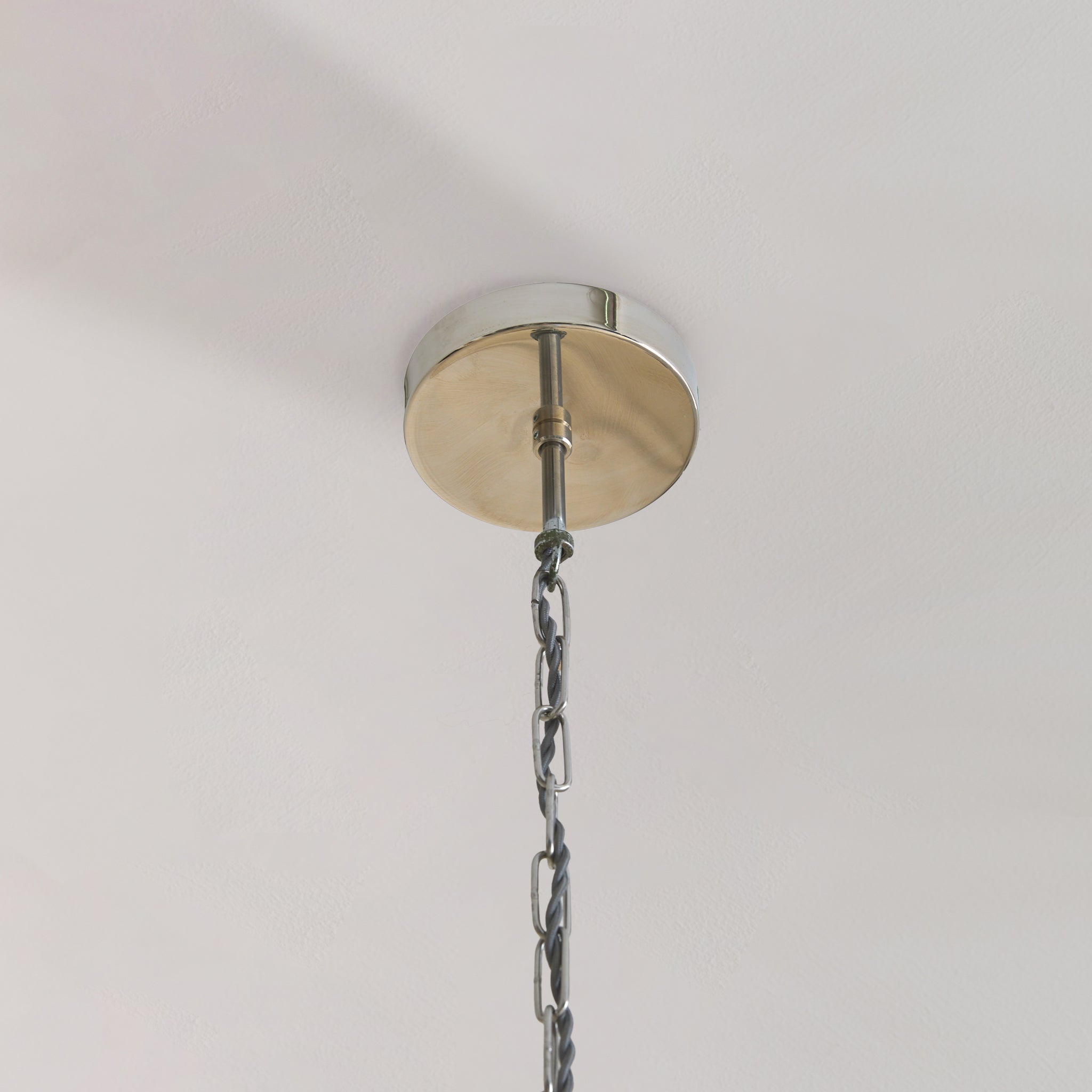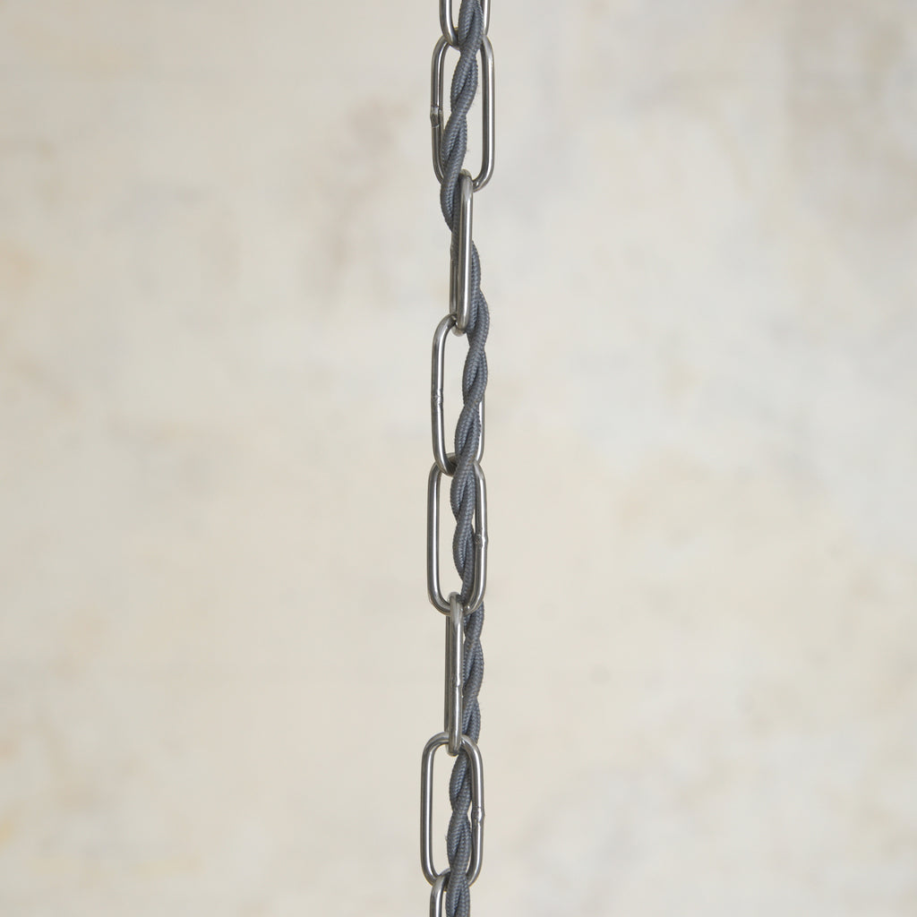 Inside, a trio of lights sits within a polished metal armature, their reflections multiplying softly across the tinted panels. A modernist statement pendant, ideal over an entryway, in a powder room, or illuminating a reading nook.
