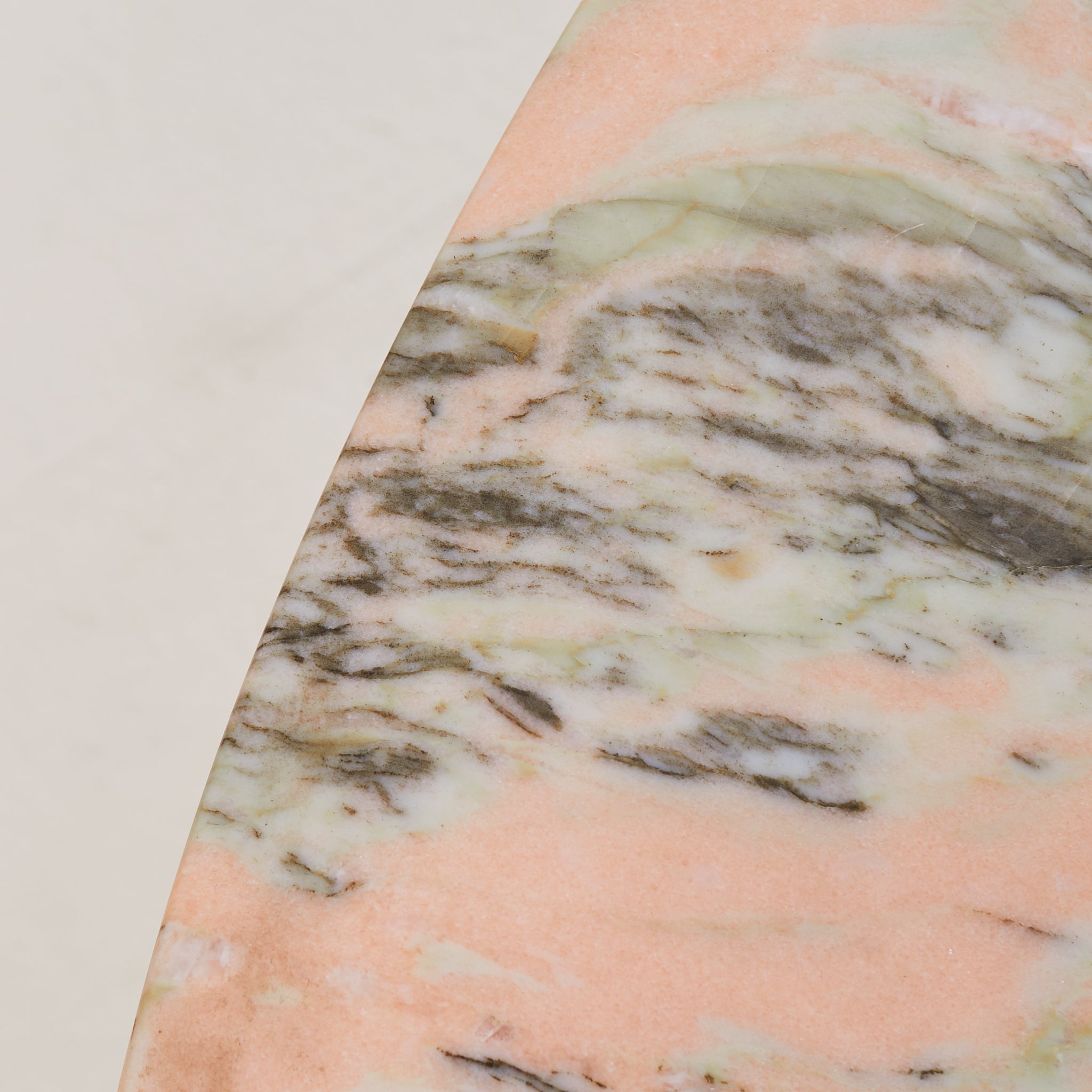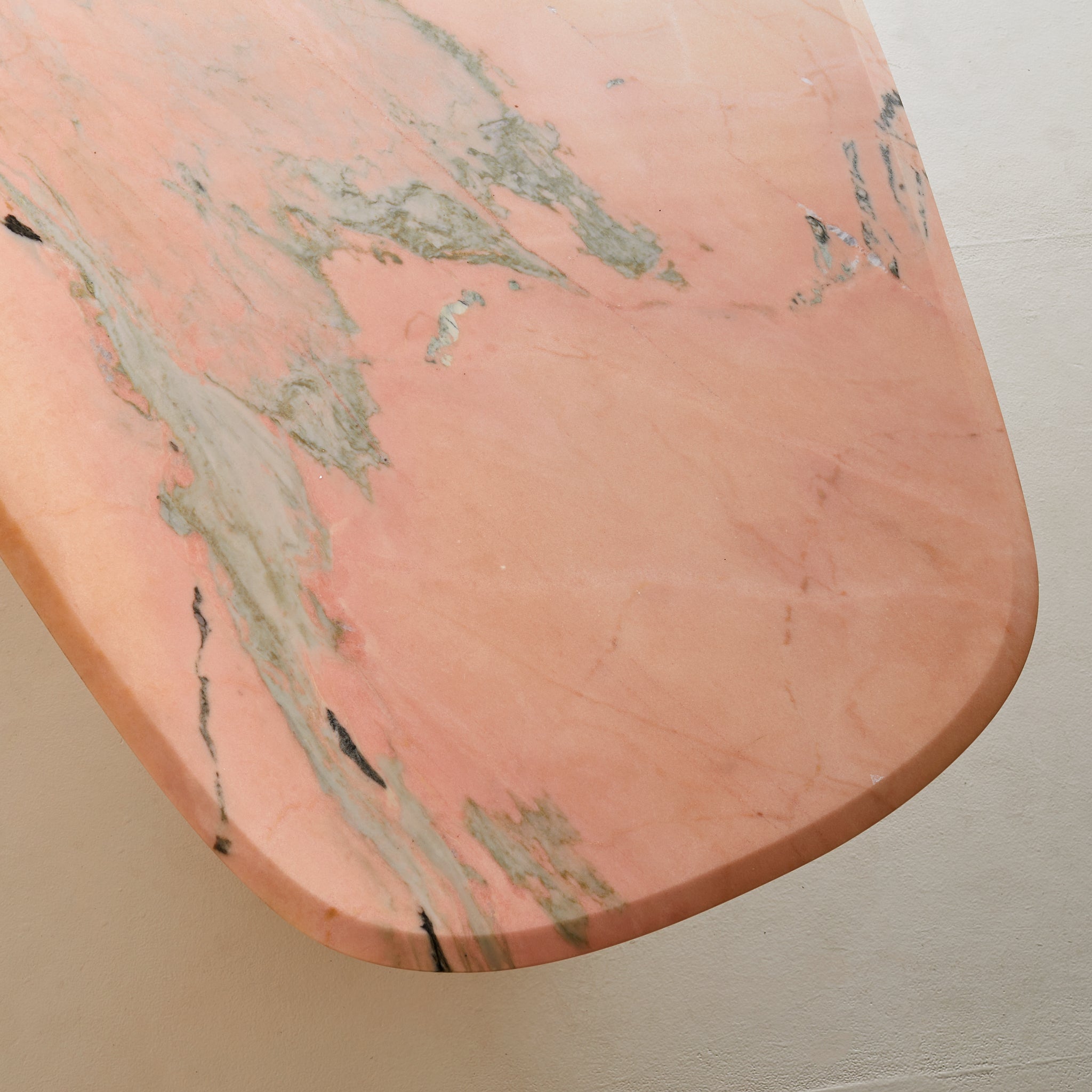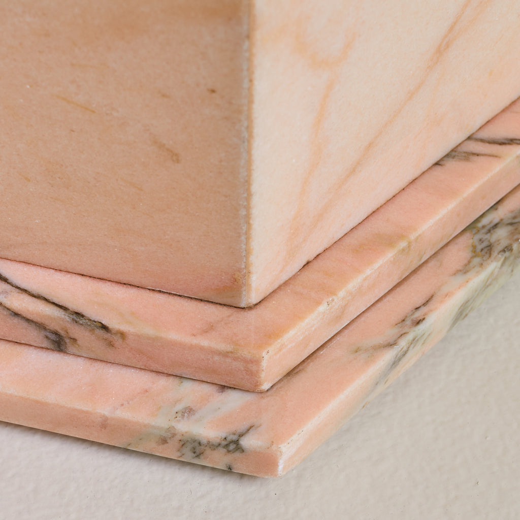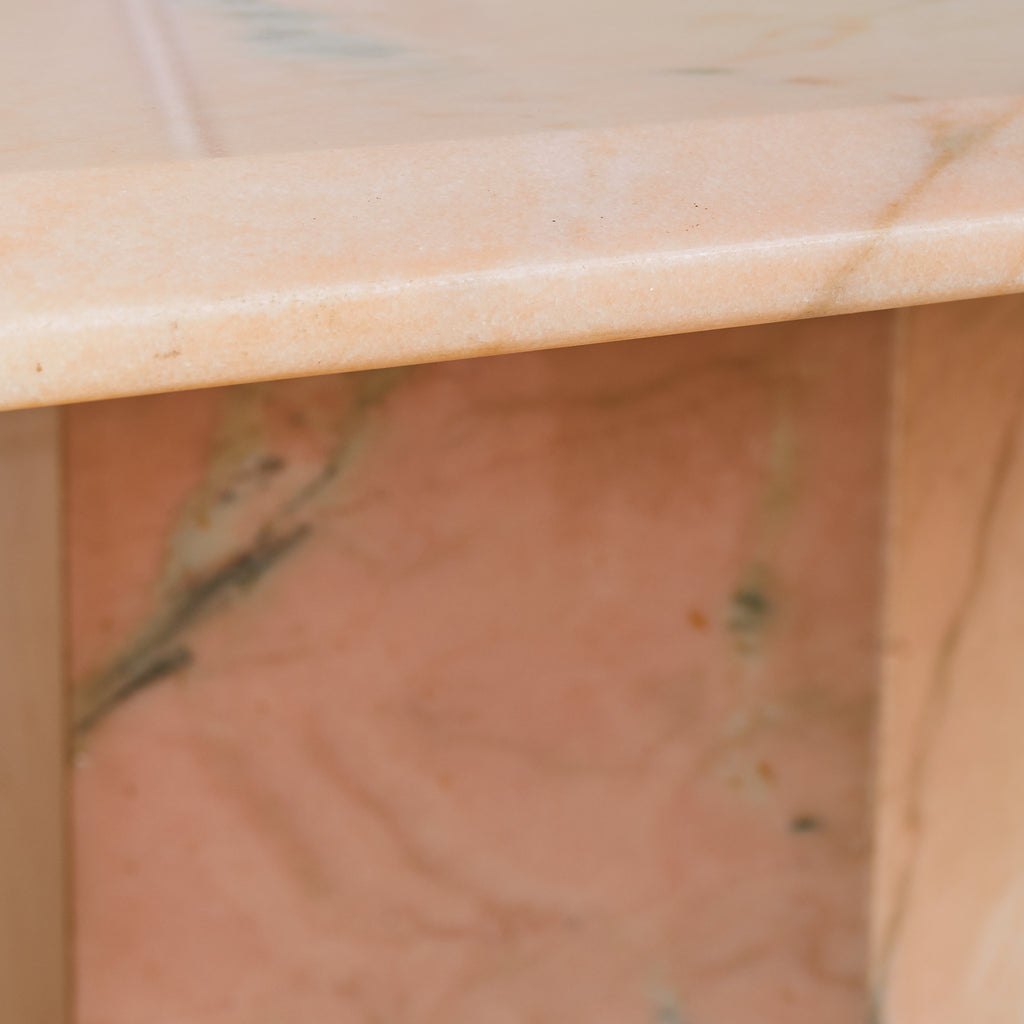 The edge is gently bullnosed—subtly curved and polished to a soft sheen—heightening the sense of mass while refining the silhouette. The twin pedestal bases are sharply geometric, with chamfered corners and stacked plinths that ground the composition with architectural clarity. Sculptural, sensual, and unmistakably Italian. A rare example of postmodern materiality meeting classical proportion.