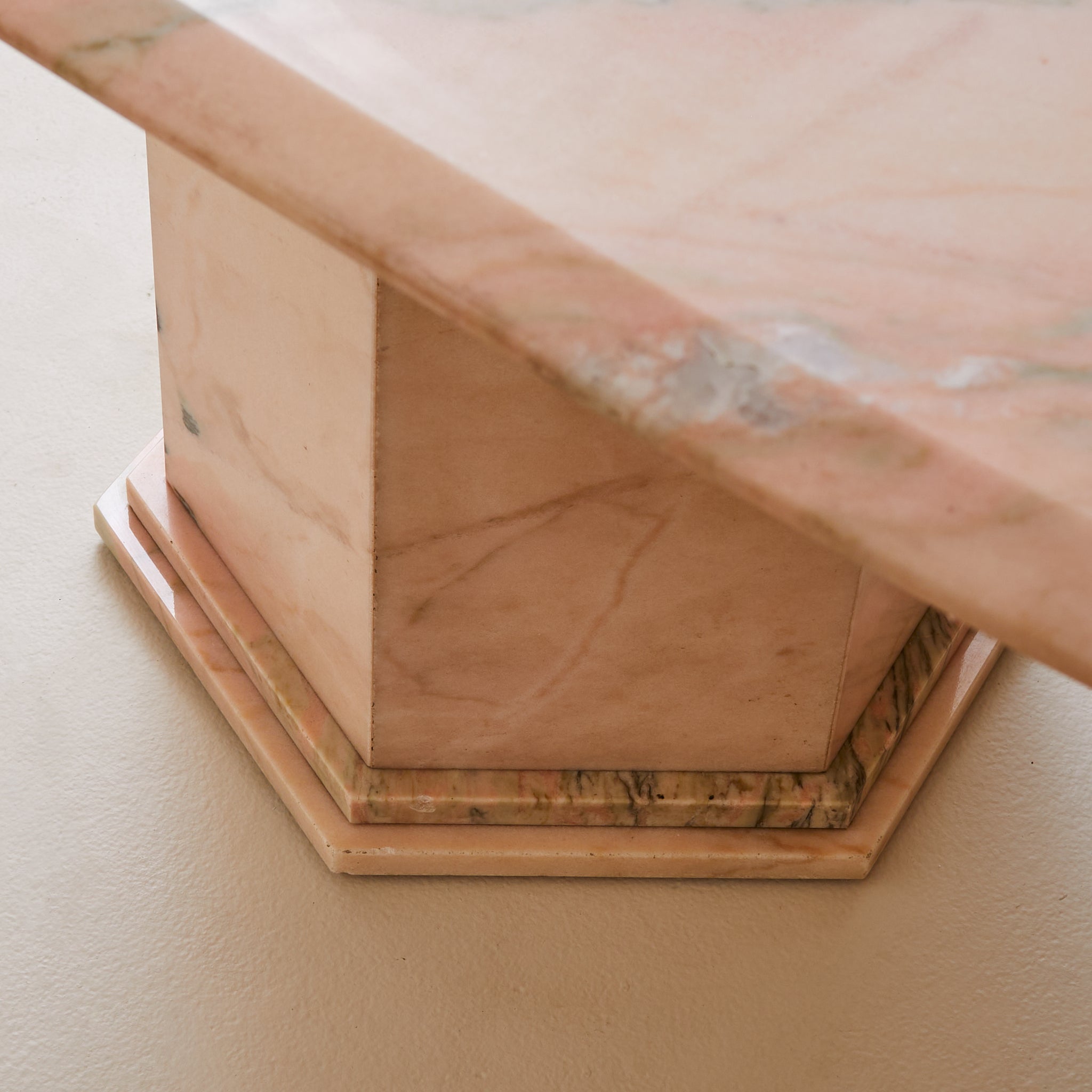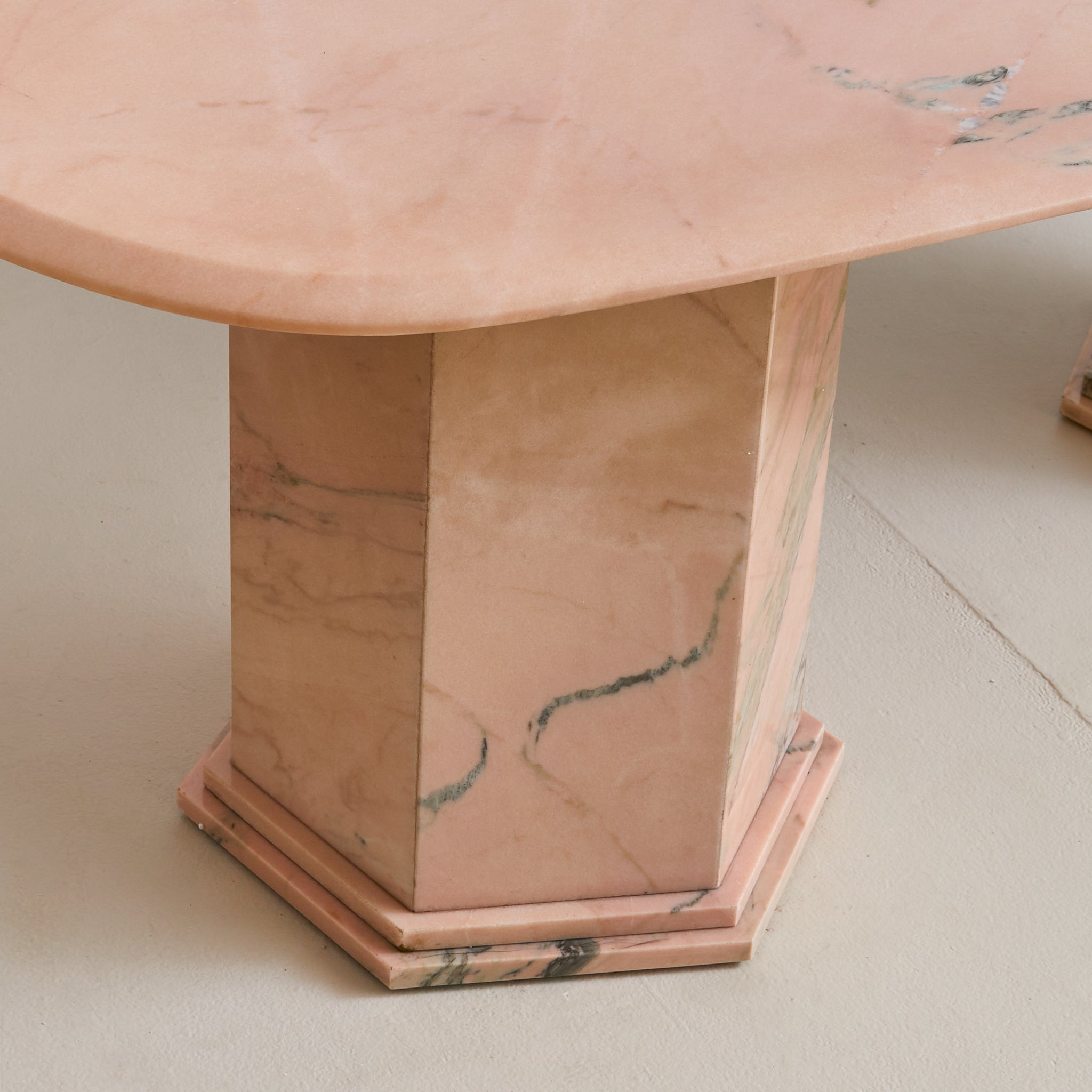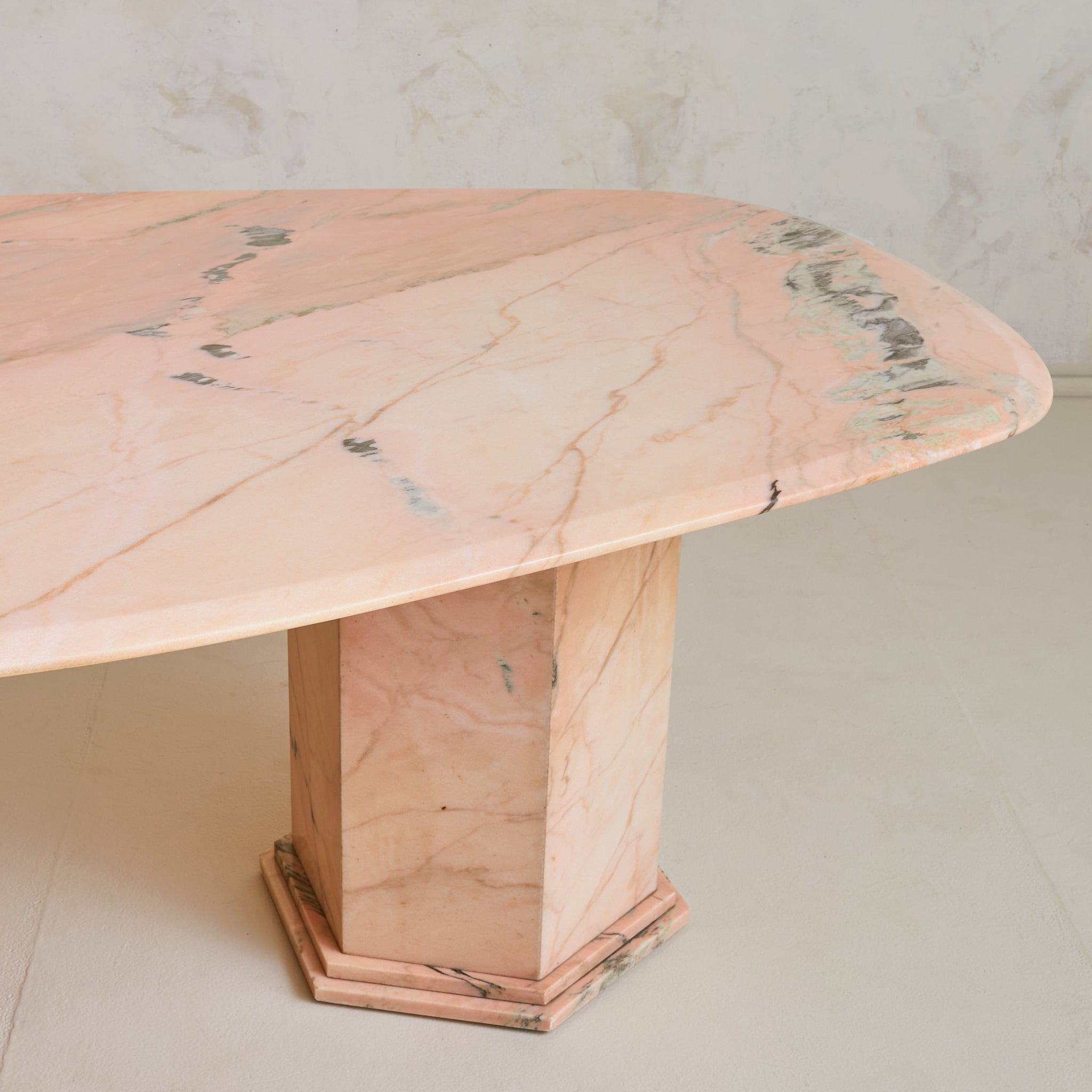 A 1970s Italian dining table carved from luminous pink Portuguese marble, its oblong top resting on two stepped hexagonal pedestals. The stone features a pale blush ground, punctuated by warm undertones and bold striations in moss green, smoke, and soft charcoal. Variations in density and translucence give the surface a painterly depth, with natural lines running across the top like brushstrokes on canvas.