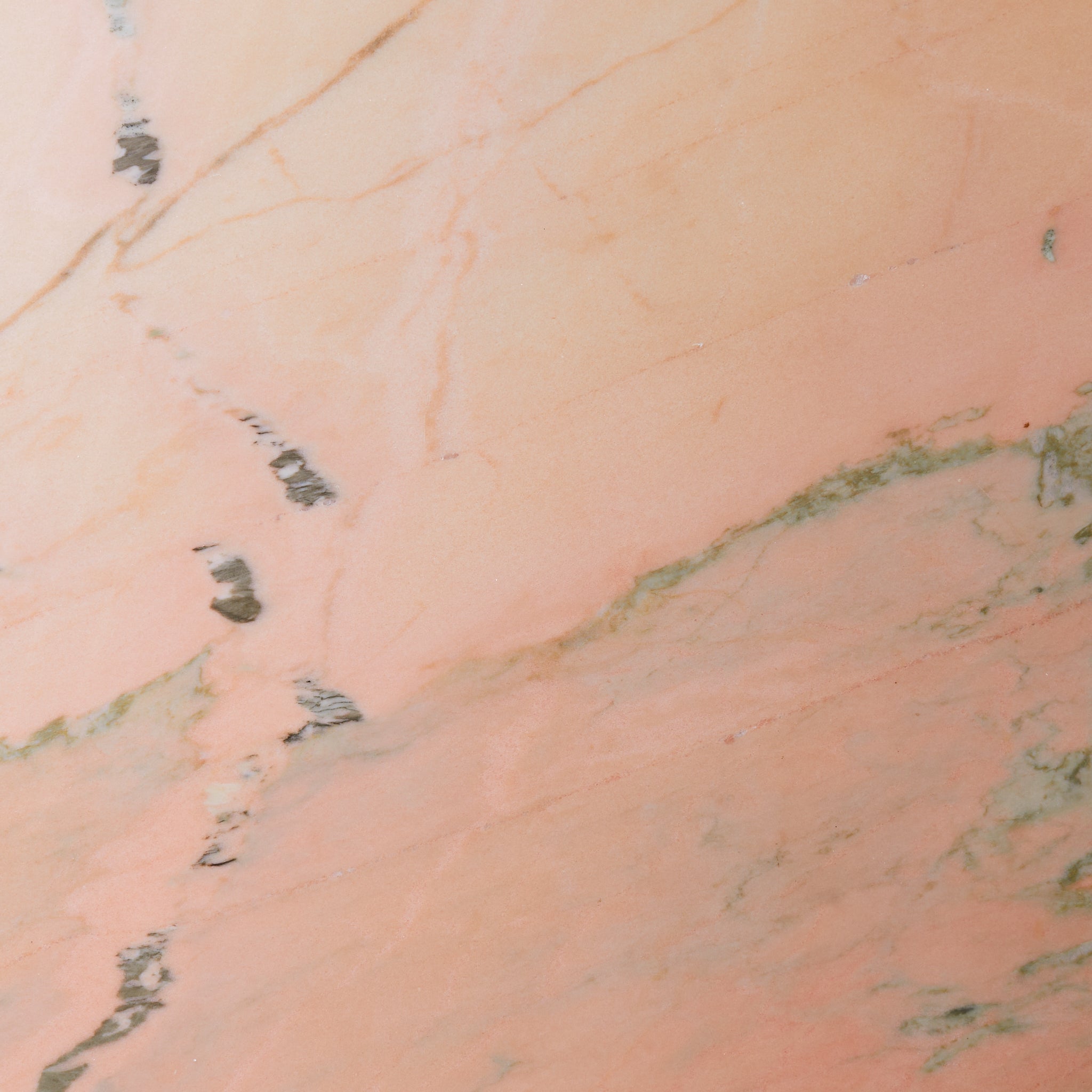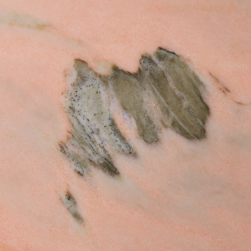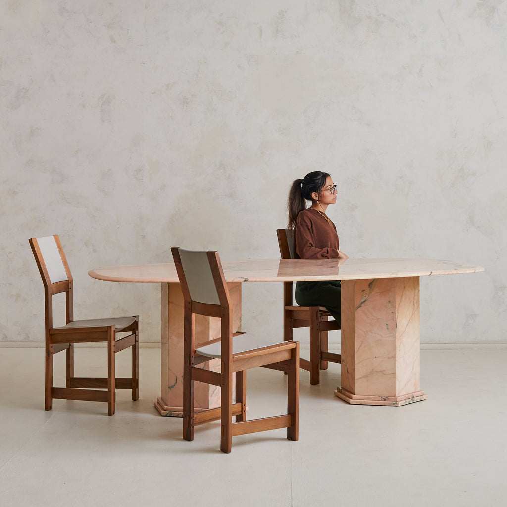 A 1970s Italian dining table carved from luminous pink Portuguese marble, its oblong top resting on two stepped hexagonal pedestals. The stone features a pale blush ground, punctuated by warm undertones and bold striations in moss green, smoke, and soft charcoal. Variations in density and translucence give the surface a painterly depth, with natural lines running across the top like brushstrokes on canvas.