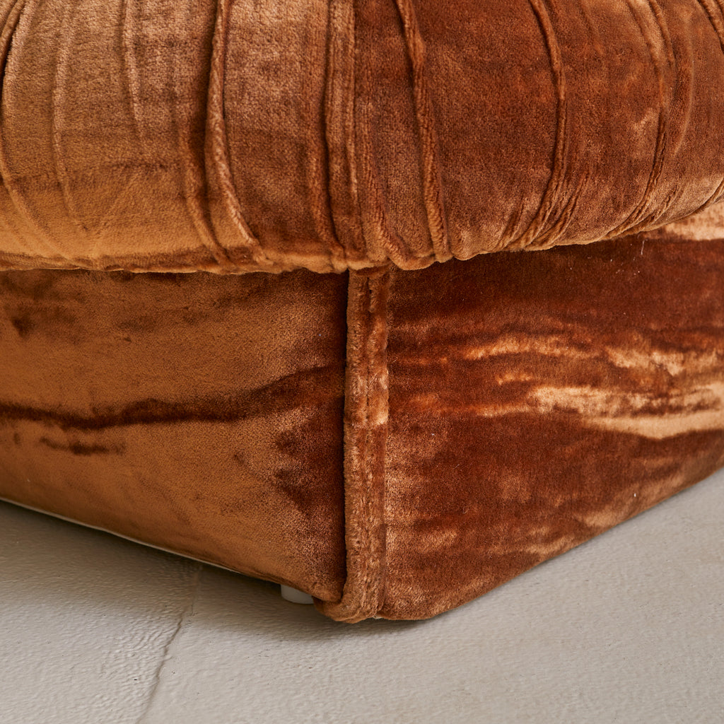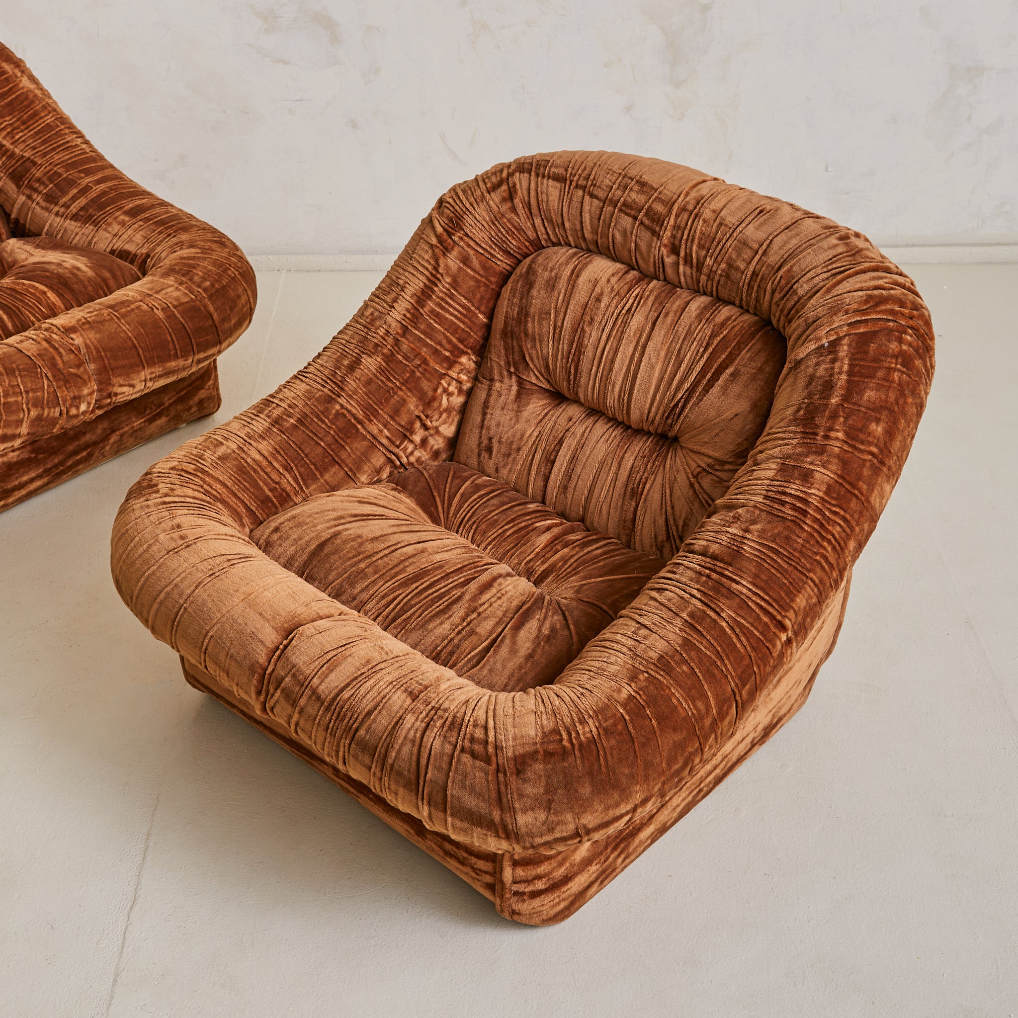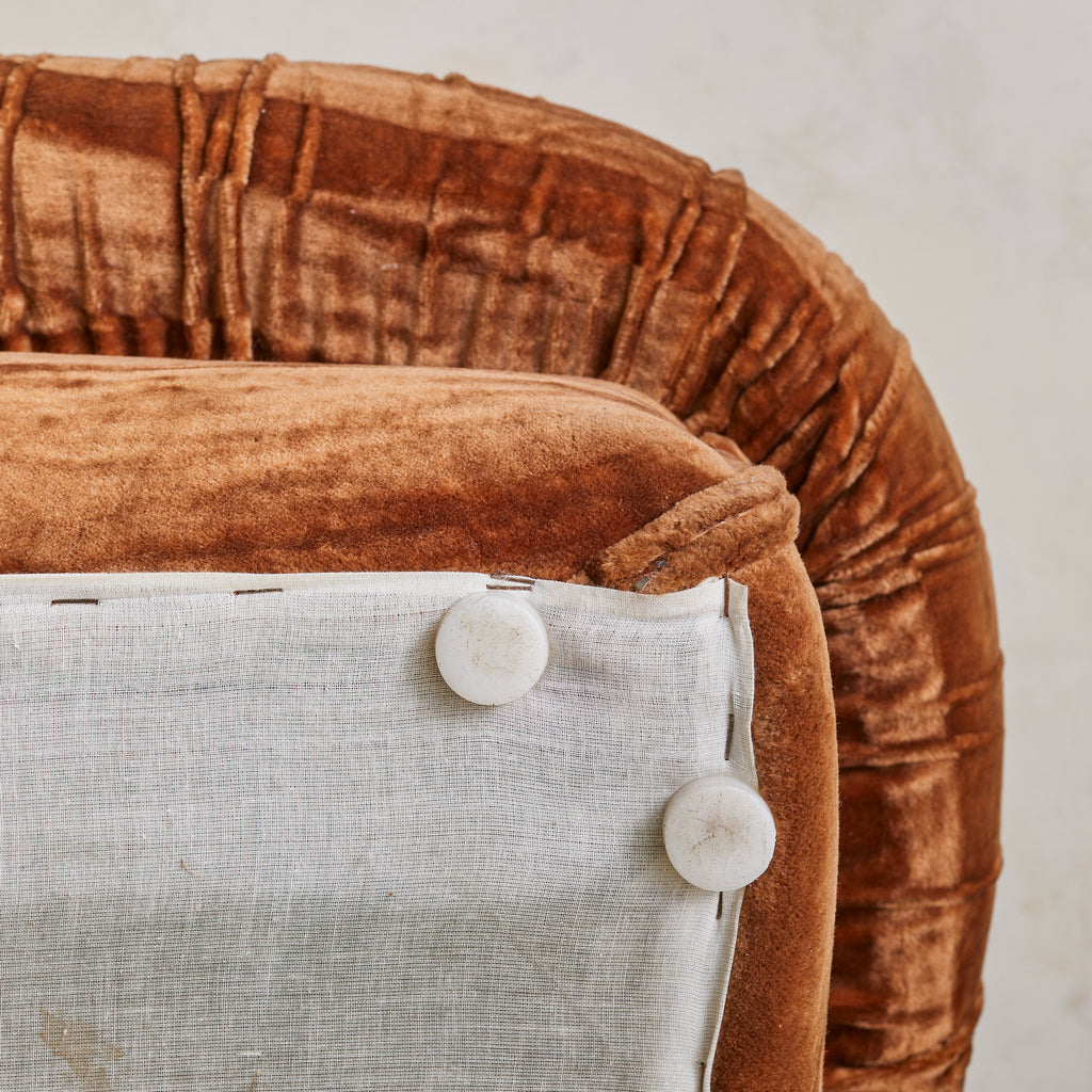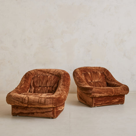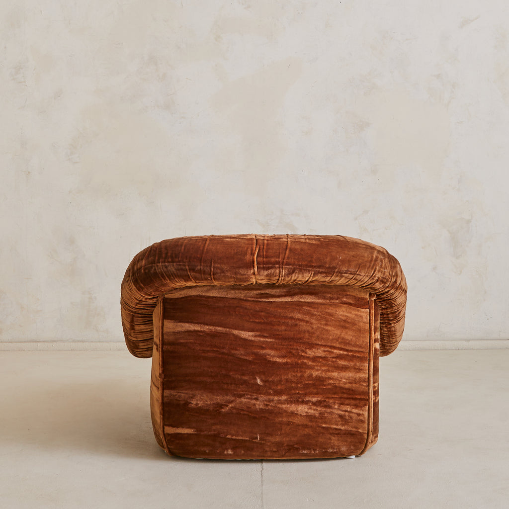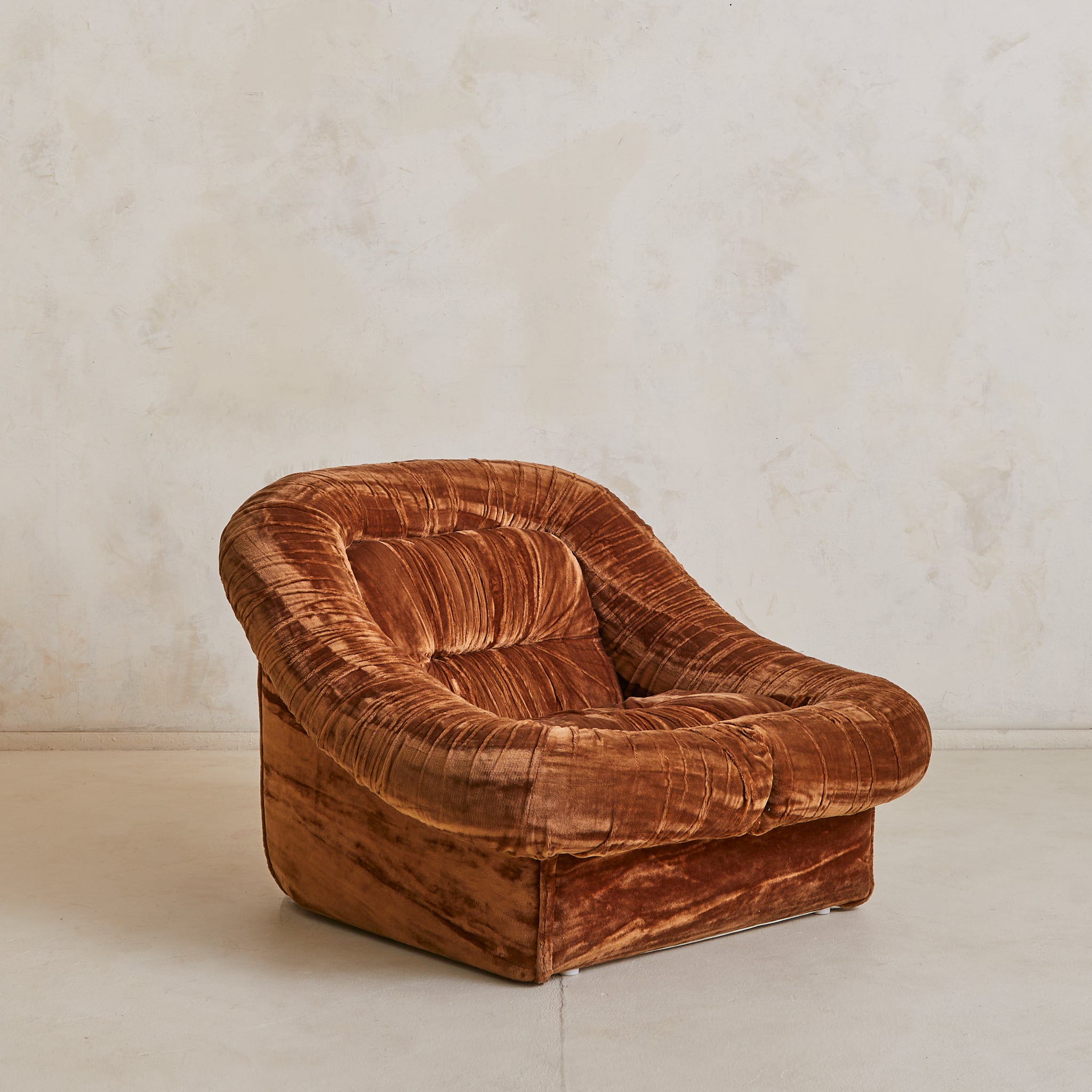 A 1970s Italian lounge chair in the manner of Jonathan De Pas, Donato D’Urbino, and Paolo Lomazzi. Upholstered in a rich sepia-hued velvet, the form is defined by deeply pleated, ruched upholstery, creating a tactile landscape of folds and contours that invite both touch and repose.
