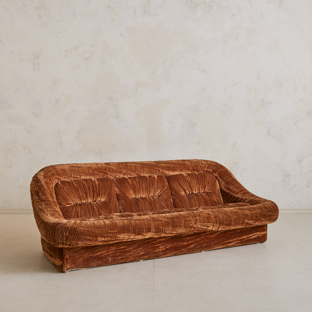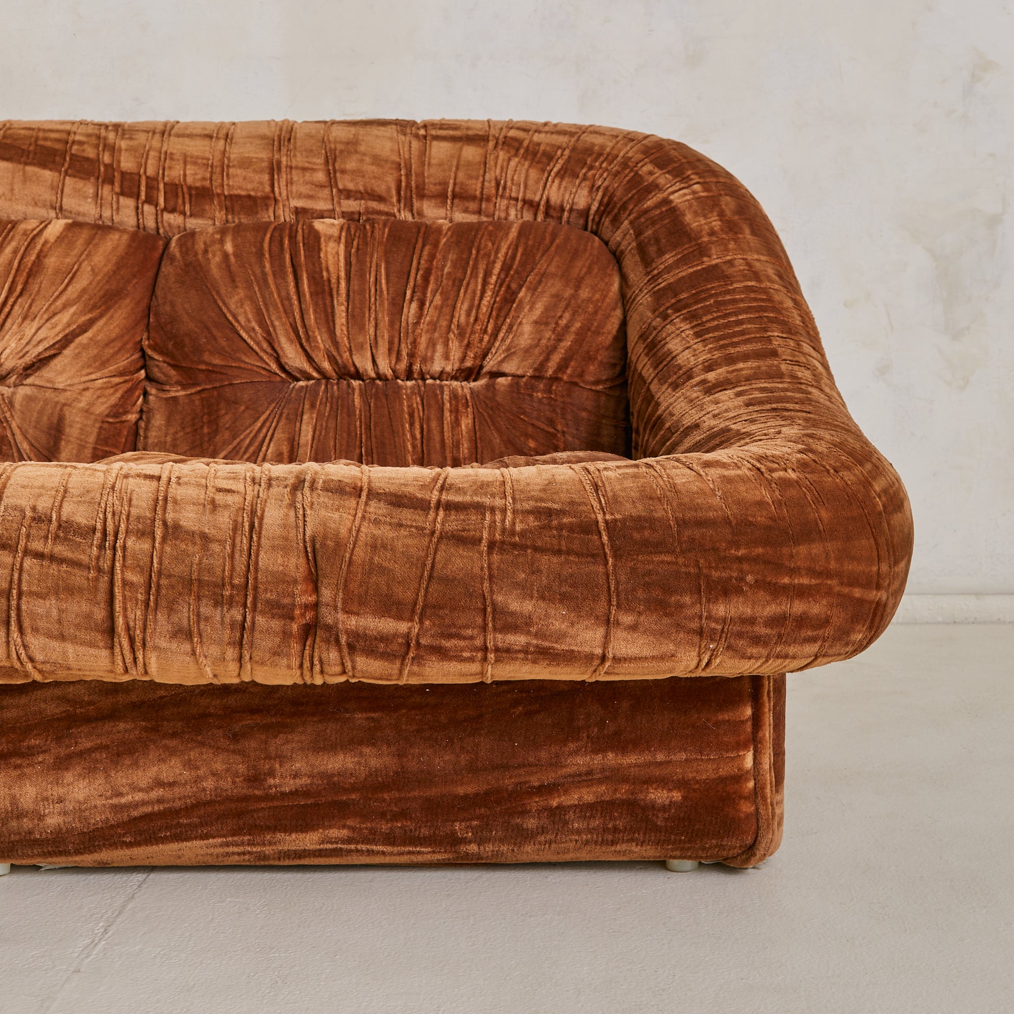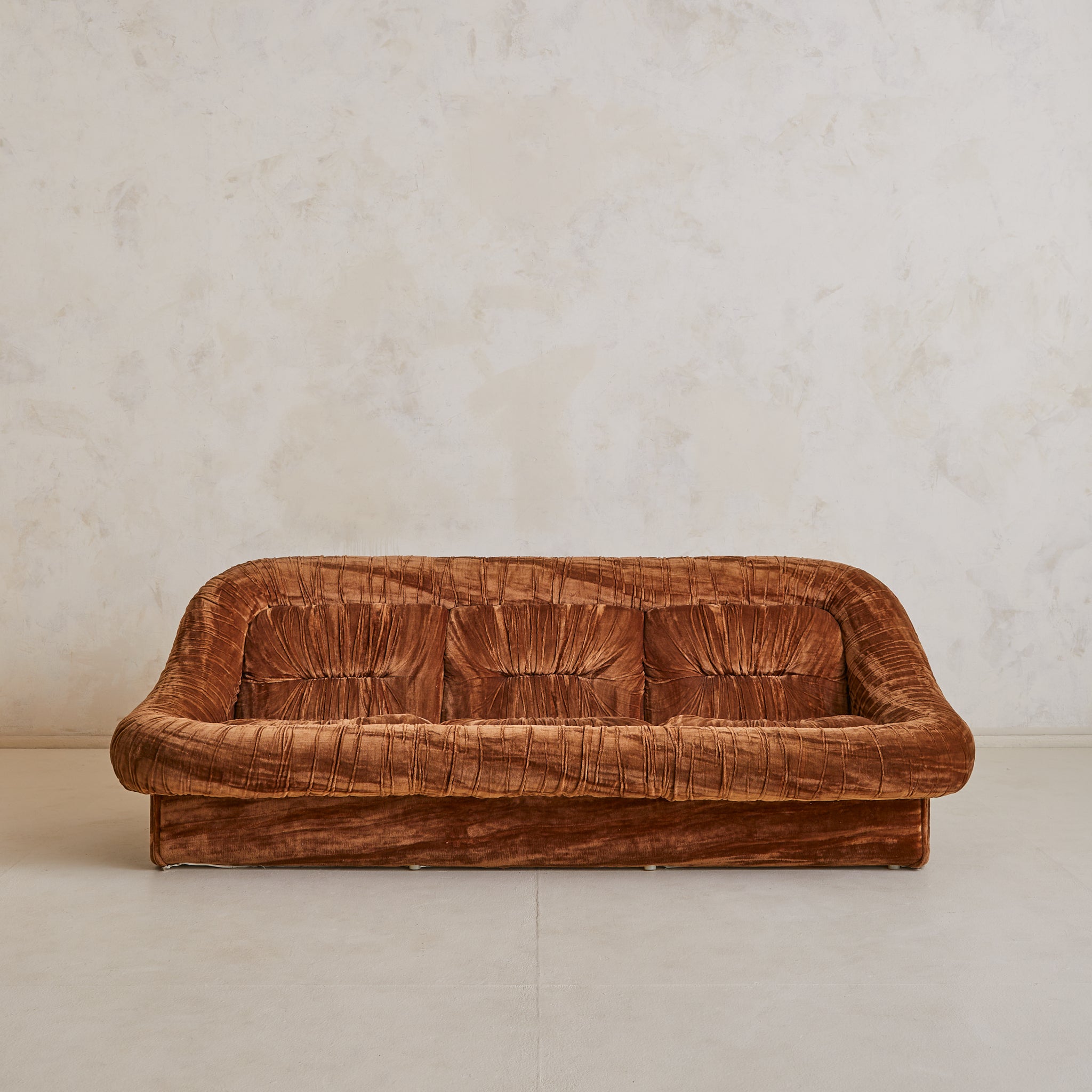A 1970s Italian sofa in the manner of Jonathan De Pas, Donato D’Urbino, and Paolo Lomazzi. Upholstered in a rich sepia-hued velvet, the form is defined by deeply pleated, ruched upholstery, creating a tactile landscape of folds and contours that invite both touch and repose.