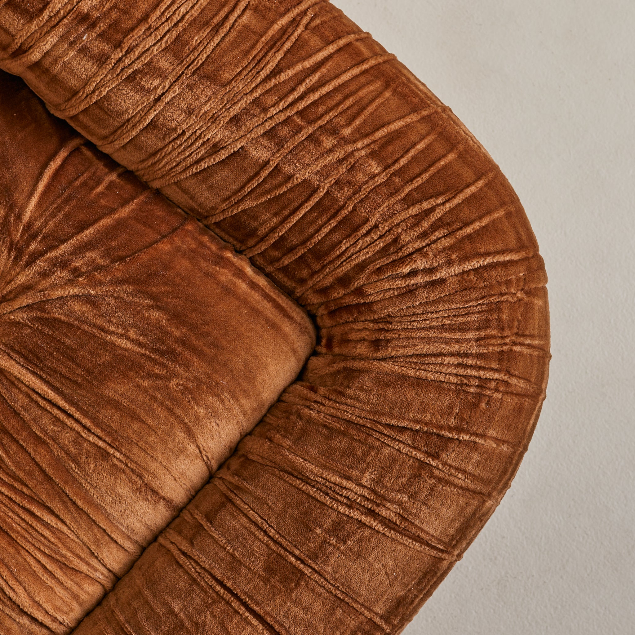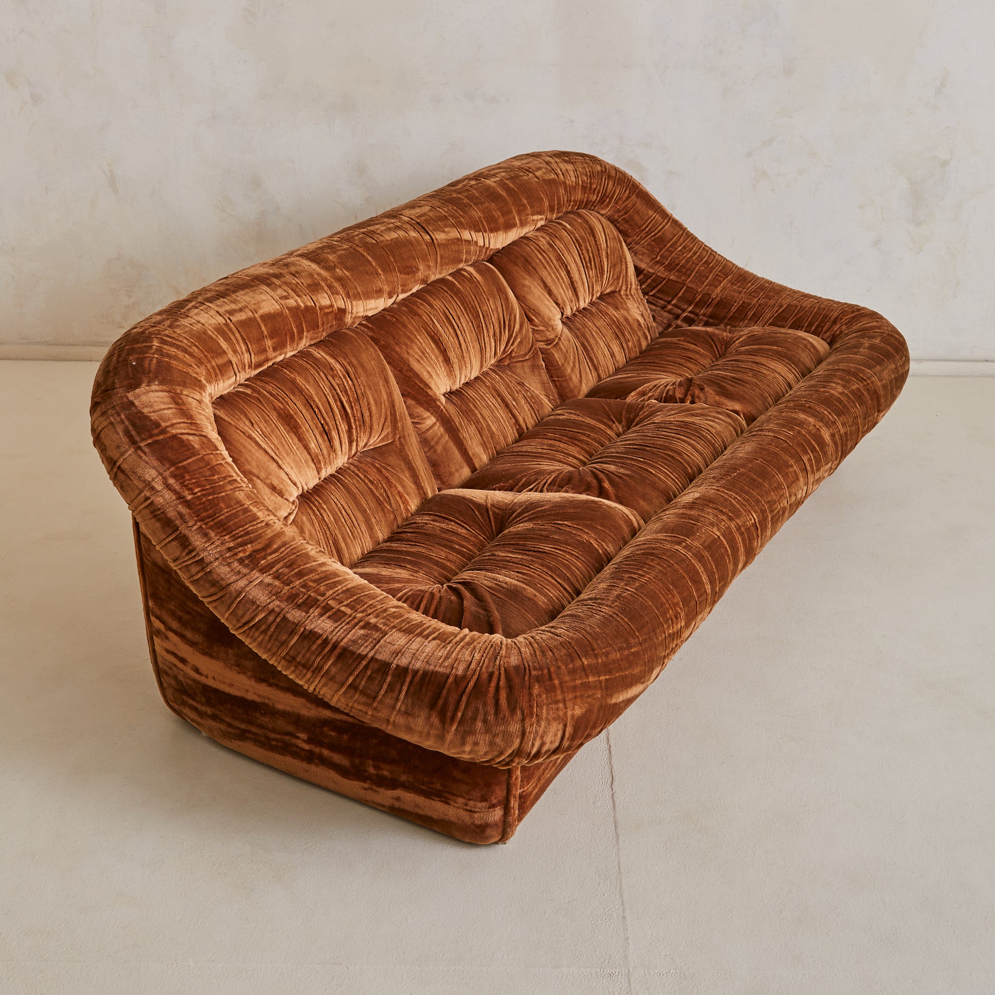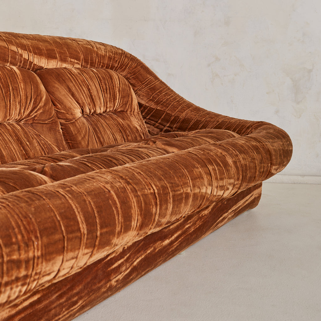 A 1970s Italian sofa in the manner of Jonathan De Pas, Donato D’Urbino, and Paolo Lomazzi. Upholstered in a rich sepia-hued velvet, the form is defined by deeply pleated, ruched upholstery, creating a tactile landscape of folds and contours that invite both touch and repose.
