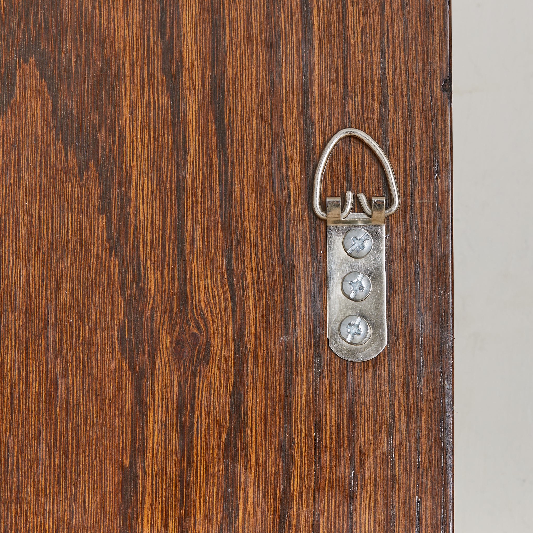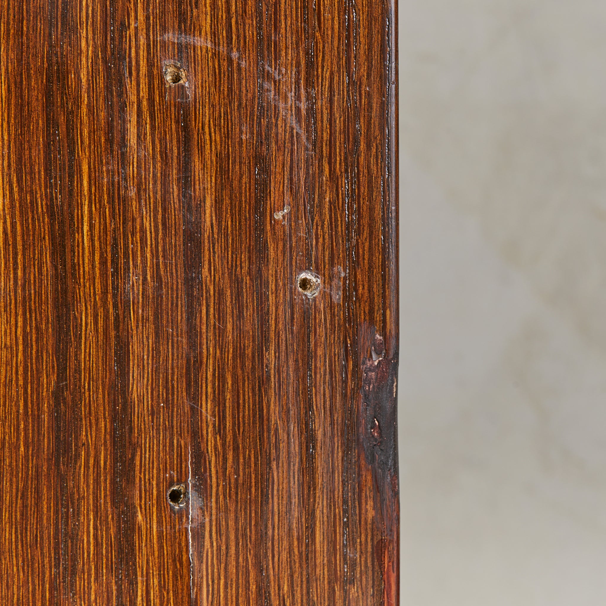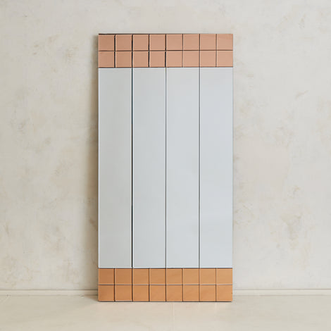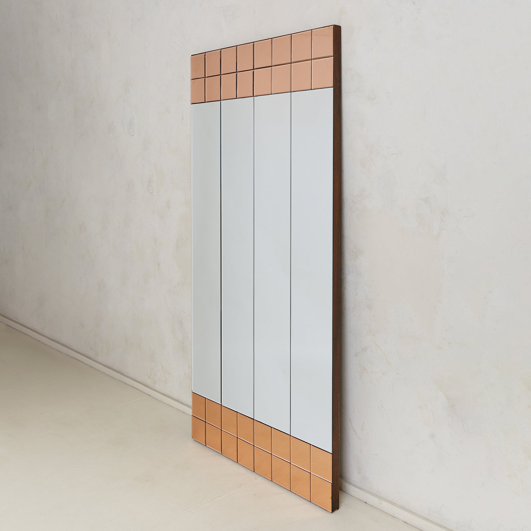 An Italian floor-length mirror from the 1970s, sheathed in rose gold mirrored tiles. Over six feet tall, the towering form is paneled in vertical mirrored strips flanked by a grid of warm, coppery rose glass. The beveled edges catch light like cut crystal—geometric and gleaming—while a wood backing anchors the mirror.