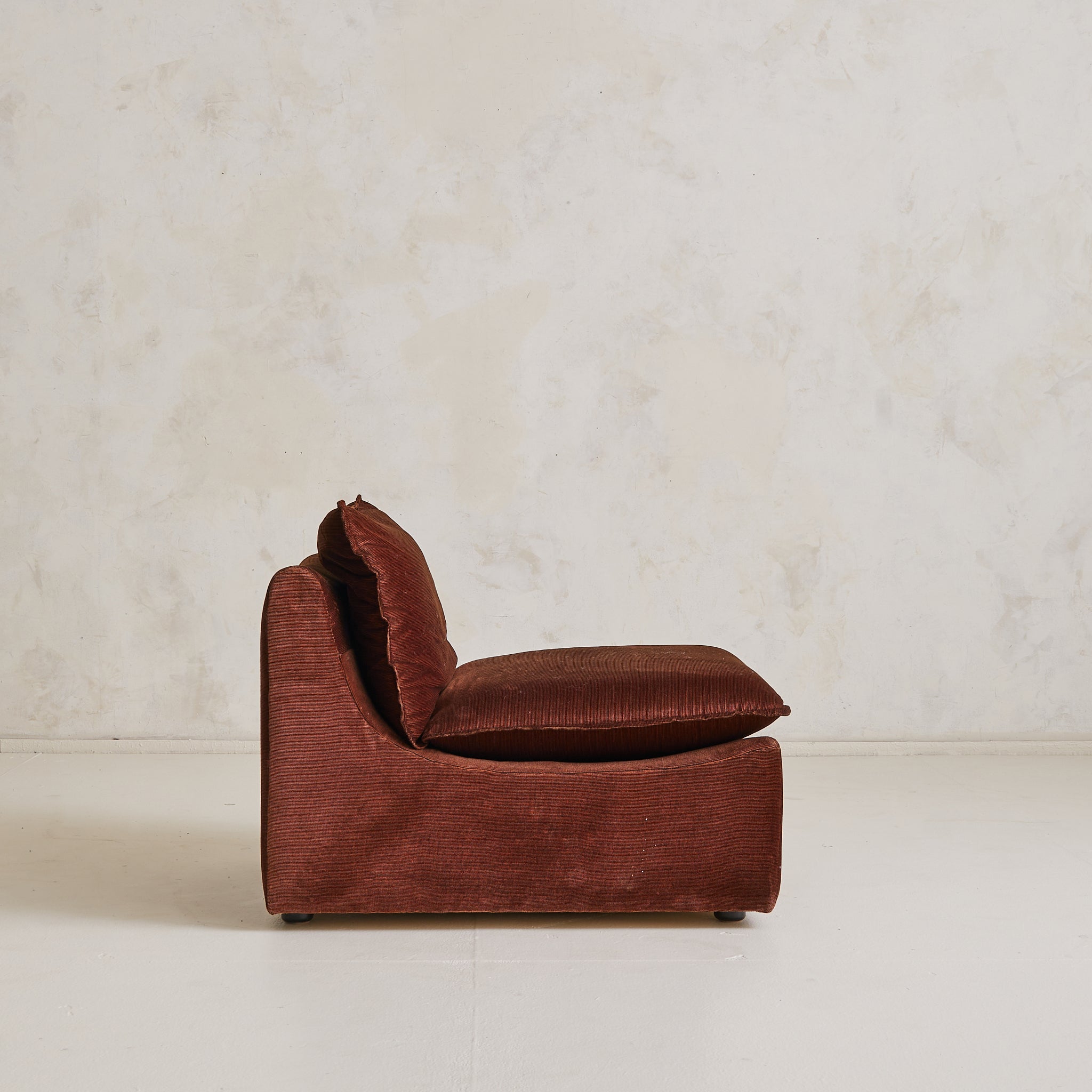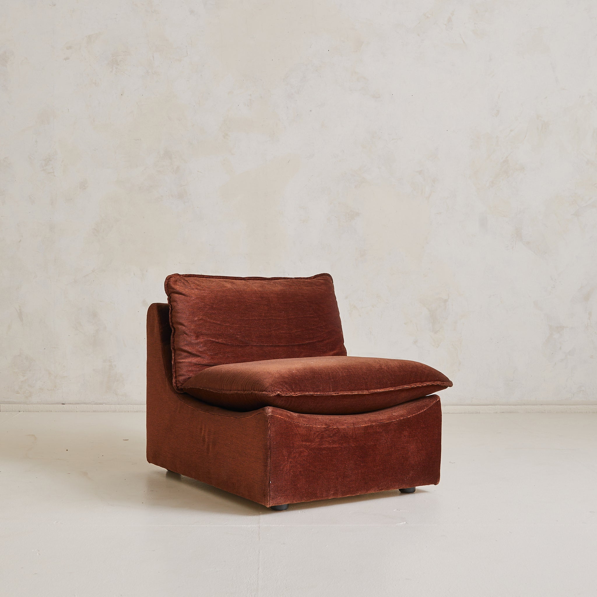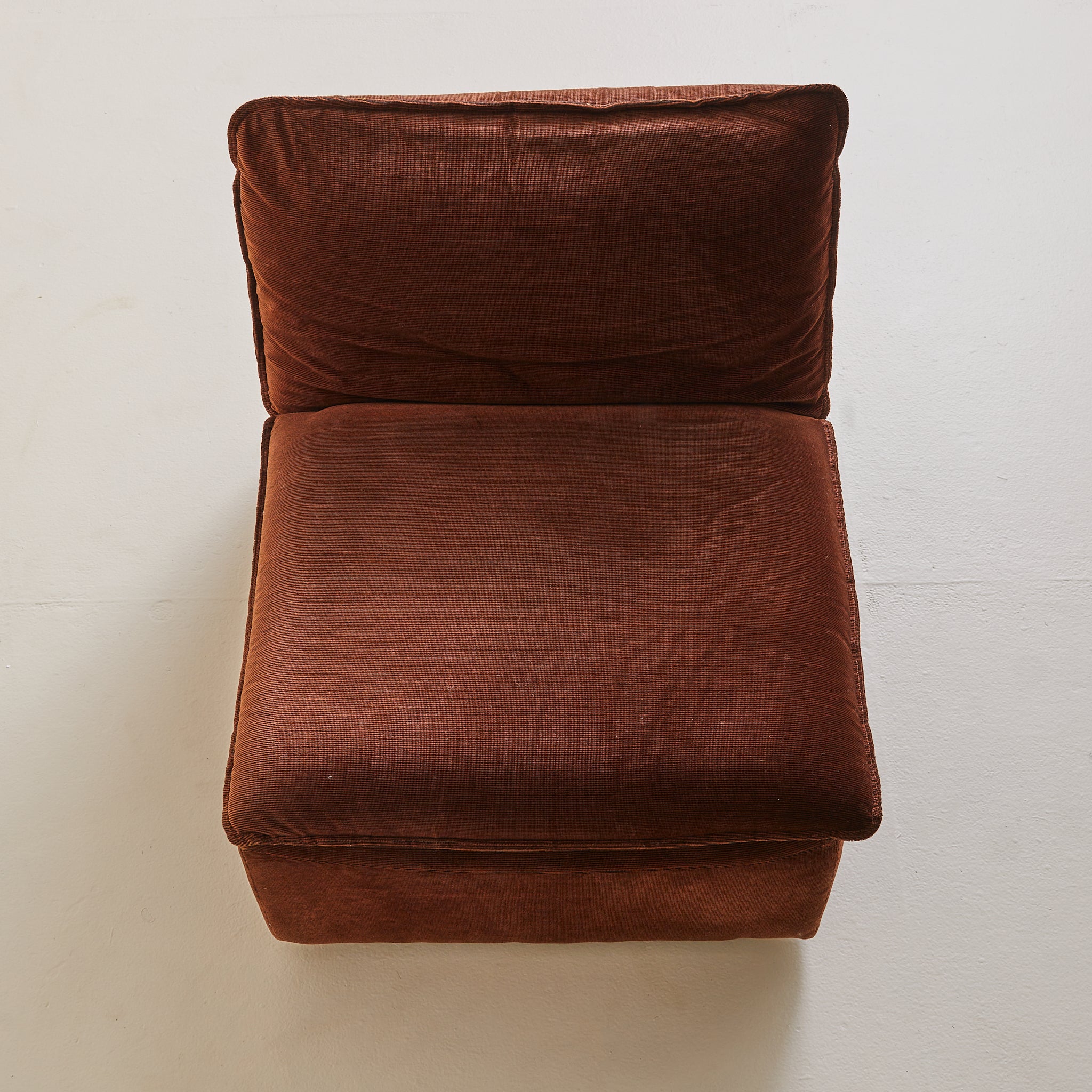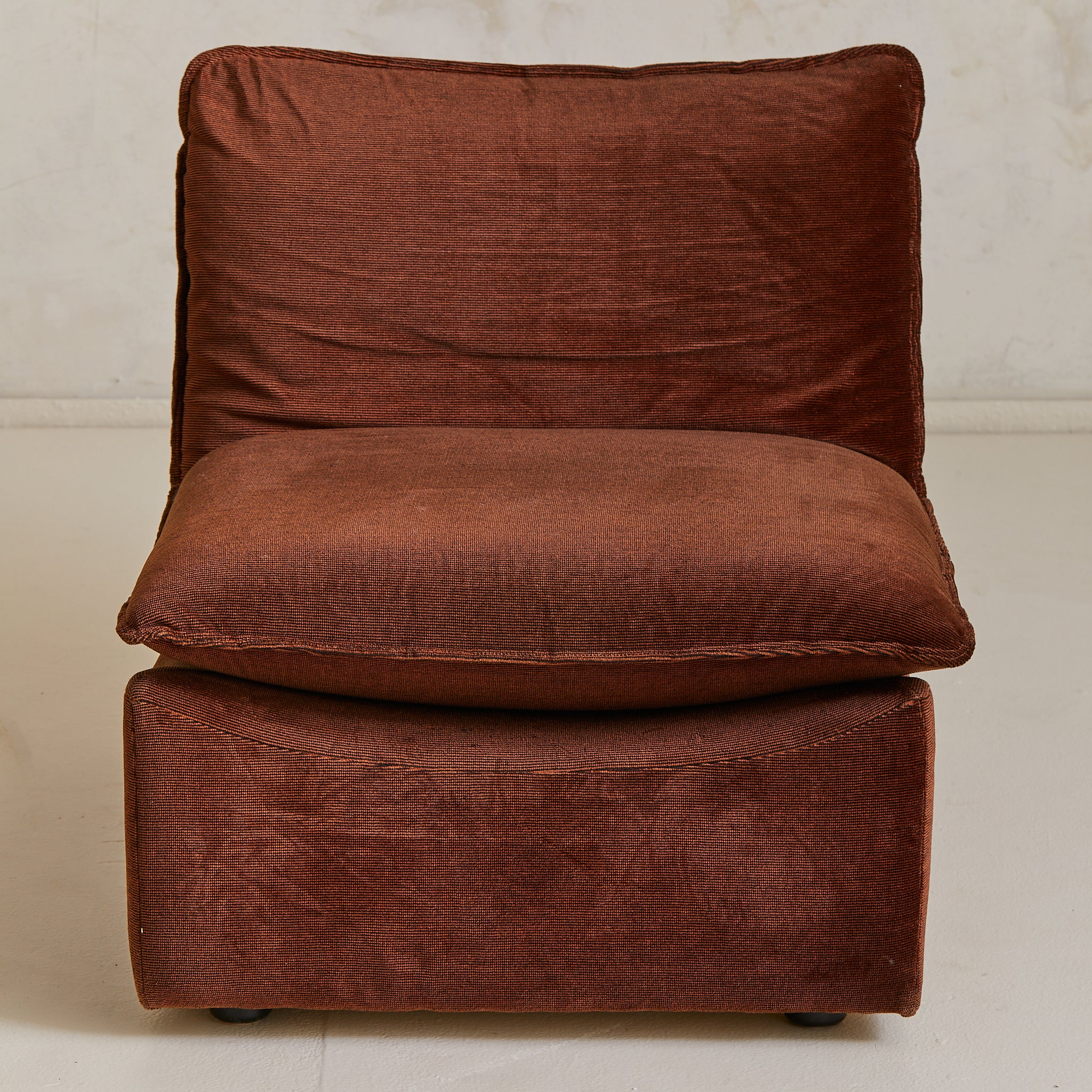 A 1970s Italian lounge chair with deep, low-slung proportions and soft corduroy upholstery in rust brown. The sculptural silhouette rises and dips in a single gesture—structured yet yielding. Plush down cushions rest atop a suspended sling, anchored by metal hooks and rings hidden just below the surface. Subtly elevated on rounded black acrylic feet.