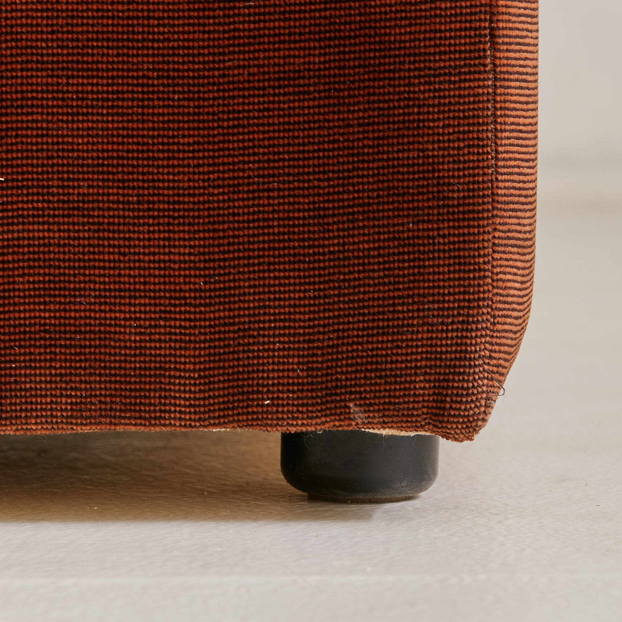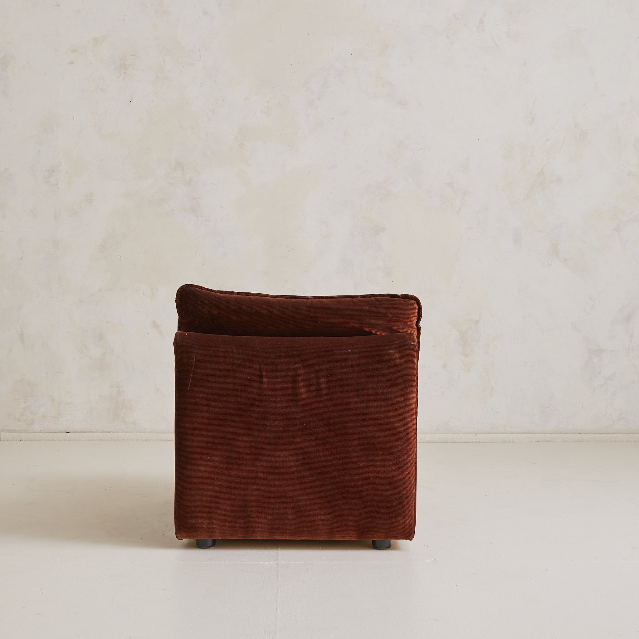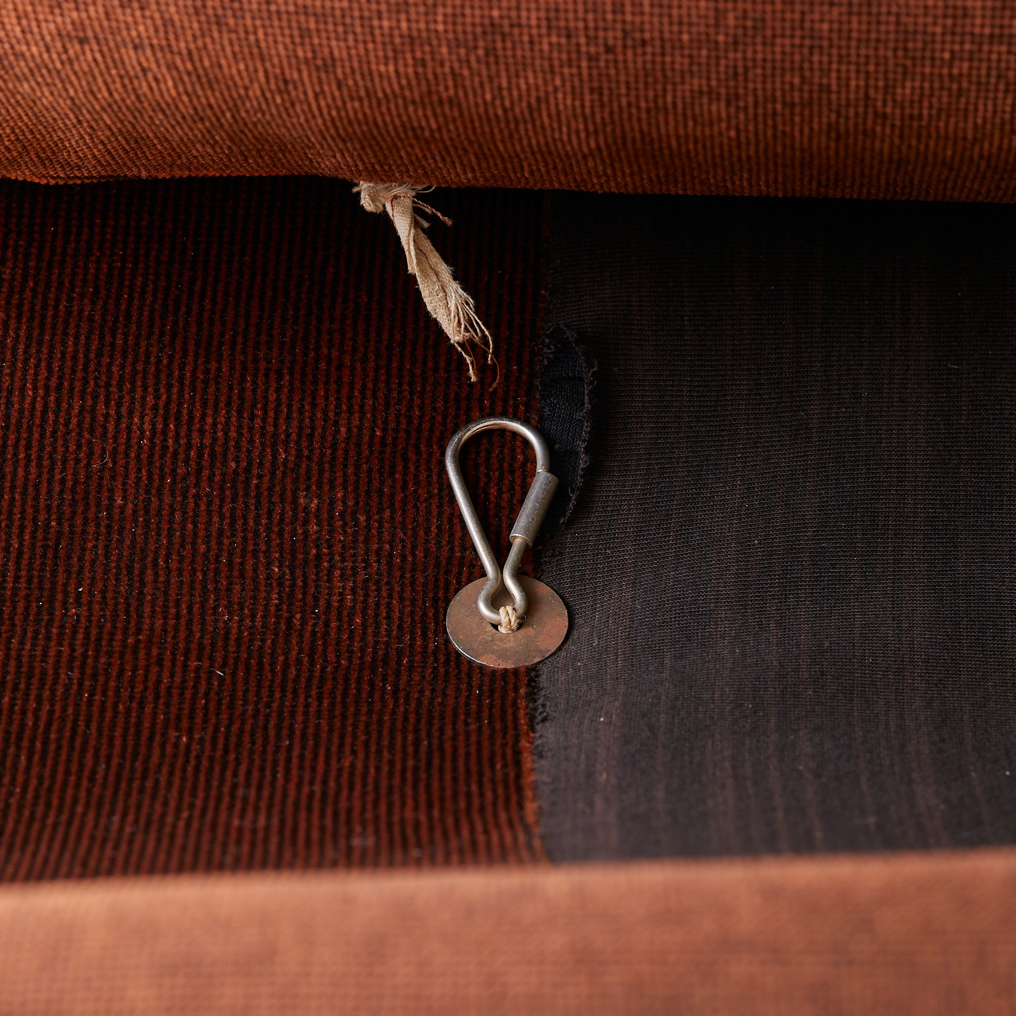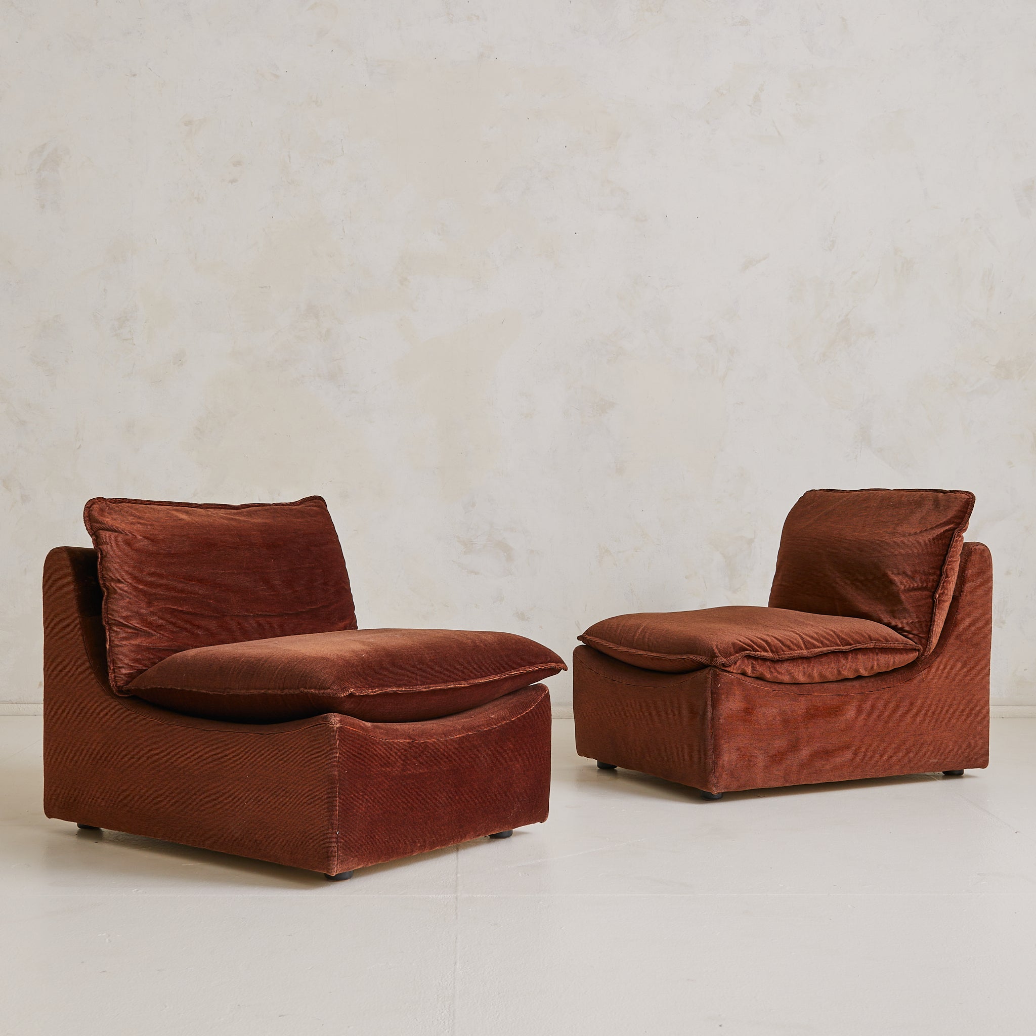 A 1970s Italian lounge chair with deep, low-slung proportions and soft corduroy upholstery in rust brown. The sculptural silhouette rises and dips in a single gesture—structured yet yielding. Plush down cushions rest atop a suspended sling, anchored by metal hooks and rings hidden just below the surface. Subtly elevated on rounded black acrylic feet.