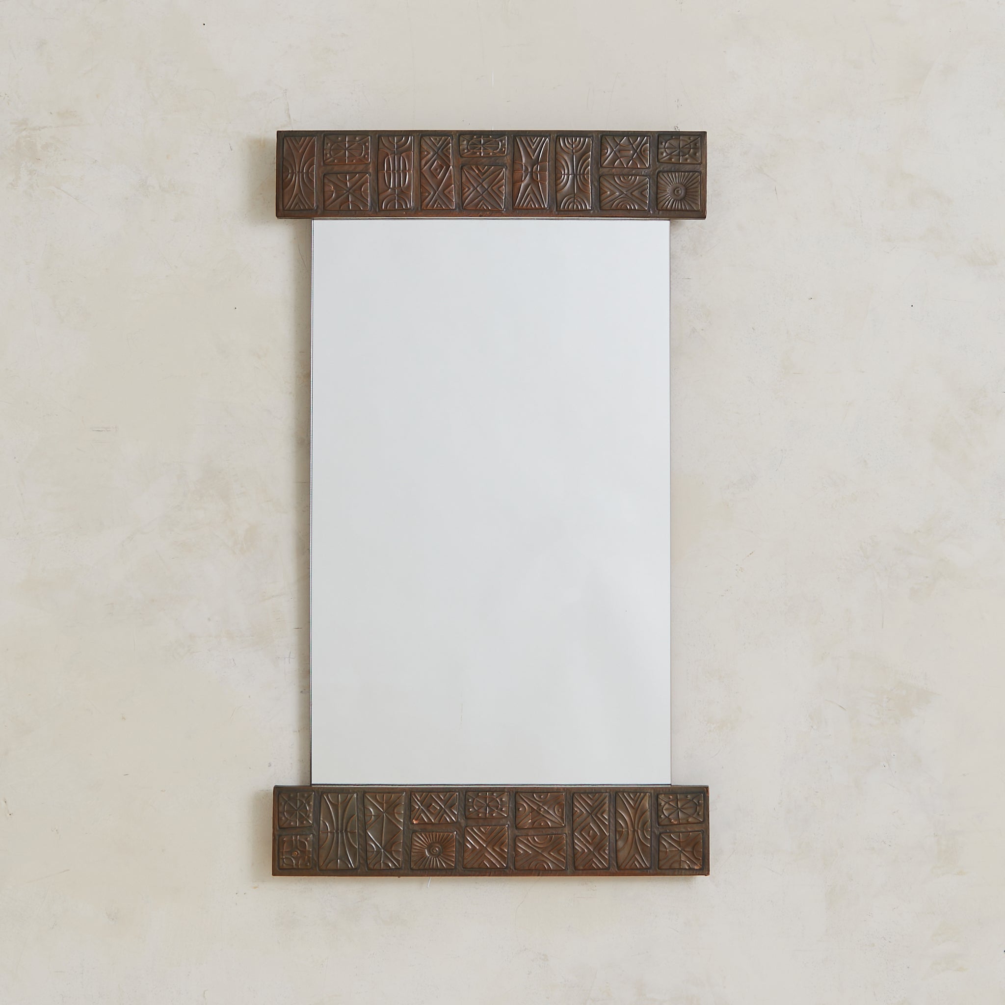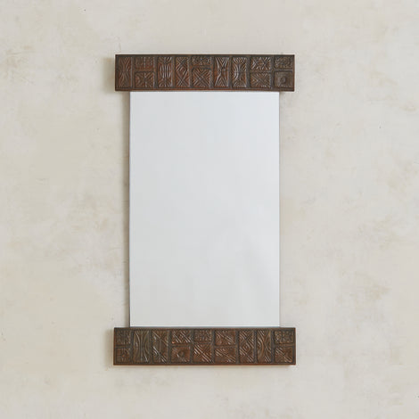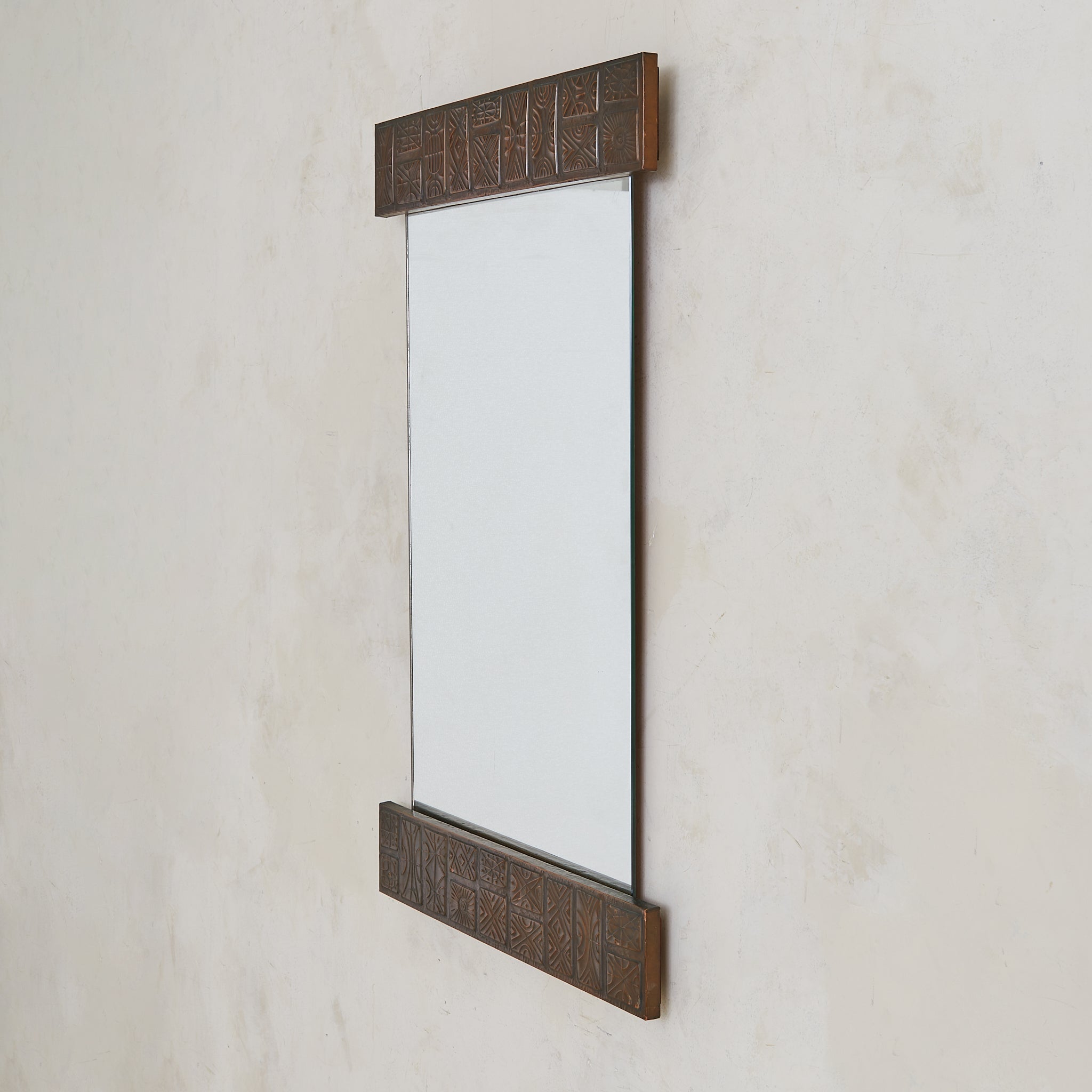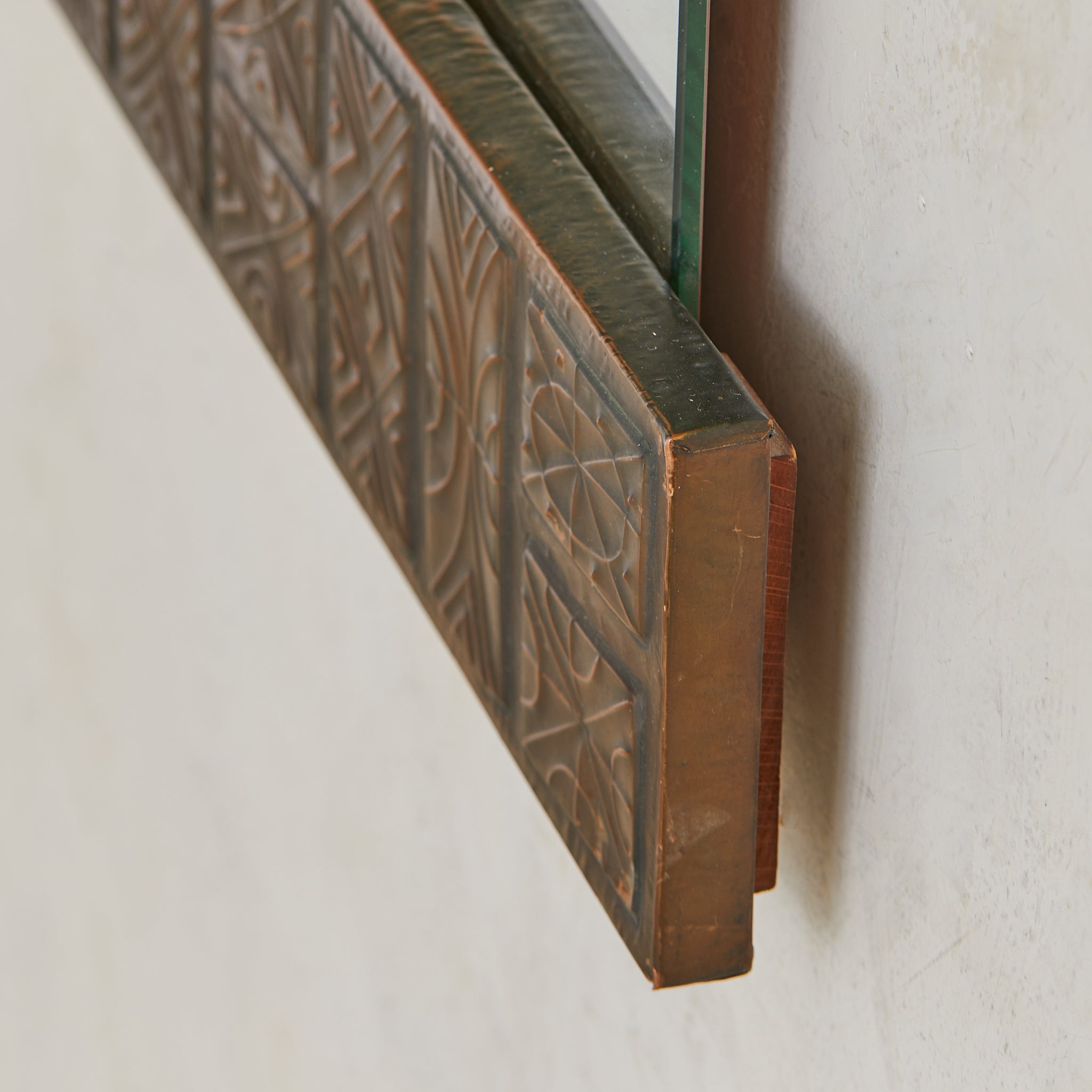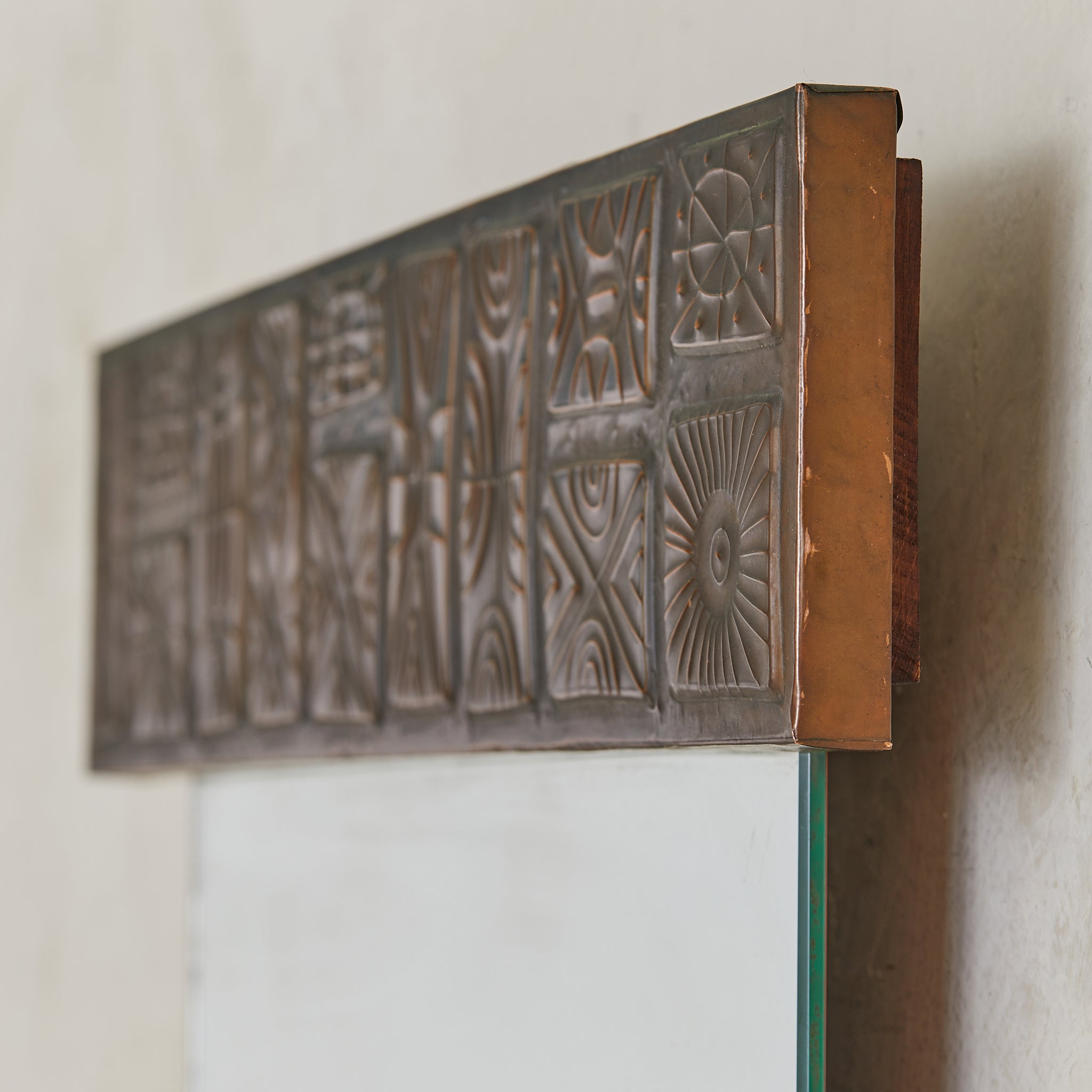 Crafted by the esteemed Milanese metal atelier Santambrogio e De Berti—known for their collaborations with Gio Ponti—this 1960s mirror reflects the refined elegance of Italian modernism. Sculptural copper-clad panels flank the top and base, raised slightly off the surface and embossed with abstract reliefs—a study in proportion and materiality, characteristic of the firm’s architectural sensibility. Celebrated for their precision metalwork and bespoke commissions, Santambrogio e De Berti brought a sculptural sophistication to everyday objects.