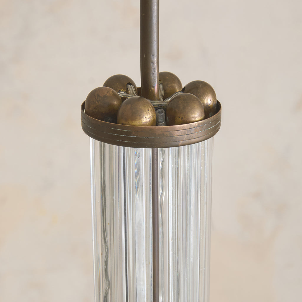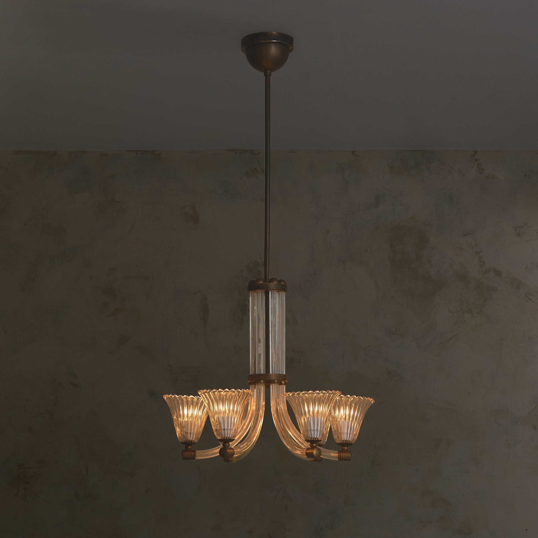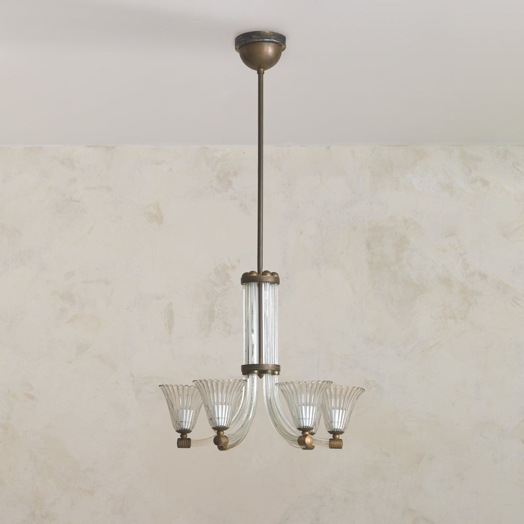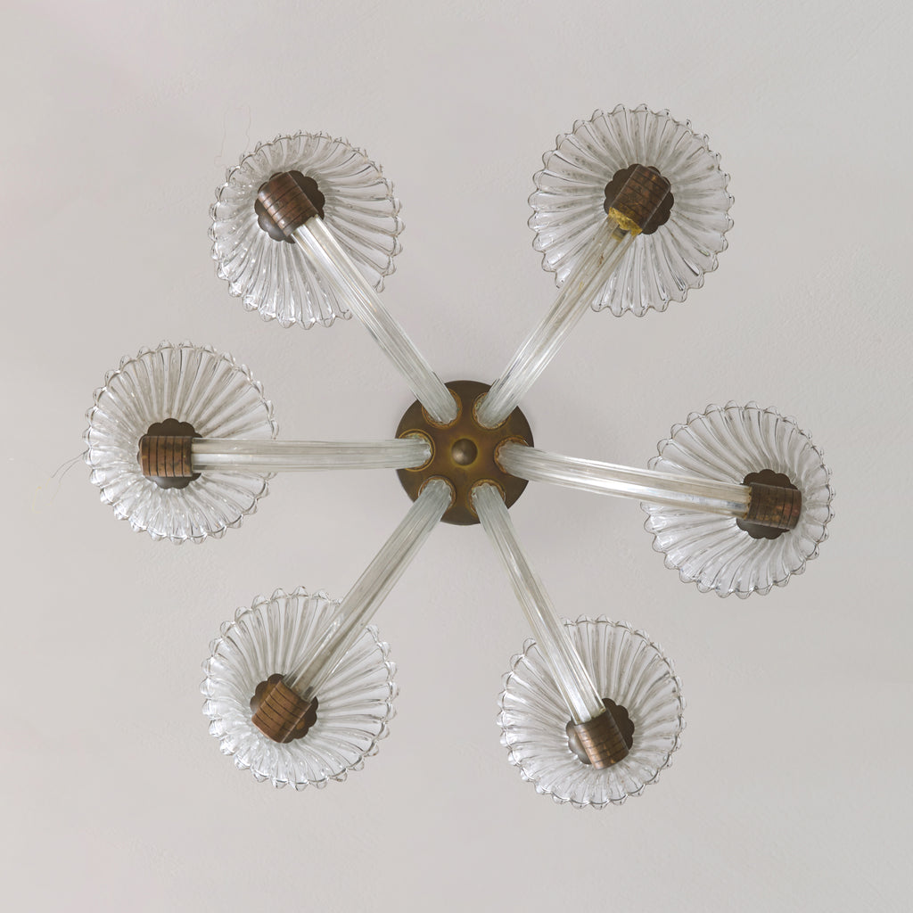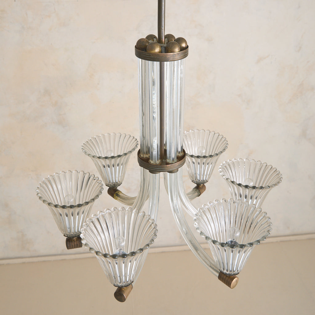 An Italian six-arm Murano glass chandelier attributed to Barovier & Toso, crafted in the 1940s. Six fluted glass shades bloom outward like petals, each held by a curved arm of thick, ribbed glass. The arms converge at a central column composed of vertically stacked Murano rods, capped with patinated brass spheres. Brass fittings throughout show a warm, aged finish, grounding the luminous glass.