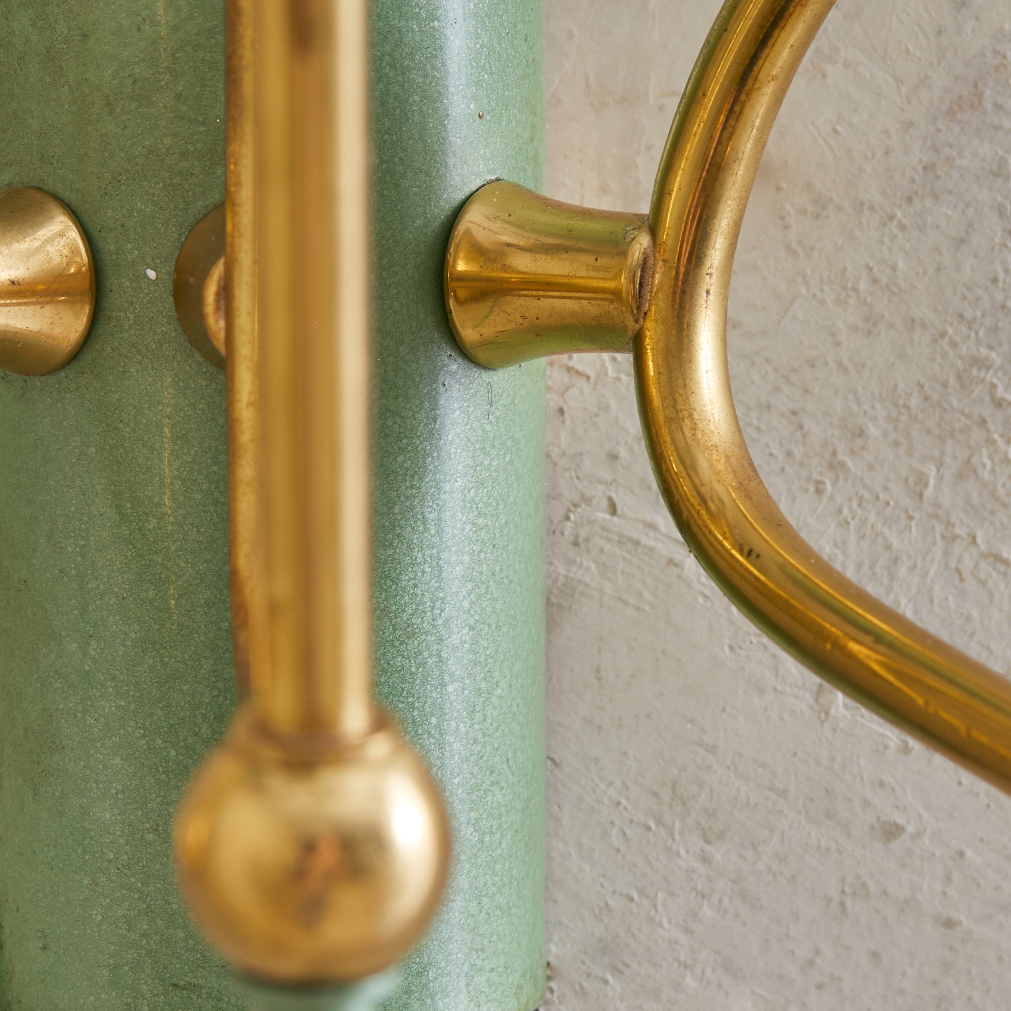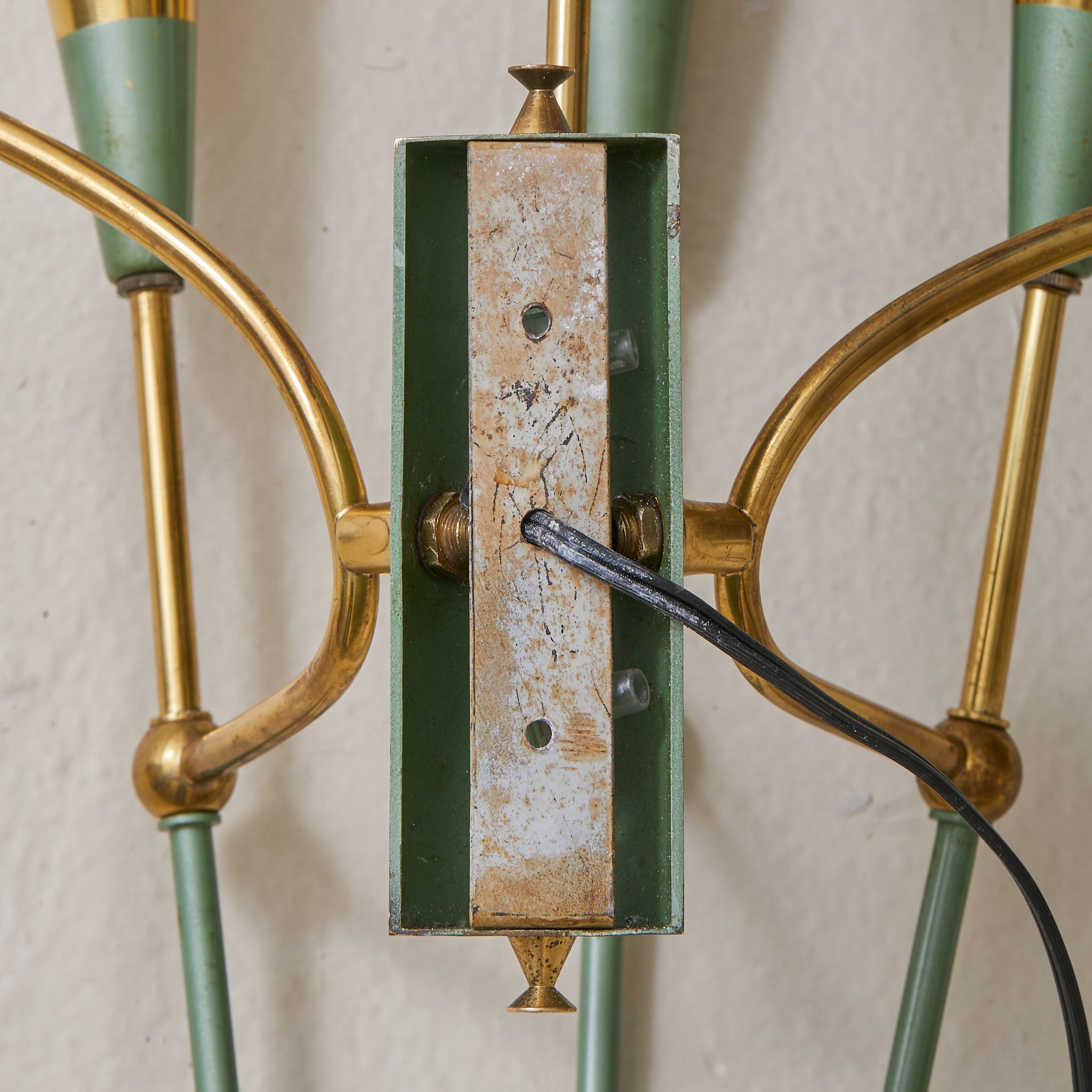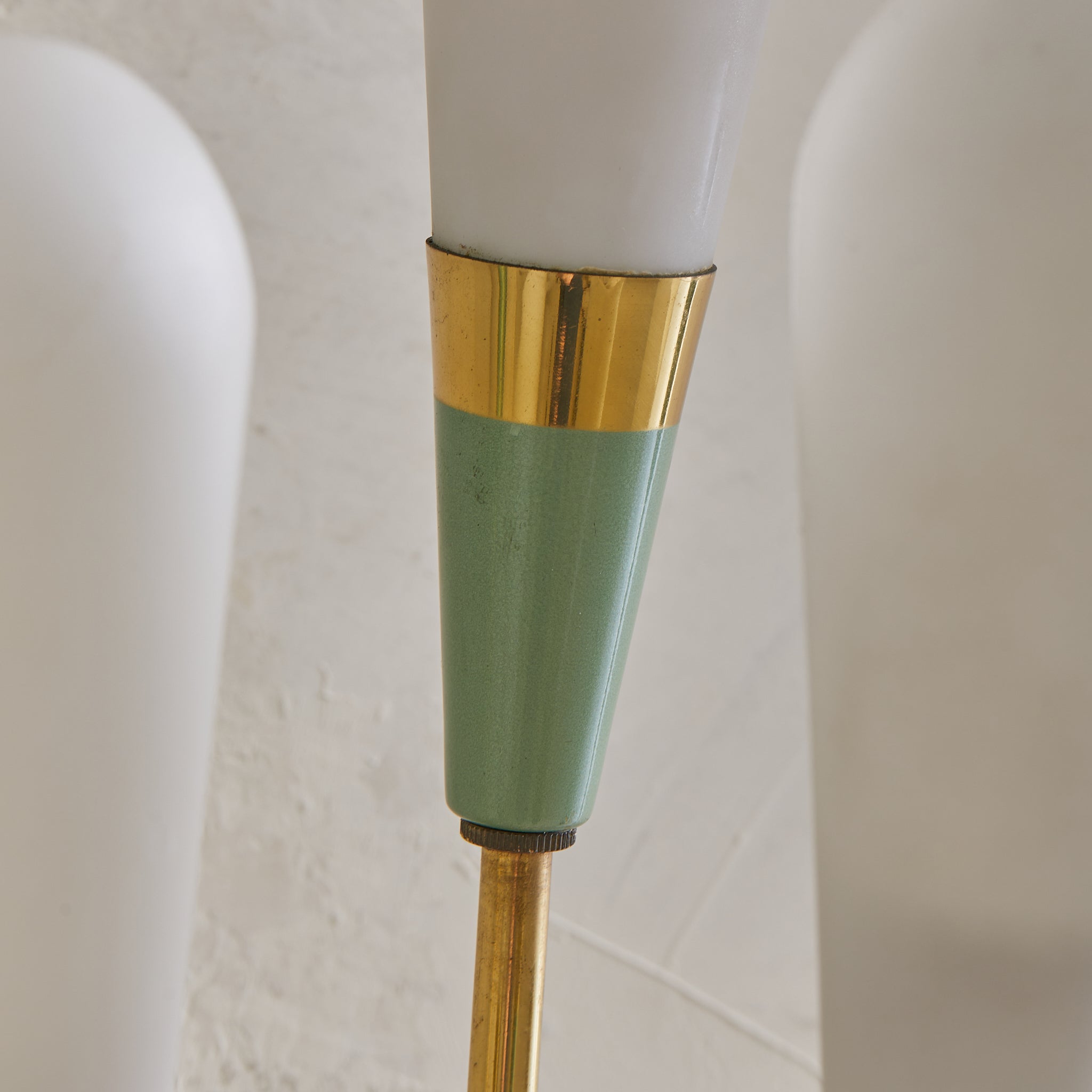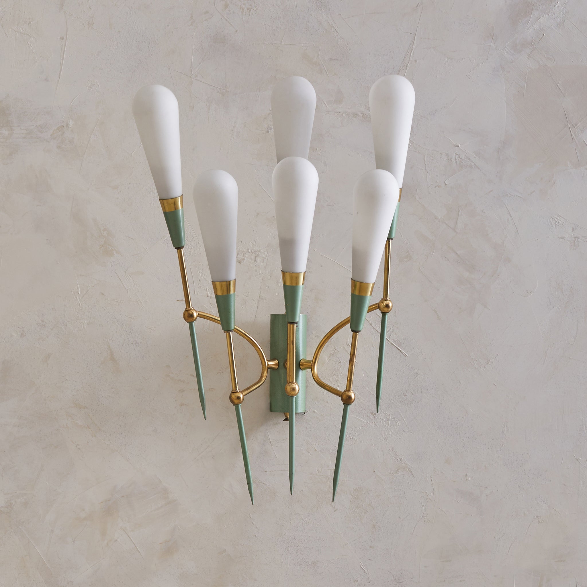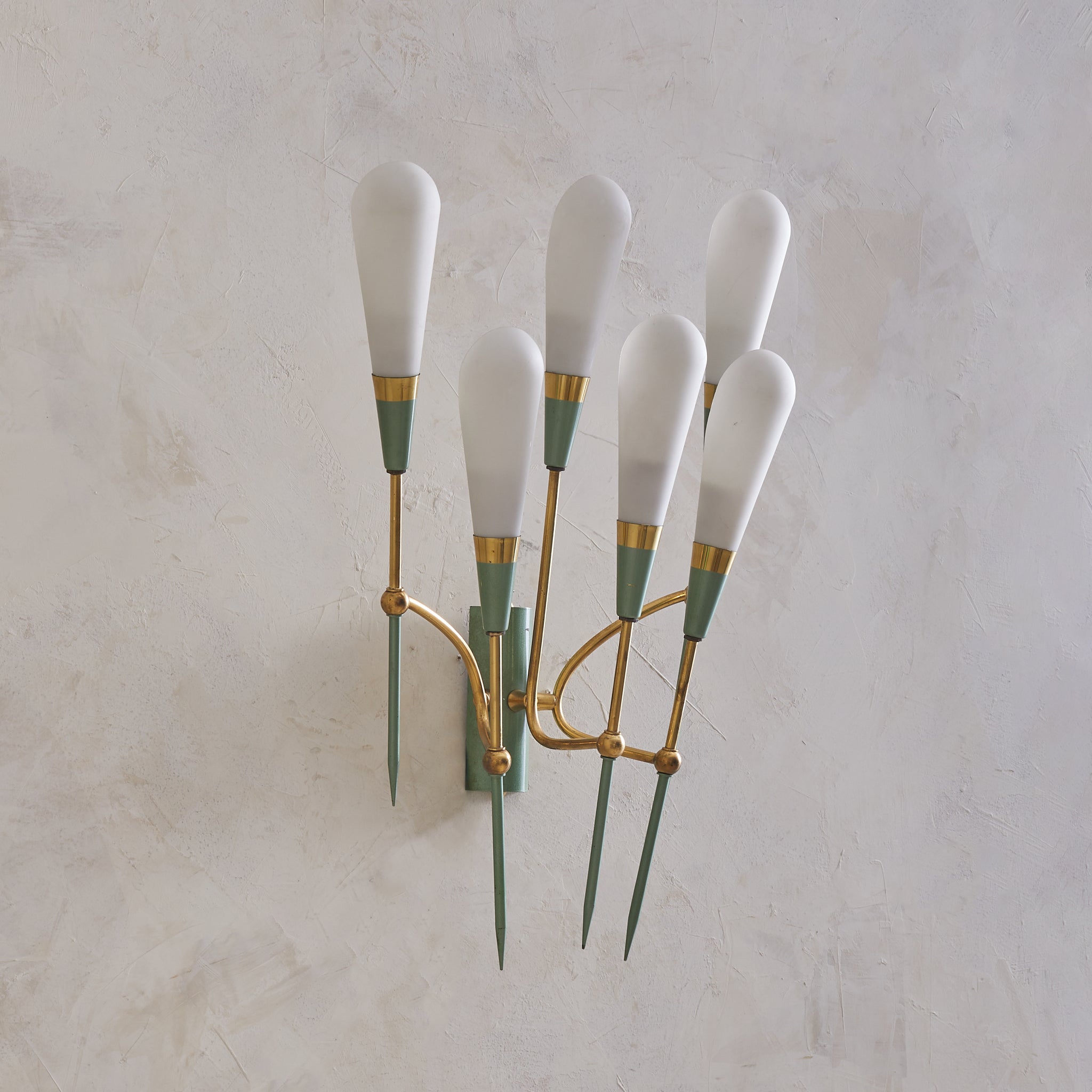 A 1950s Italian wall sconce in pale green lacquered metal and brass. Six tapered arms arc outward in symmetry, each crowned with a flared opaline glass shade and brass collar.