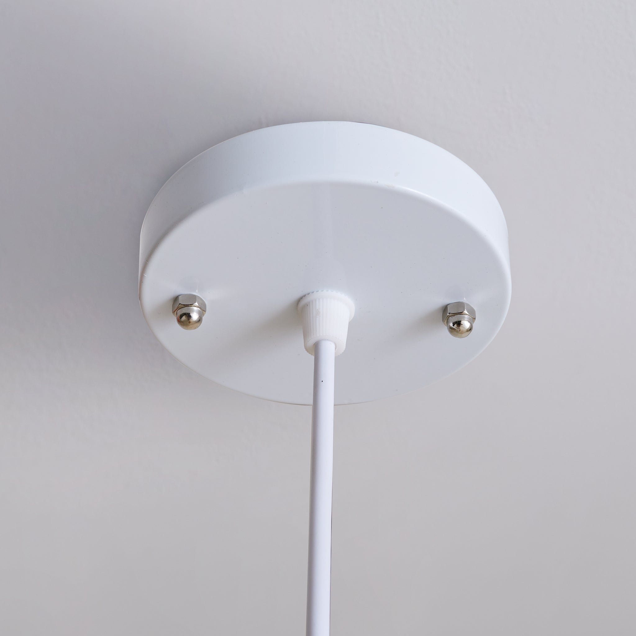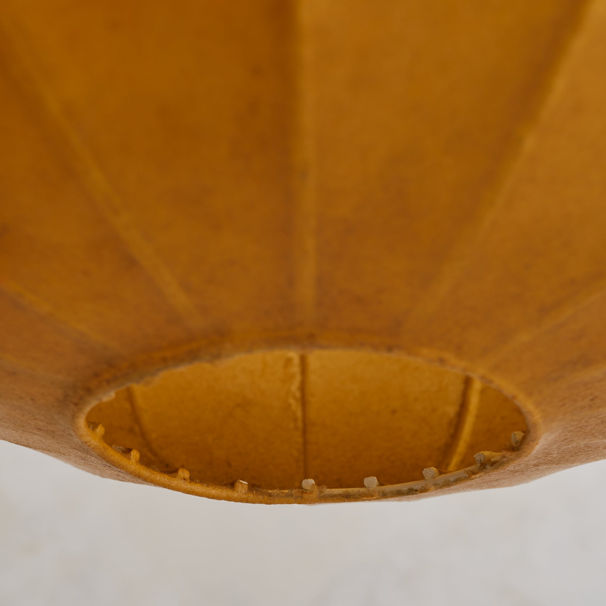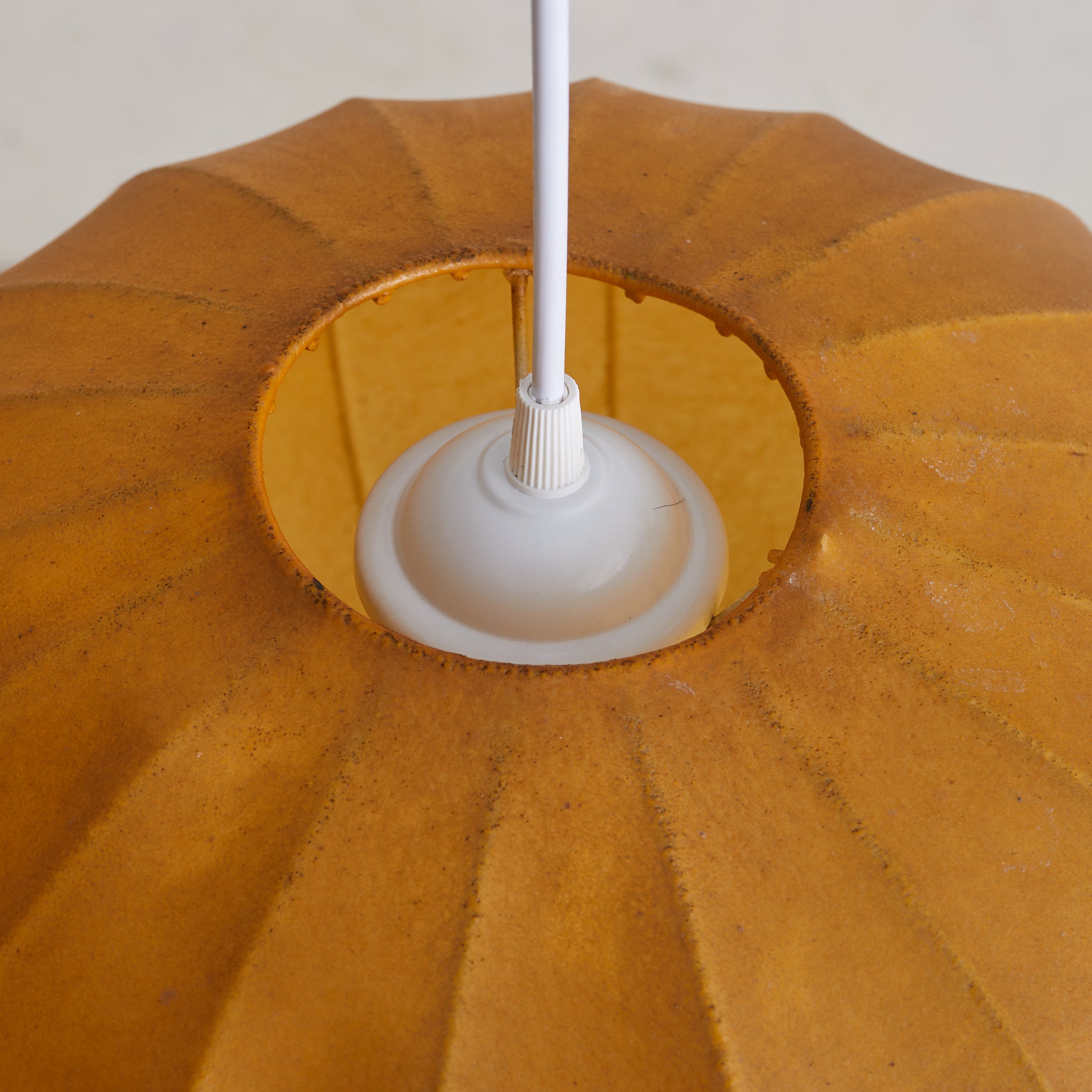 A rare 1960s Italian cocoon pendant featuring a metal frame and a 'cocoon' sprayed resin shade, mimicking the look of goatskin parchment in a soft ochre hue. This pendant has a spherical shape with curved channels and includes a new white canopy. When lit, it emanates a warm, inviting glow.