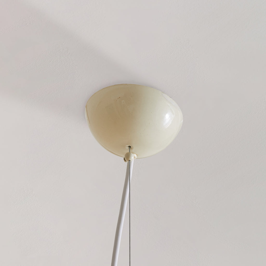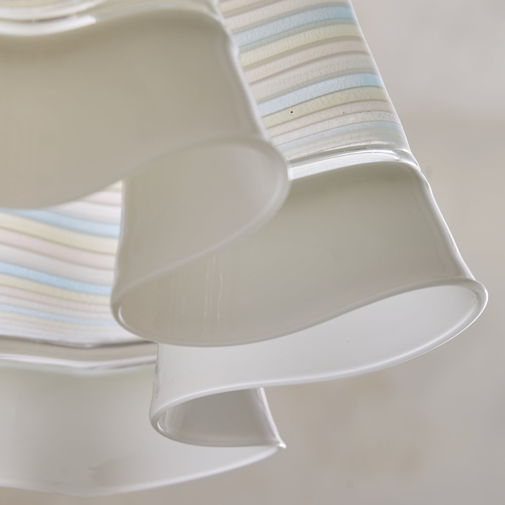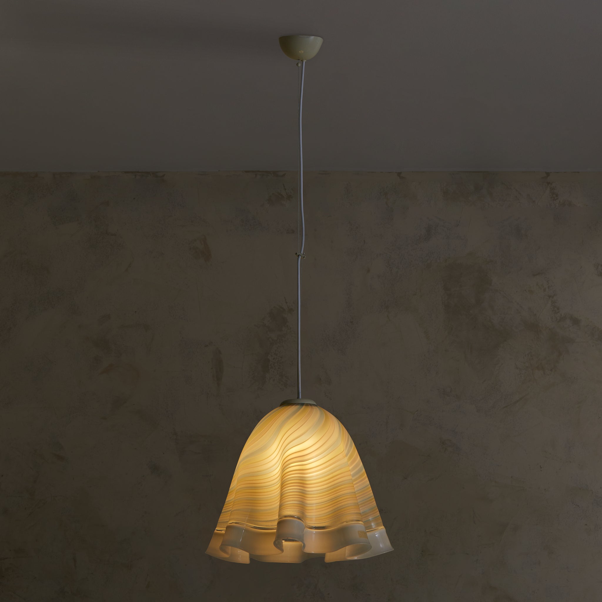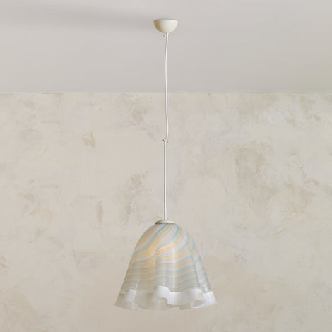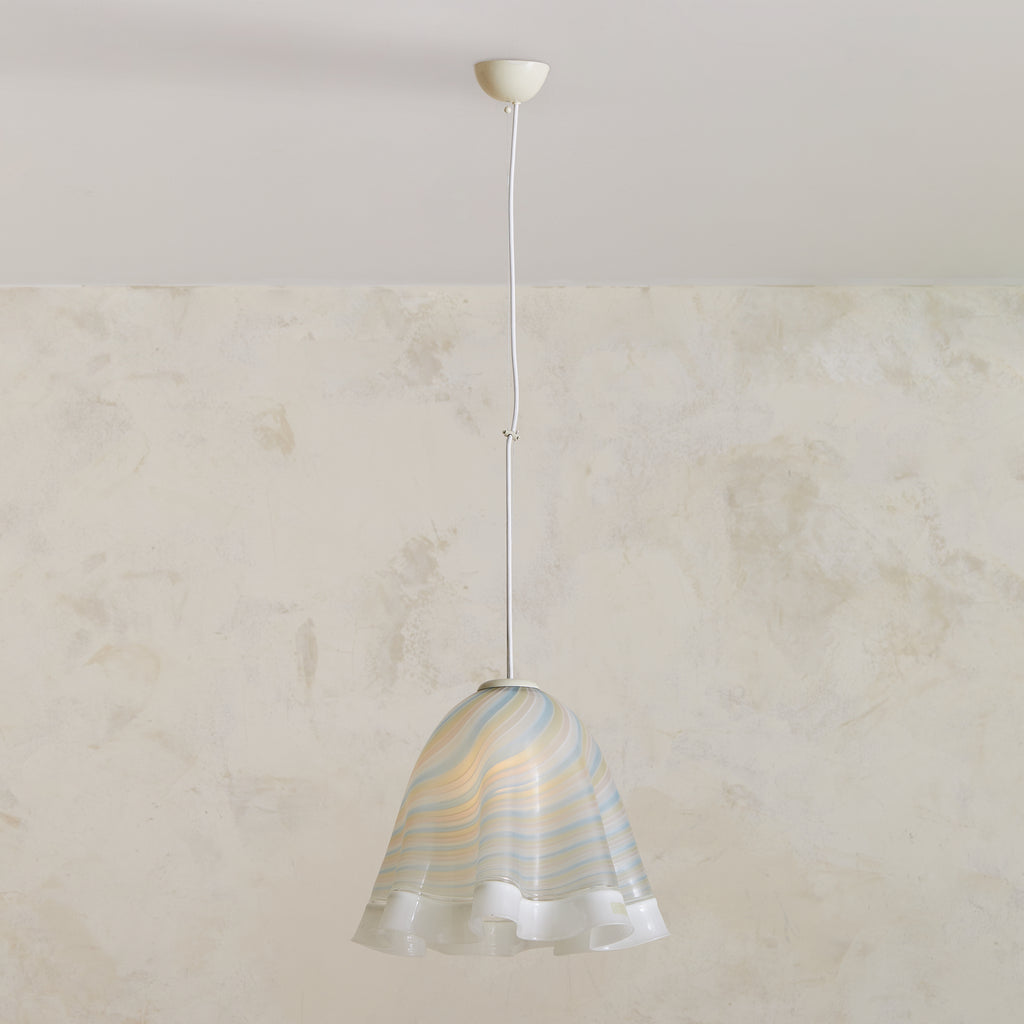 This Murano glass pendant is an elegant reflection of 1970s Italian artistry, showcasing fluid lines and masterful craftsmanship. Its hand-blown shade, featuring undulating ruffled edges, showcases delicate striped pastel hues swirling through translucent glass, creating a soft and mesmerizing glow when illuminated. Suspended from a simple white cord and metal canopy, it stands as a true nod to the Mazzega school of design—a celebration of Murano’s glassmaking heritage.