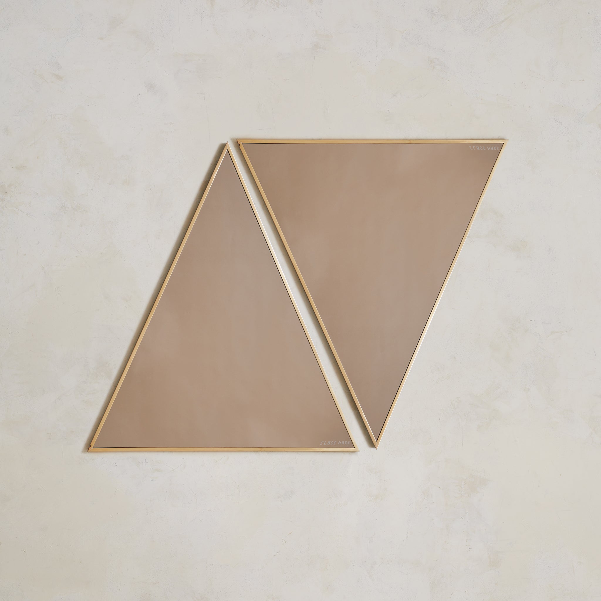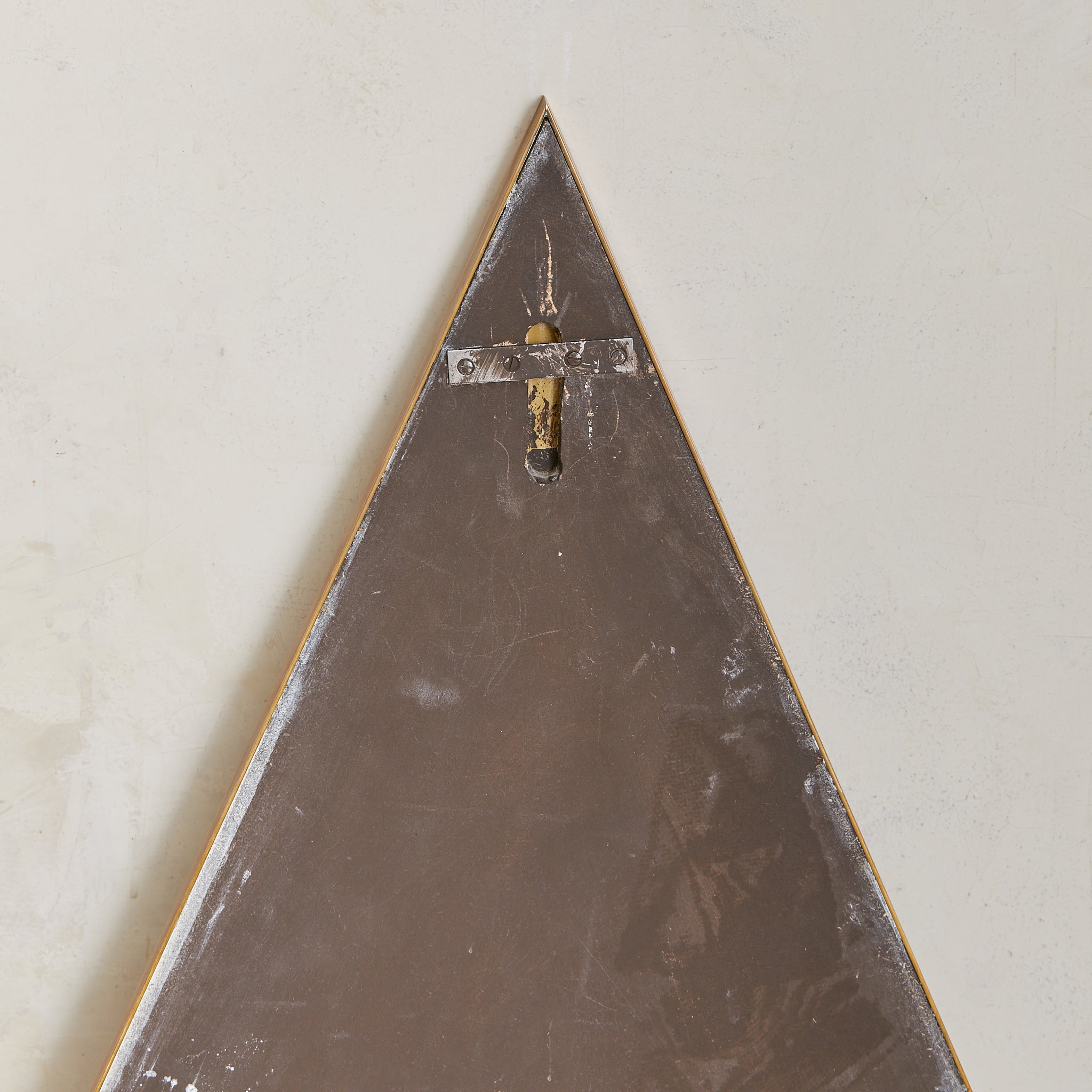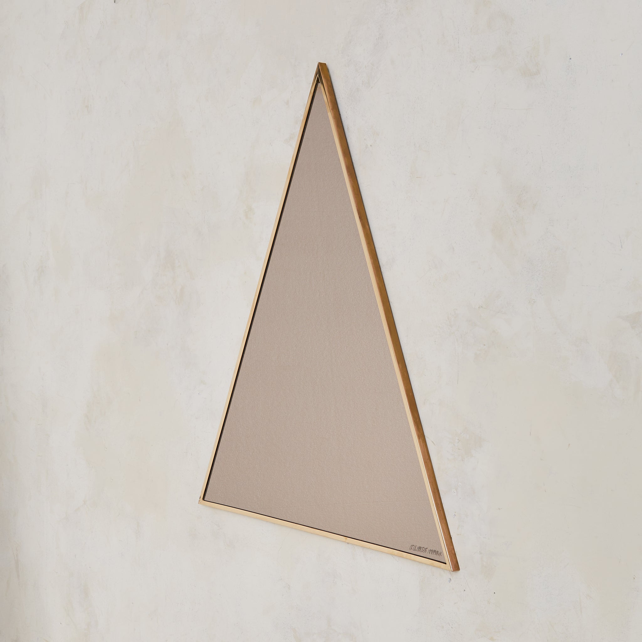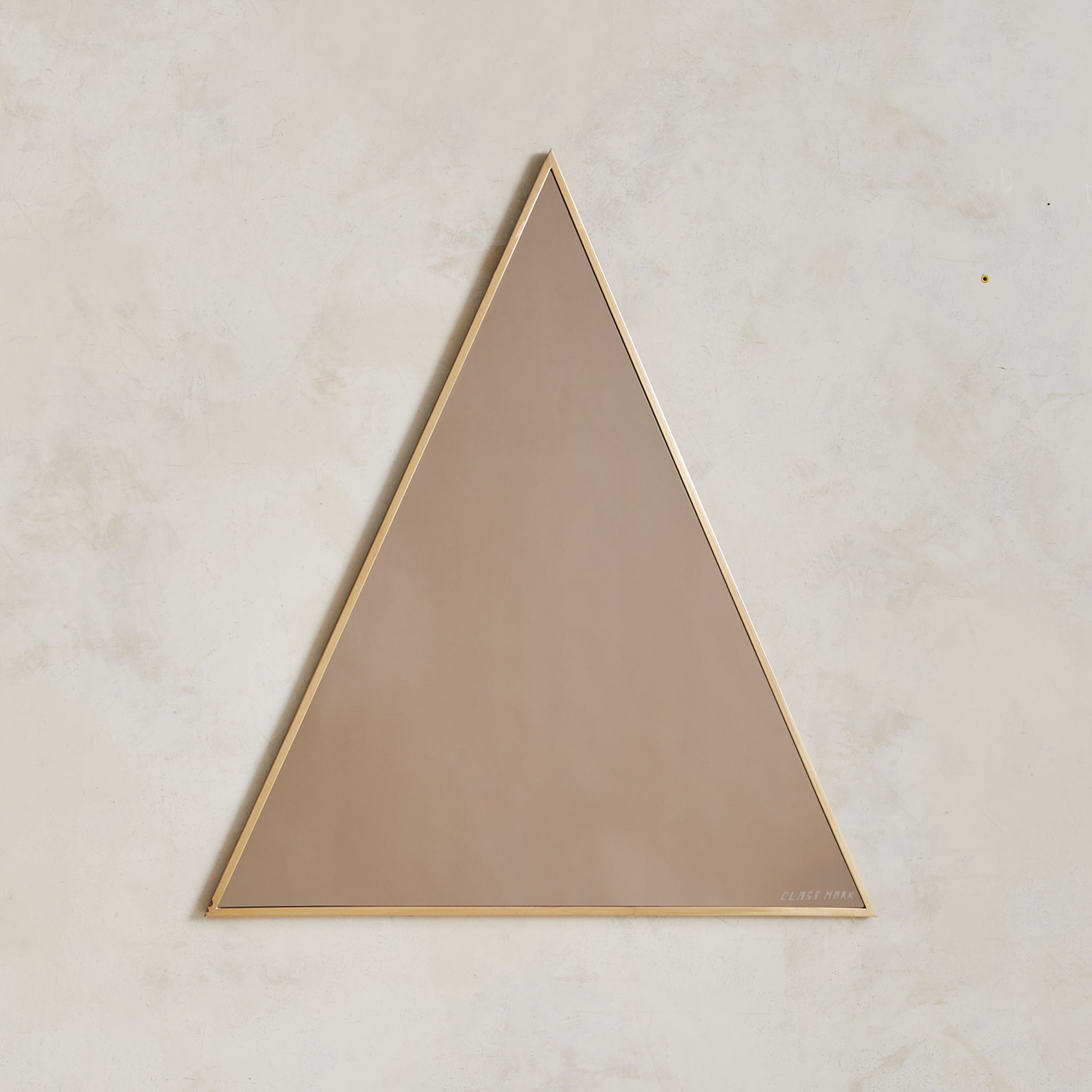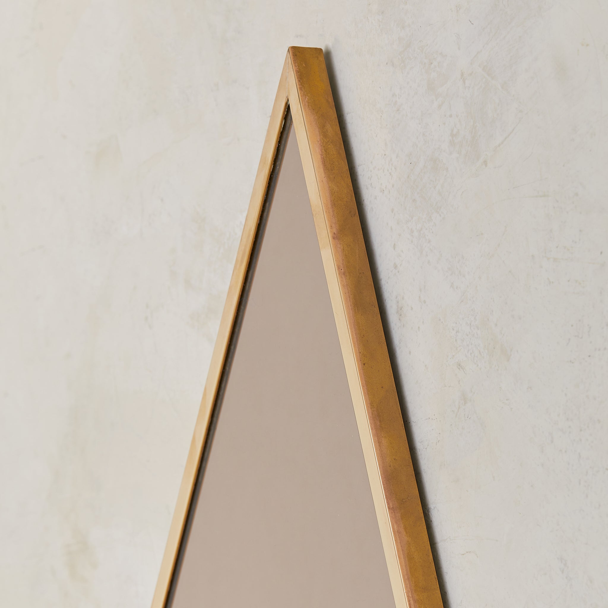 A rare Italian wall mirror from the 1950s, crafted in a triangular silhouette with warm bronze-tinted mirror glass. Framed in a slim band of patinated brass, the geometric form reads as both sculpture and surface.