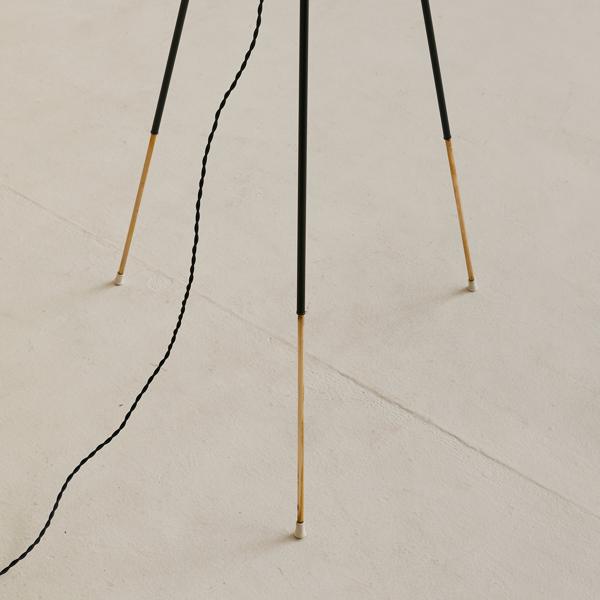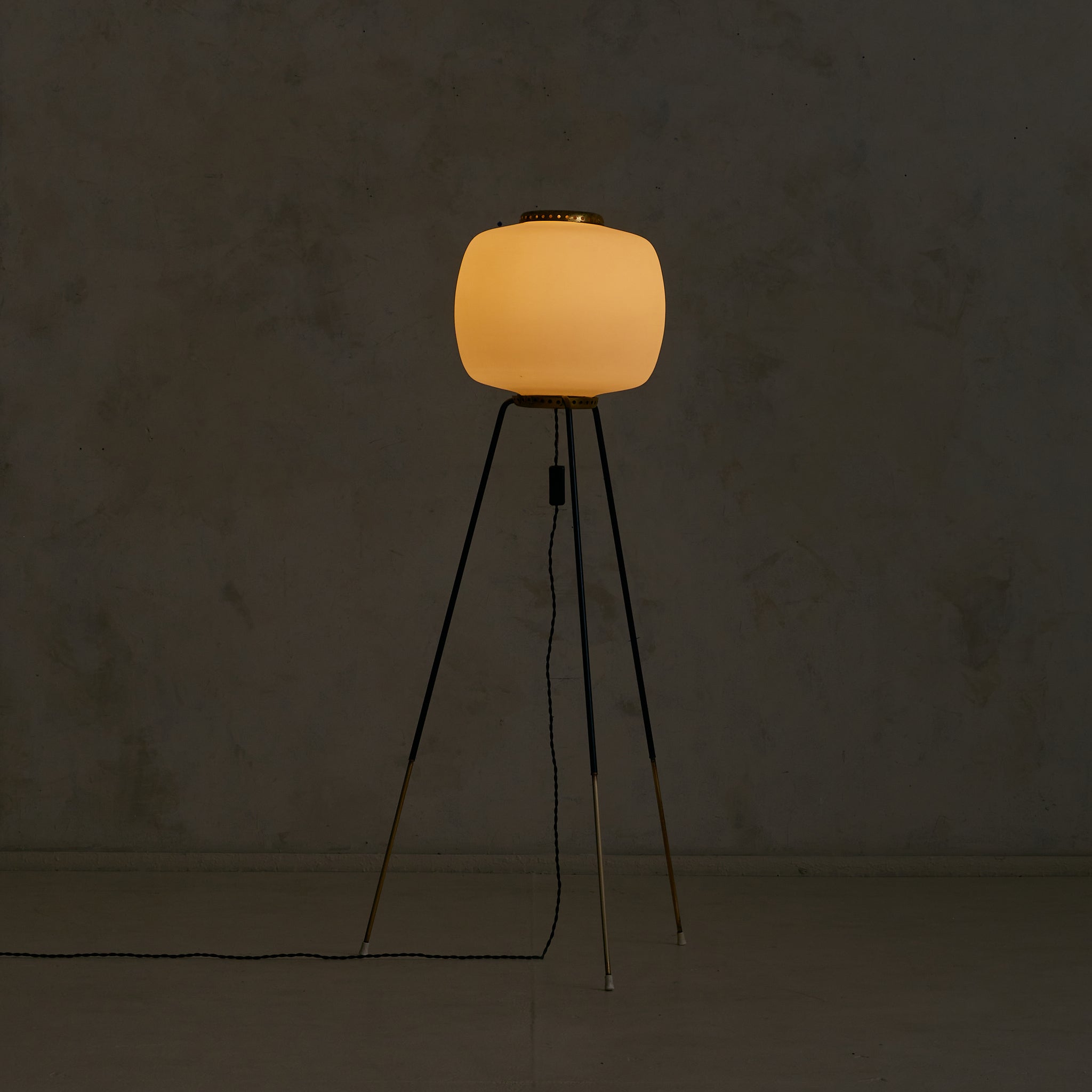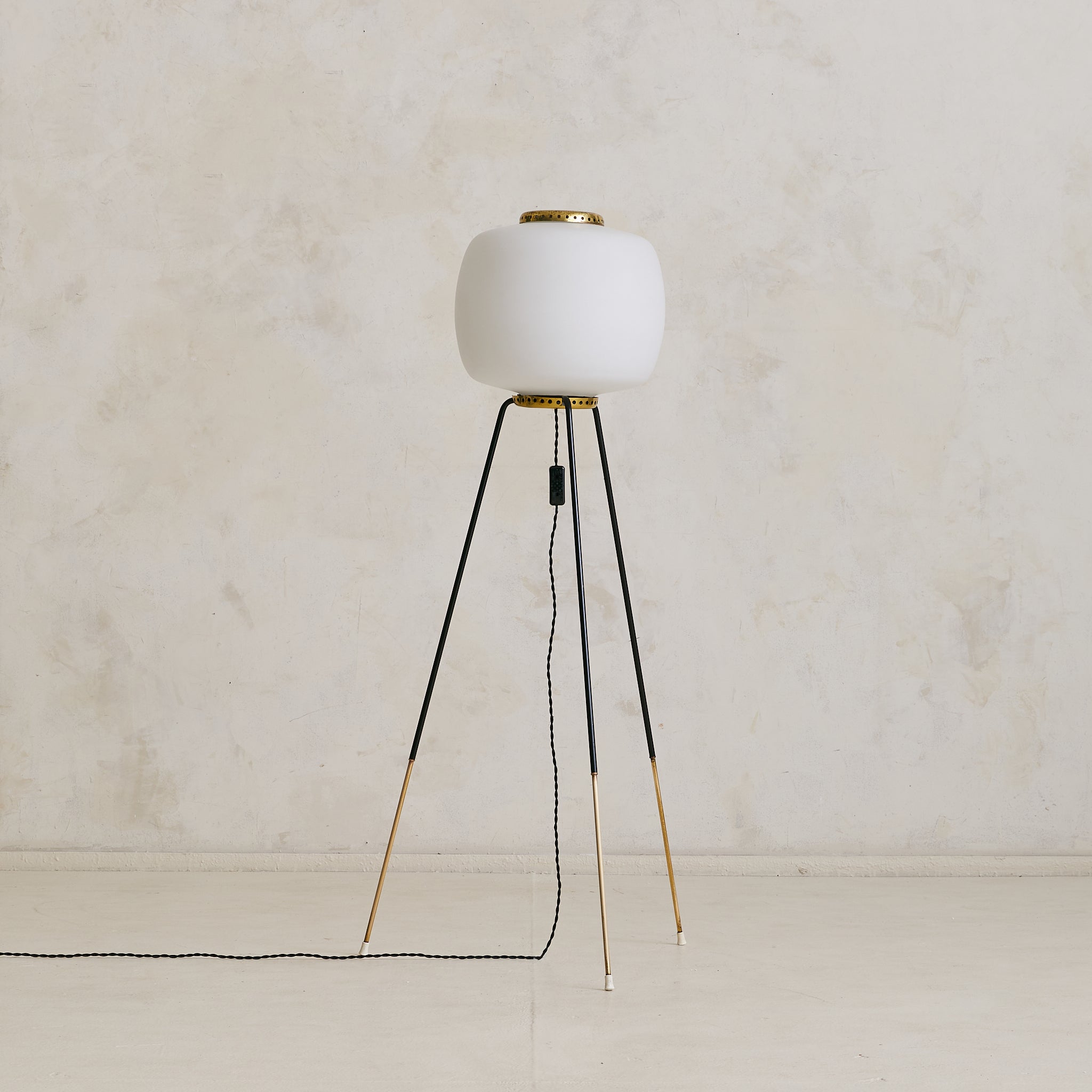 A 1950s Italian floor lamp with a tripod base in black-lacquered metal capped by tapered brass feet. The oversized opaline-glass globe is cinched top and bottom by perforated brass collars, lending a soft, even glow when lit.