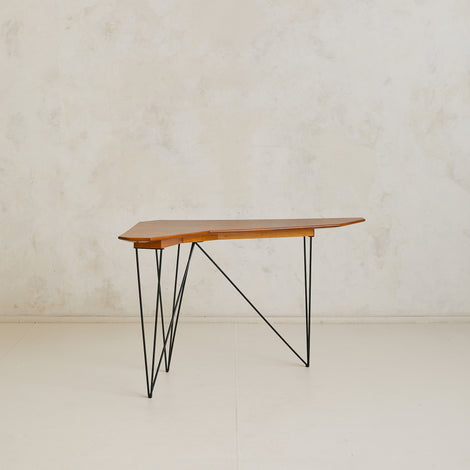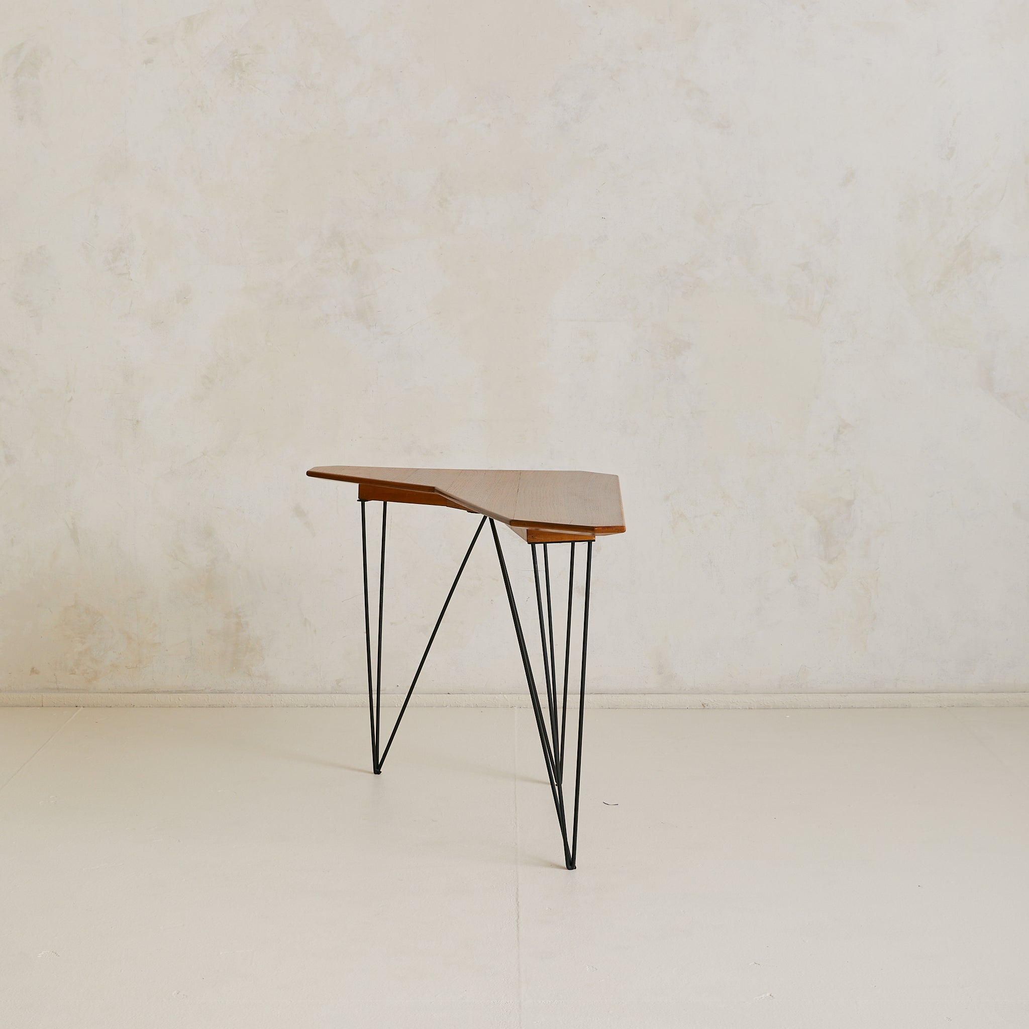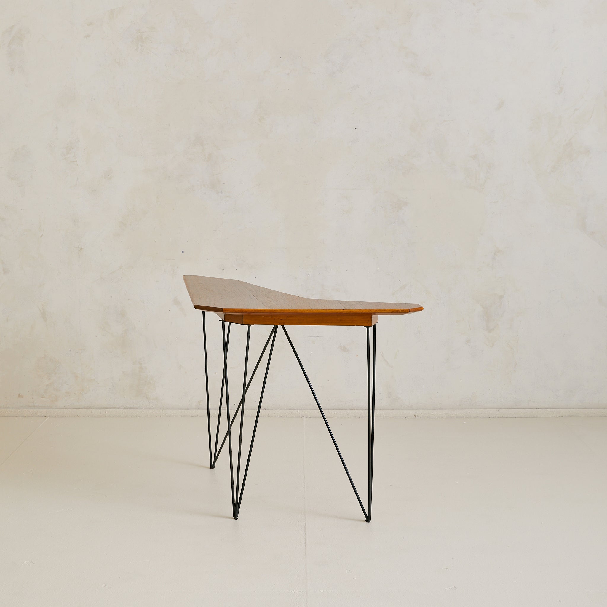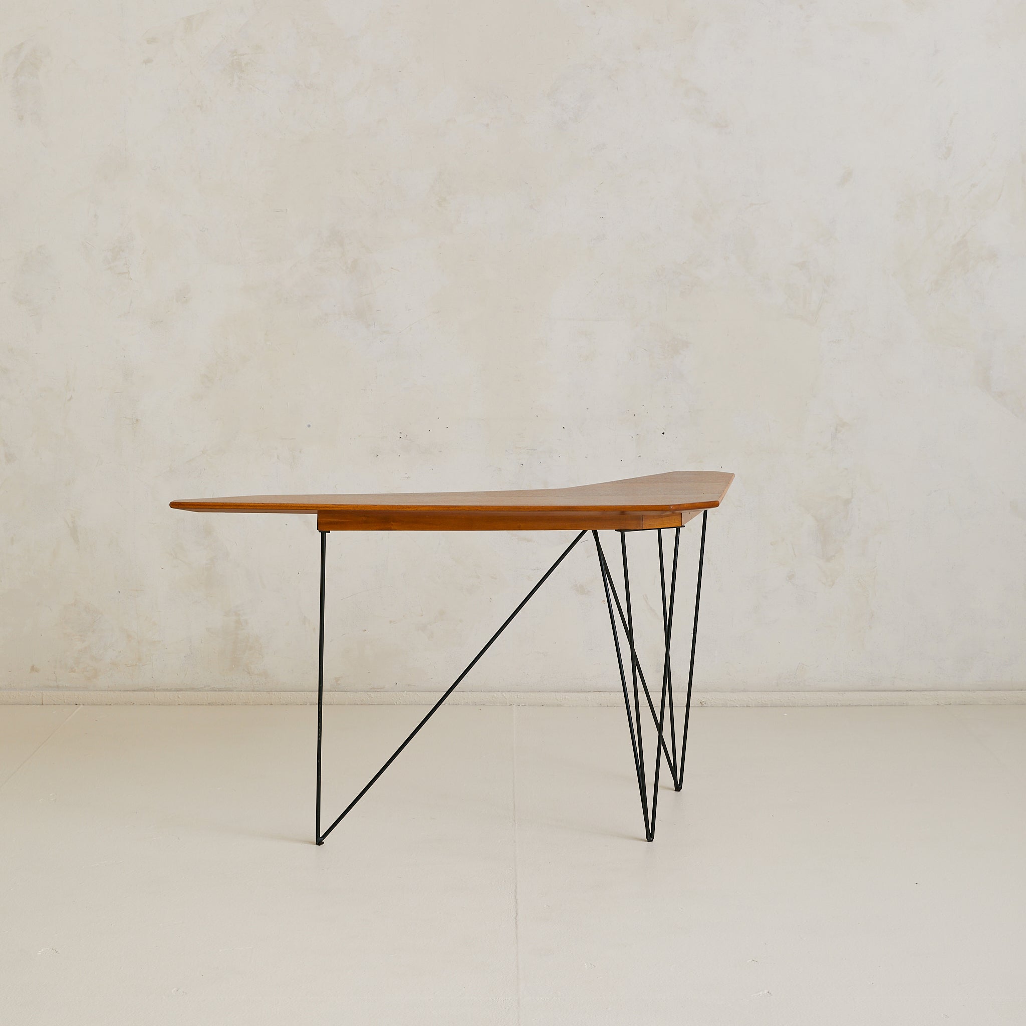 An Italian console or corner desk from the 1950s, defined by its asymmetrical profile. The walnut top is cut into a sharp, angular form, cantilevering lightly over a geometric base of blackened metal rods. The play of negative space lends the piece an architectural, airy silhouette.