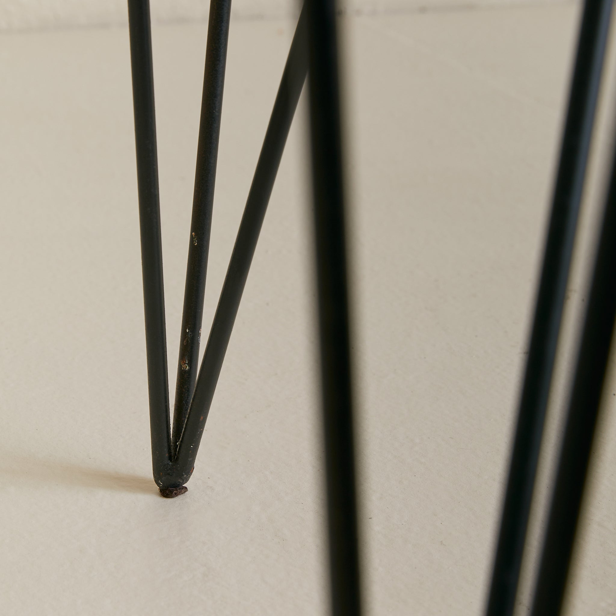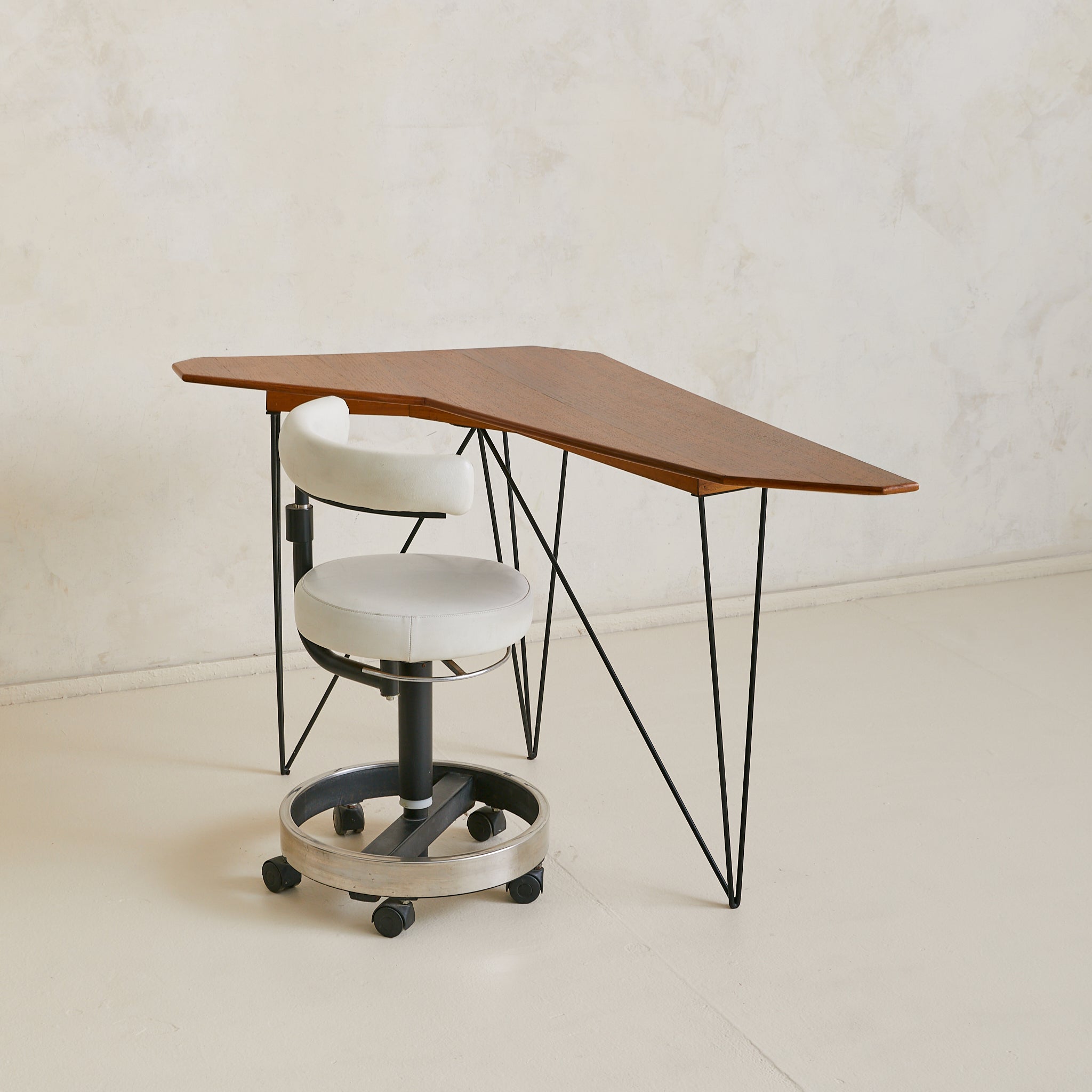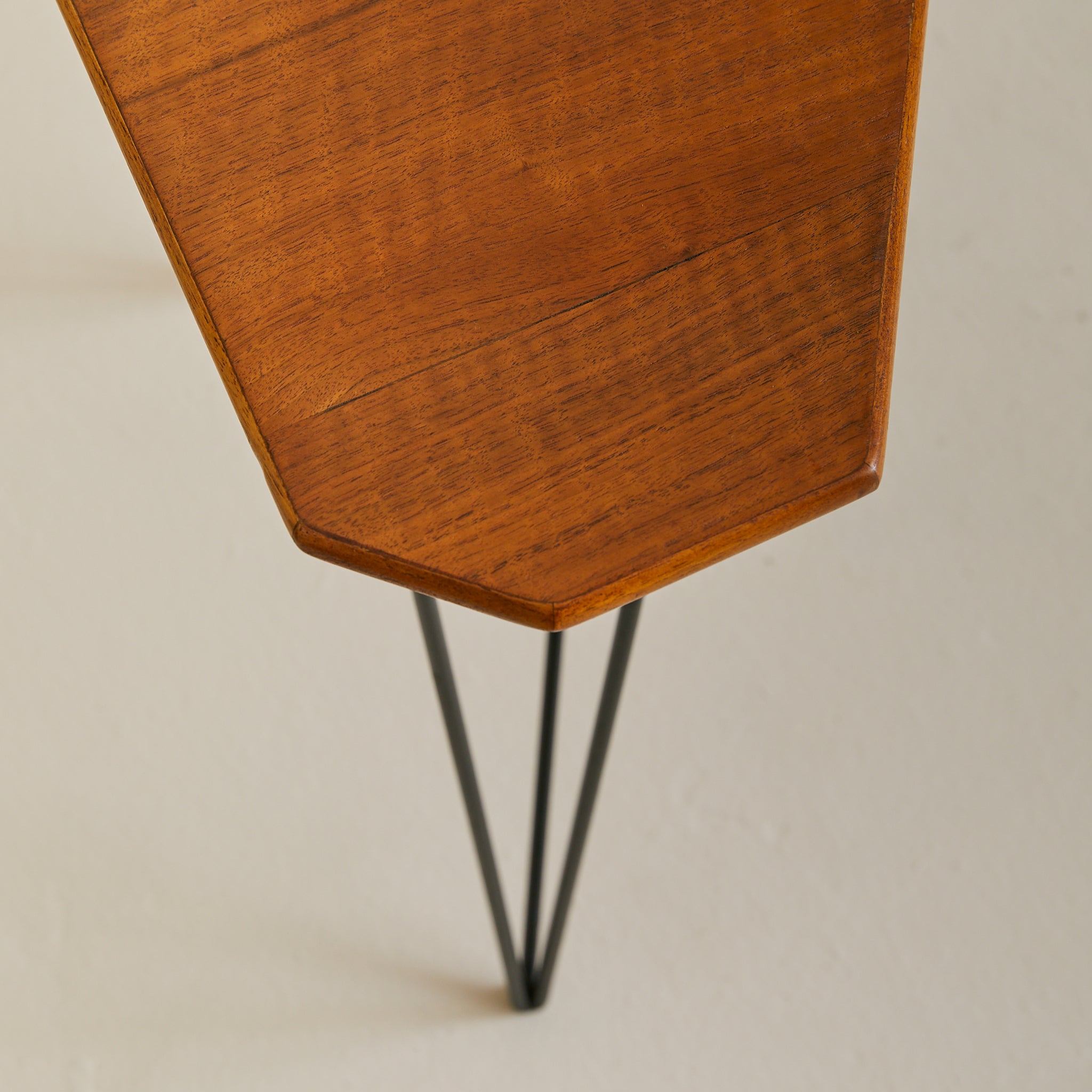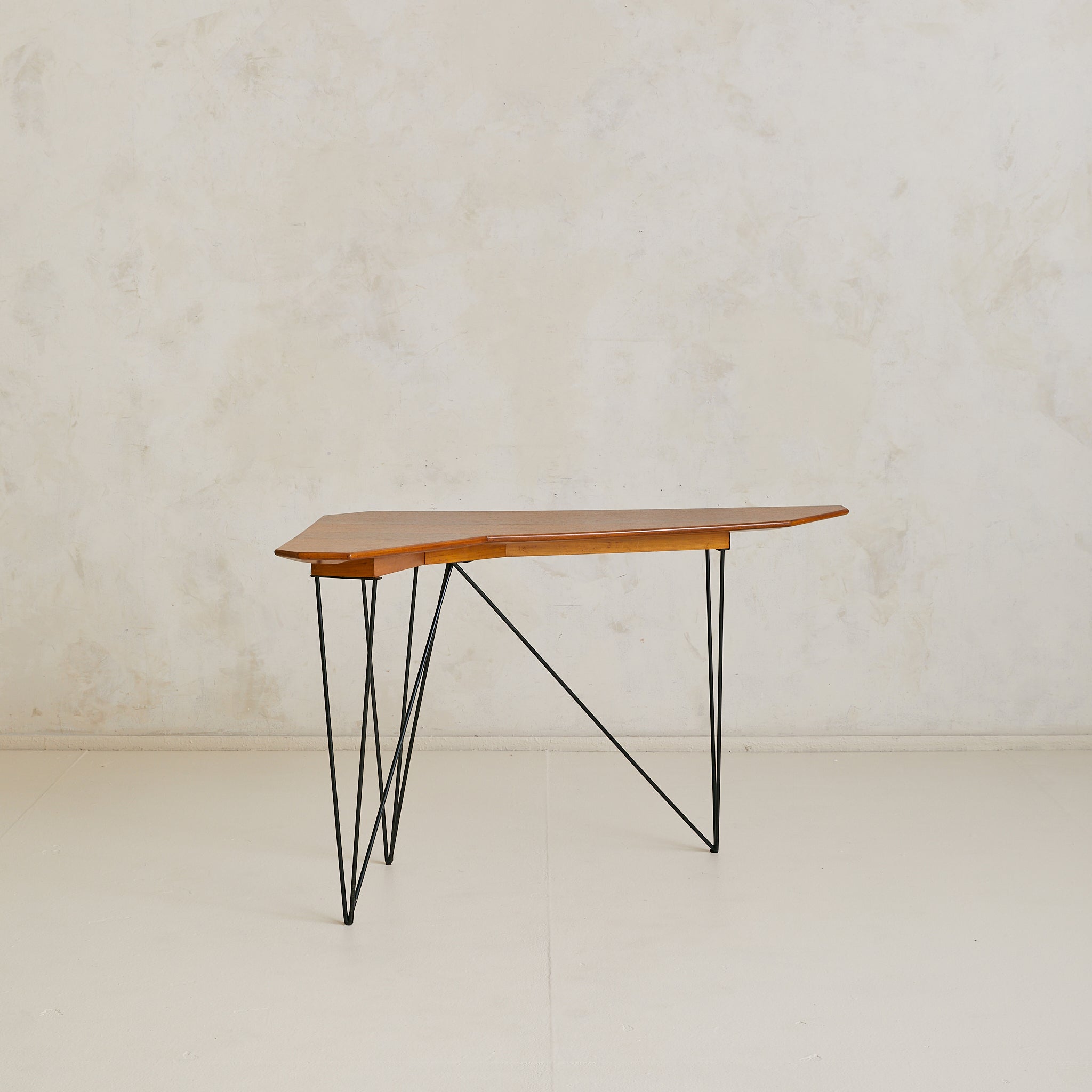 An Italian console or corner desk from the 1950s, defined by its asymmetrical profile. The walnut top is cut into a sharp, angular form, cantilevering lightly over a geometric base of blackened metal rods. The play of negative space lends the piece an architectural, airy silhouette.