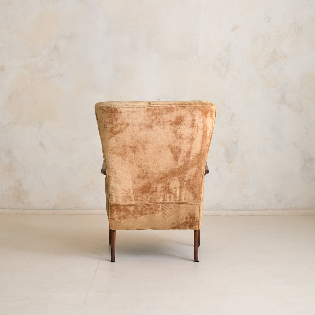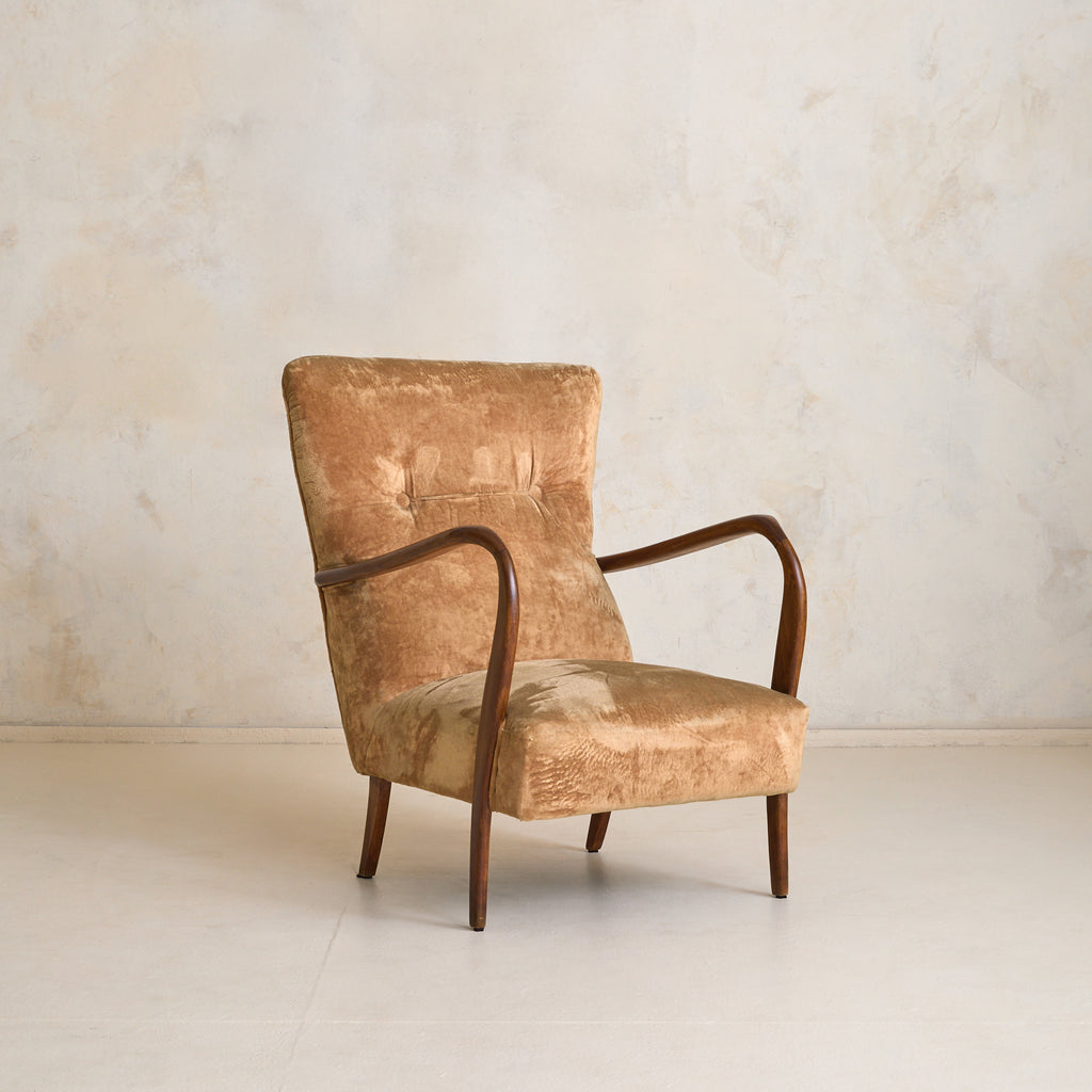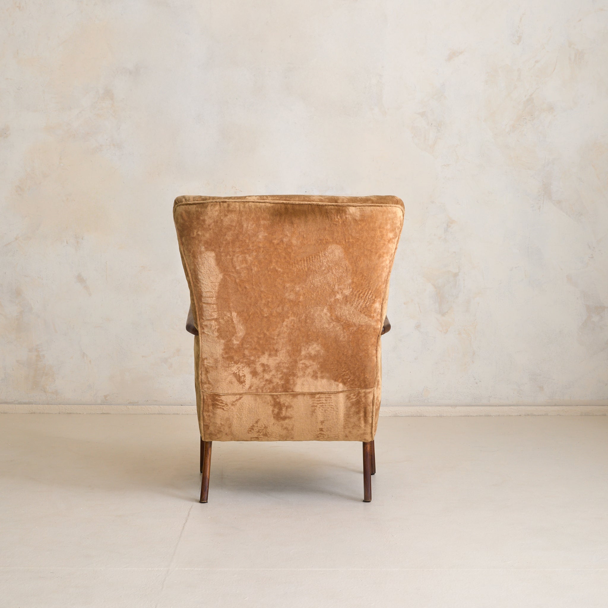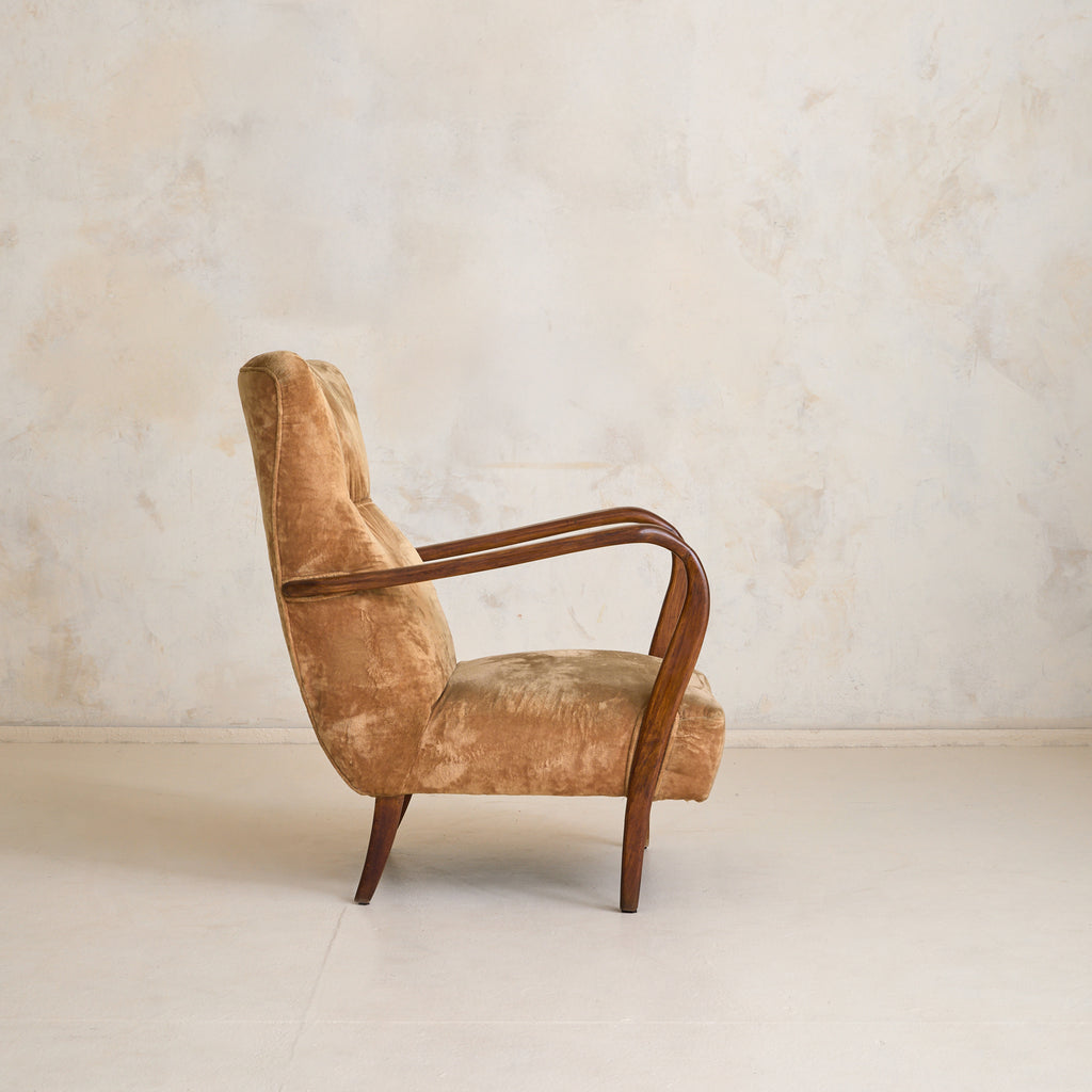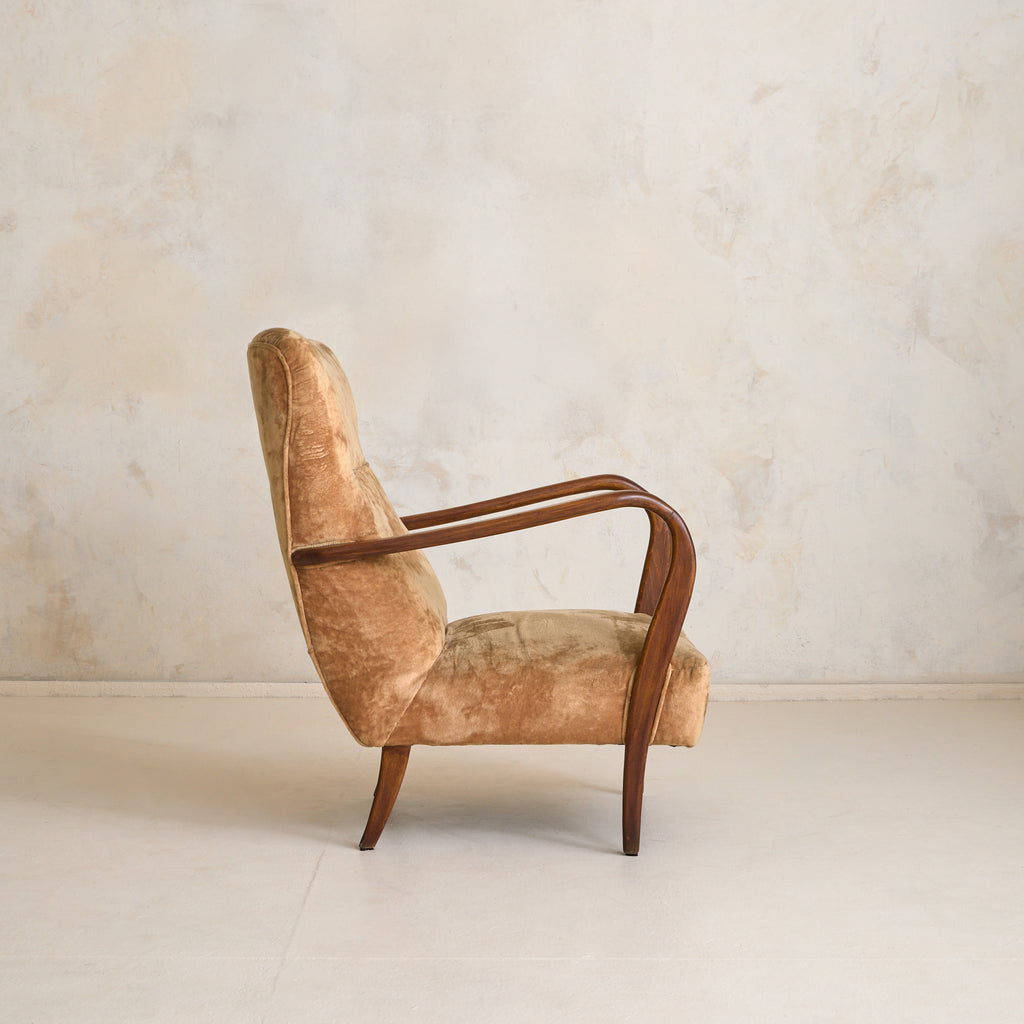 A 1960s Italian armchair, upholstered in original camel crushed velvet. The seat and high backrest are punctuated with button tufts, softening the silhouette with a tailored detail. Sculpted wooden arms extend in graceful curves, their warm patina complementing the sheen of the upholstery.