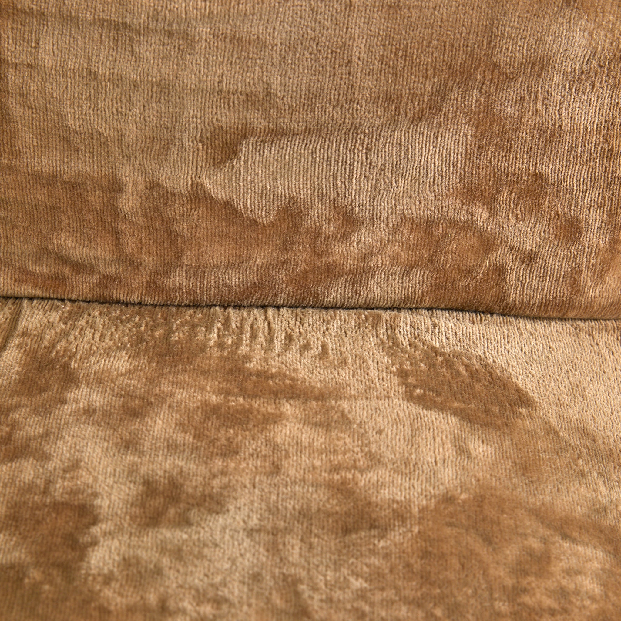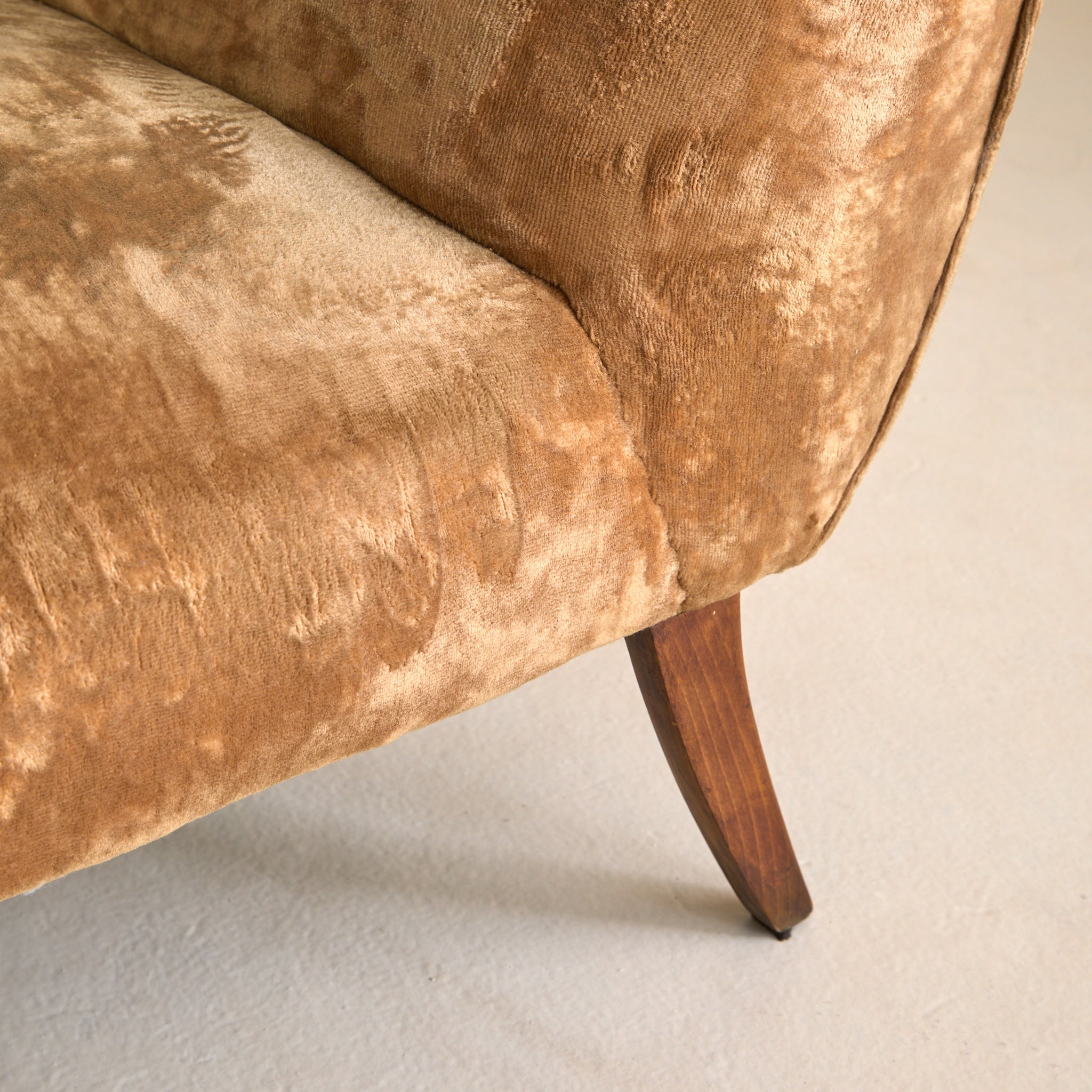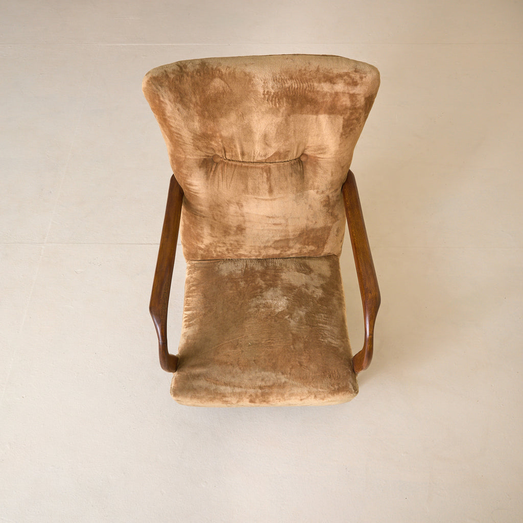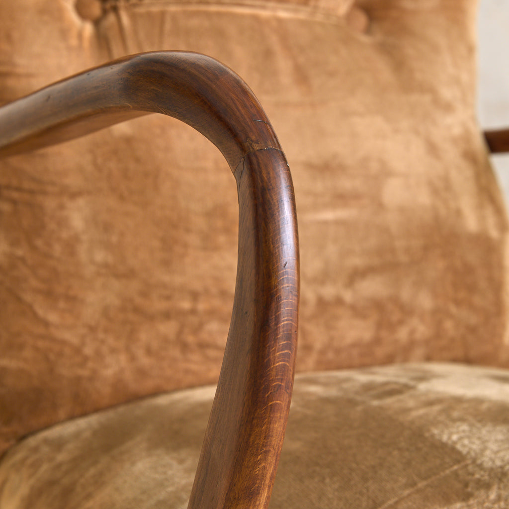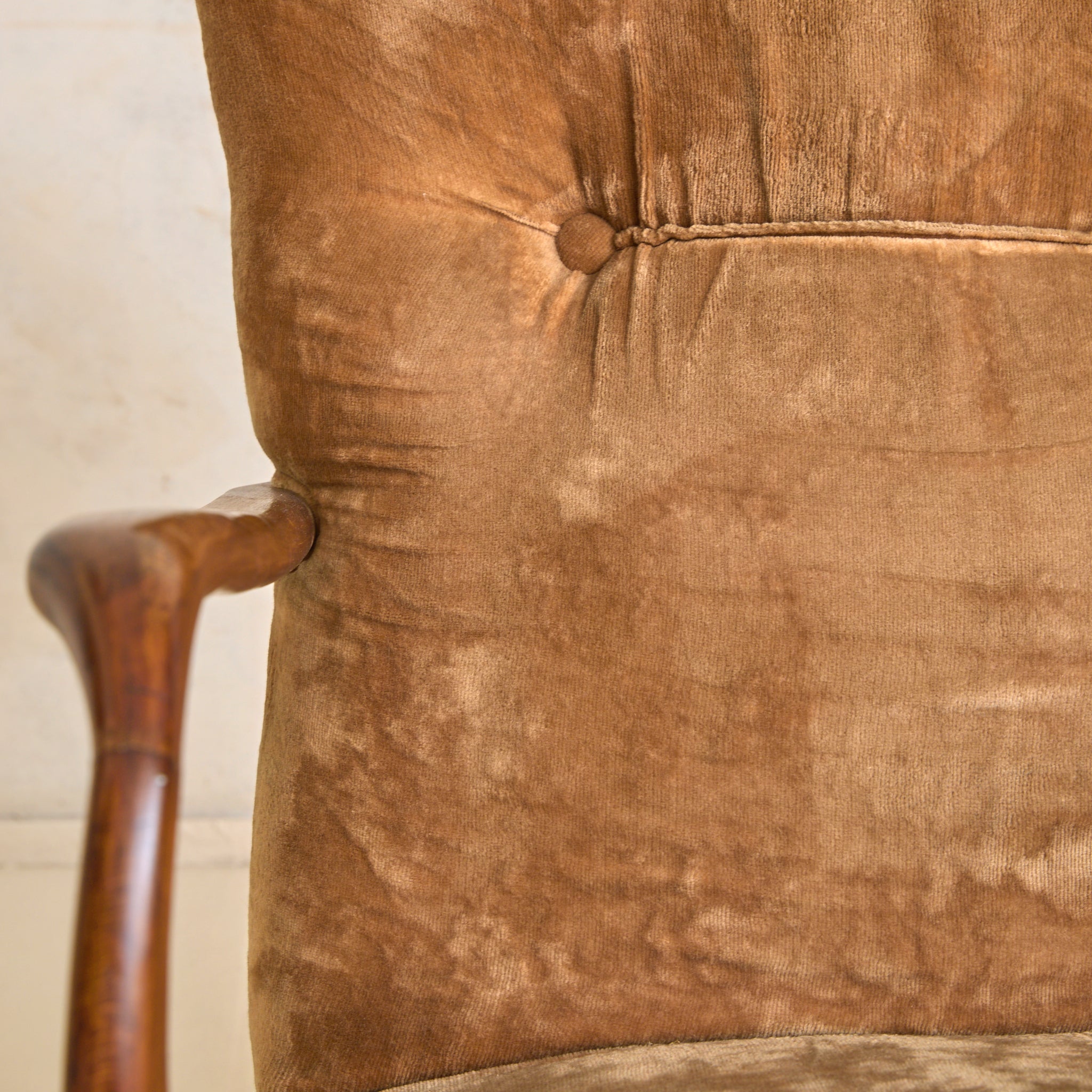 A 1960s Italian armchair, upholstered in original camel crushed velvet. The seat and high backrest are punctuated with button tufts, softening the silhouette with a tailored detail. Sculpted wooden arms extend in graceful curves, their warm patina complementing the sheen of the upholstery.