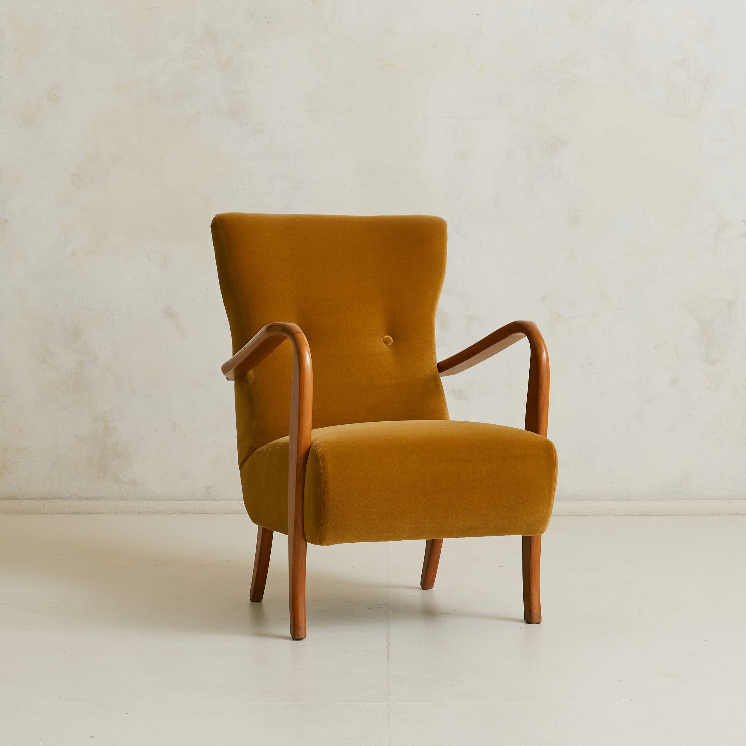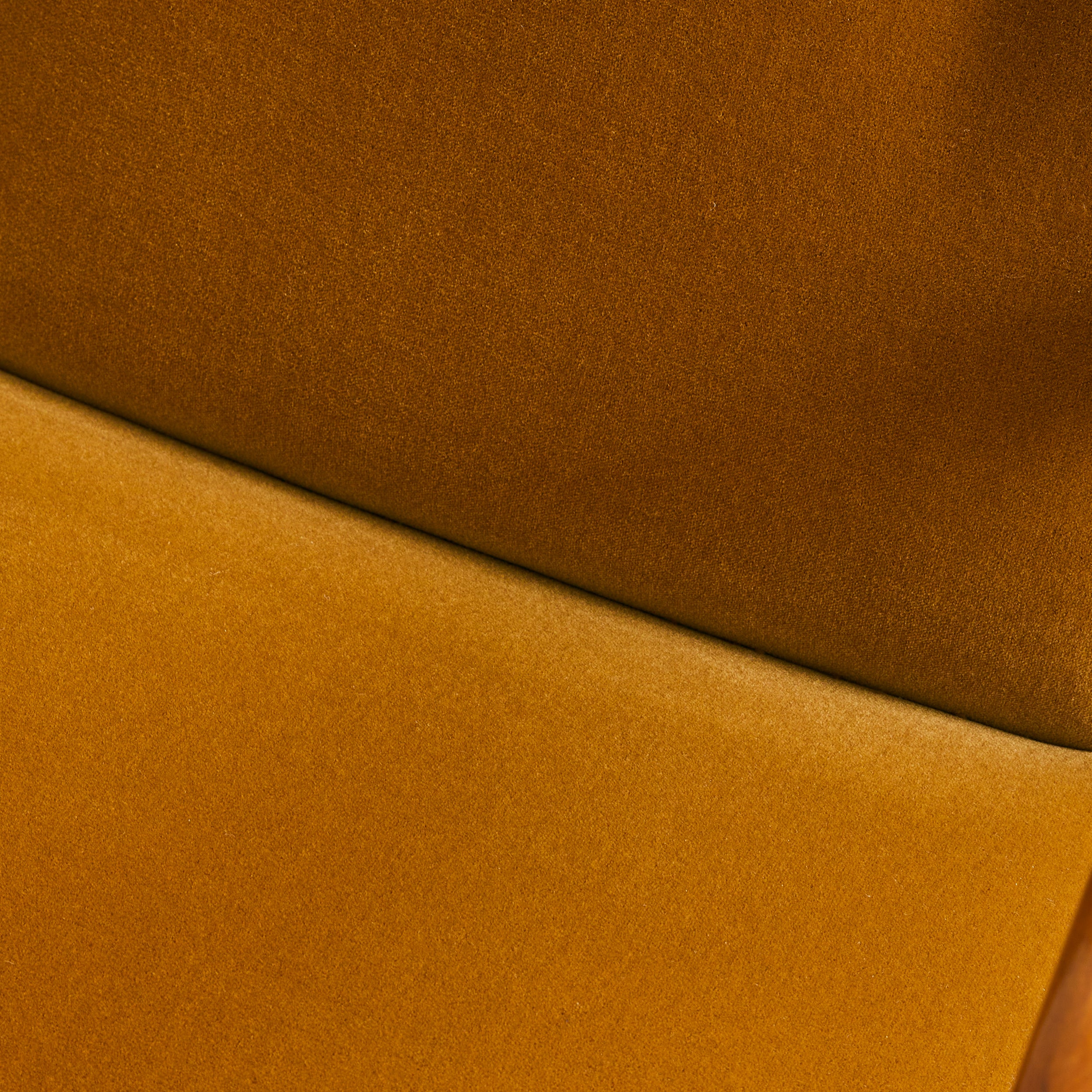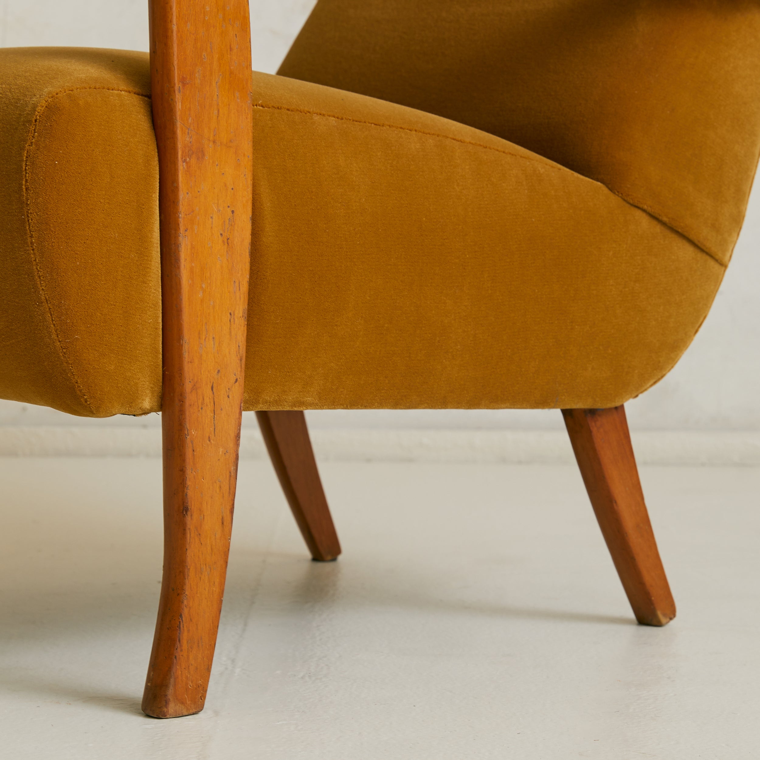A 1960s Italian armchair, newly reupholstered in luxurious cognac velvet. The seat and high backrest are punctuated with button tufts, softening the silhouette with a tailored detail. Sculpted wooden arms extend in graceful curves, their warm patina complementing the sheen of the upholstery.