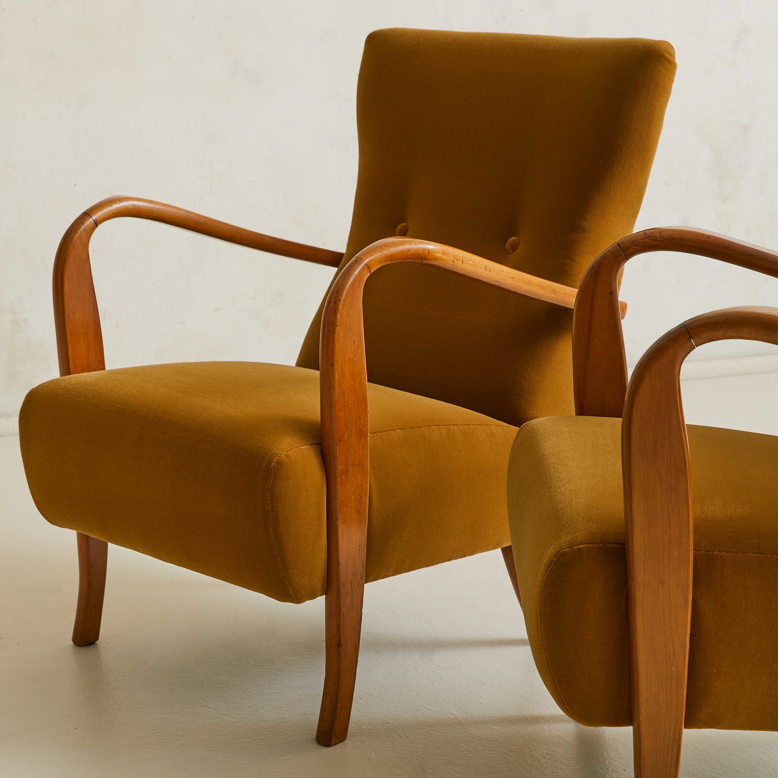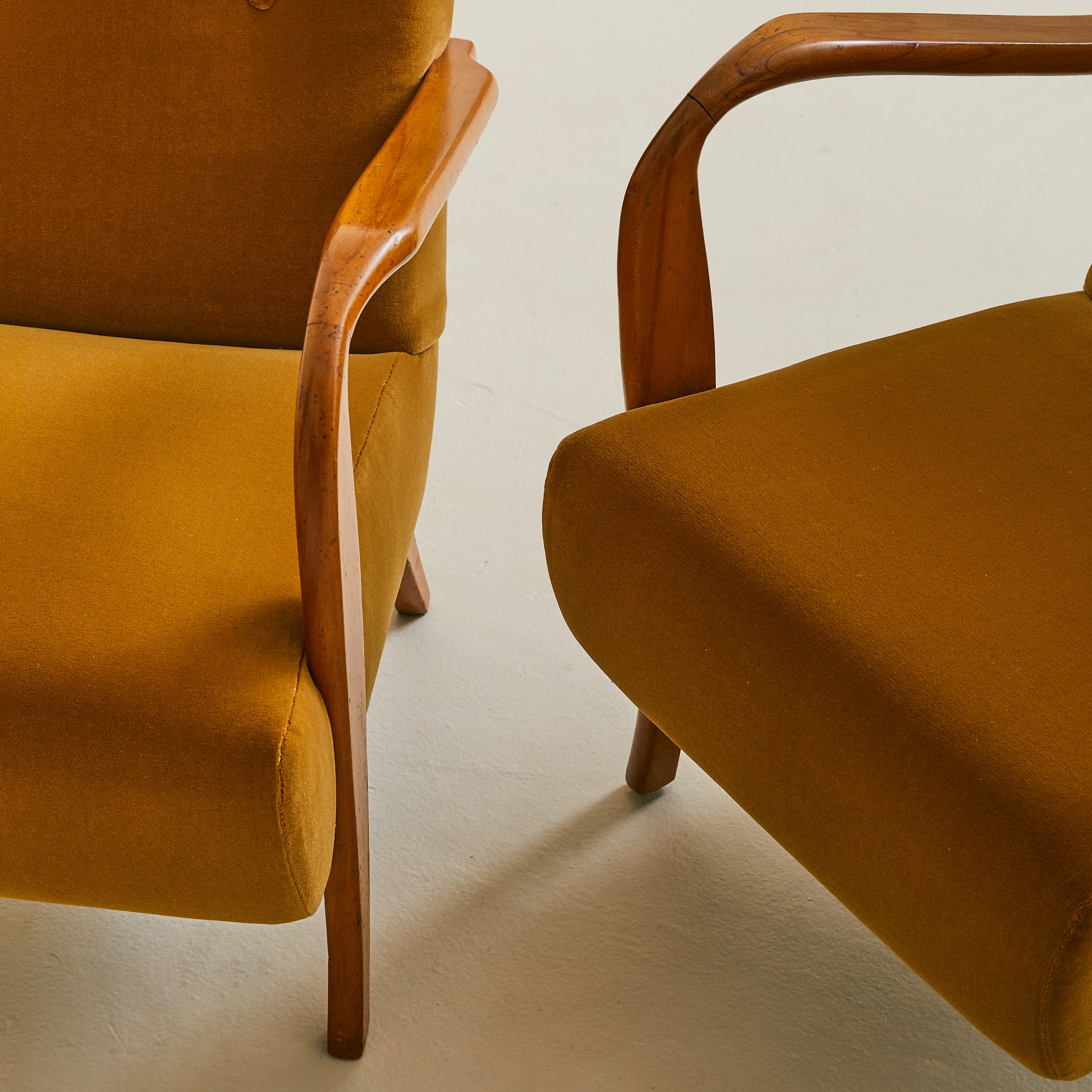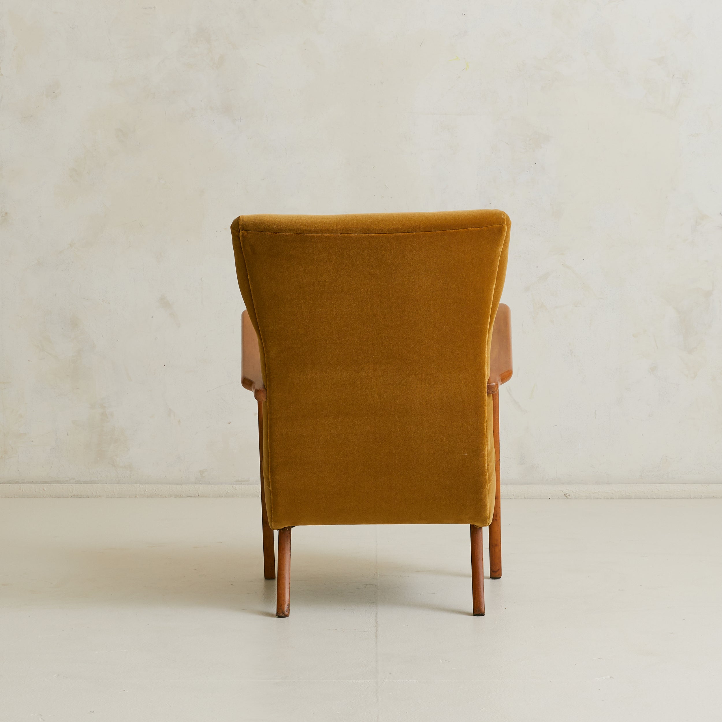 Italian Wood + Cognac Velvet Armchair, 1960s - 2 Available