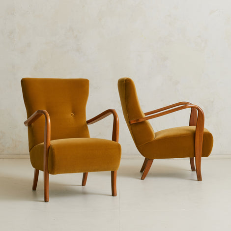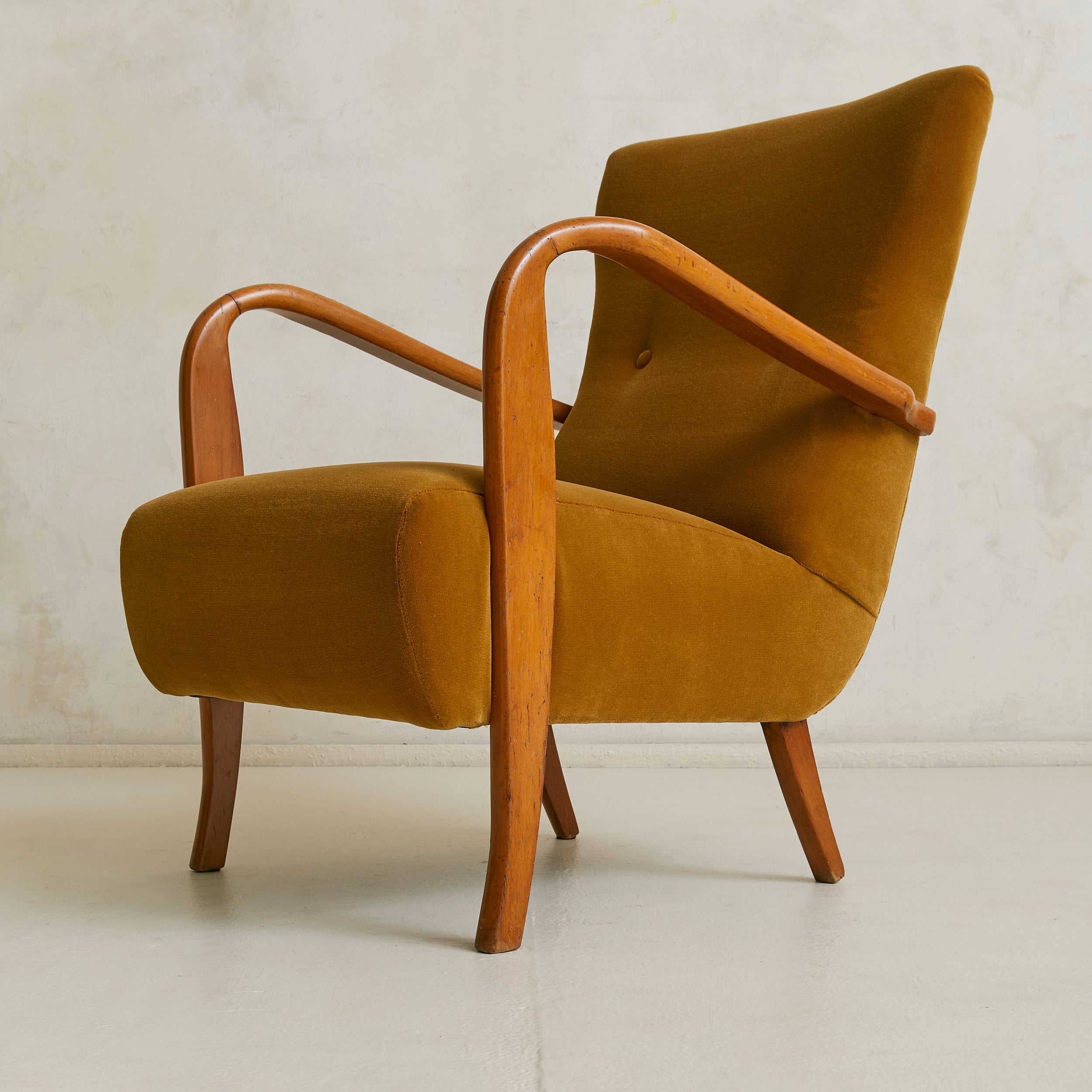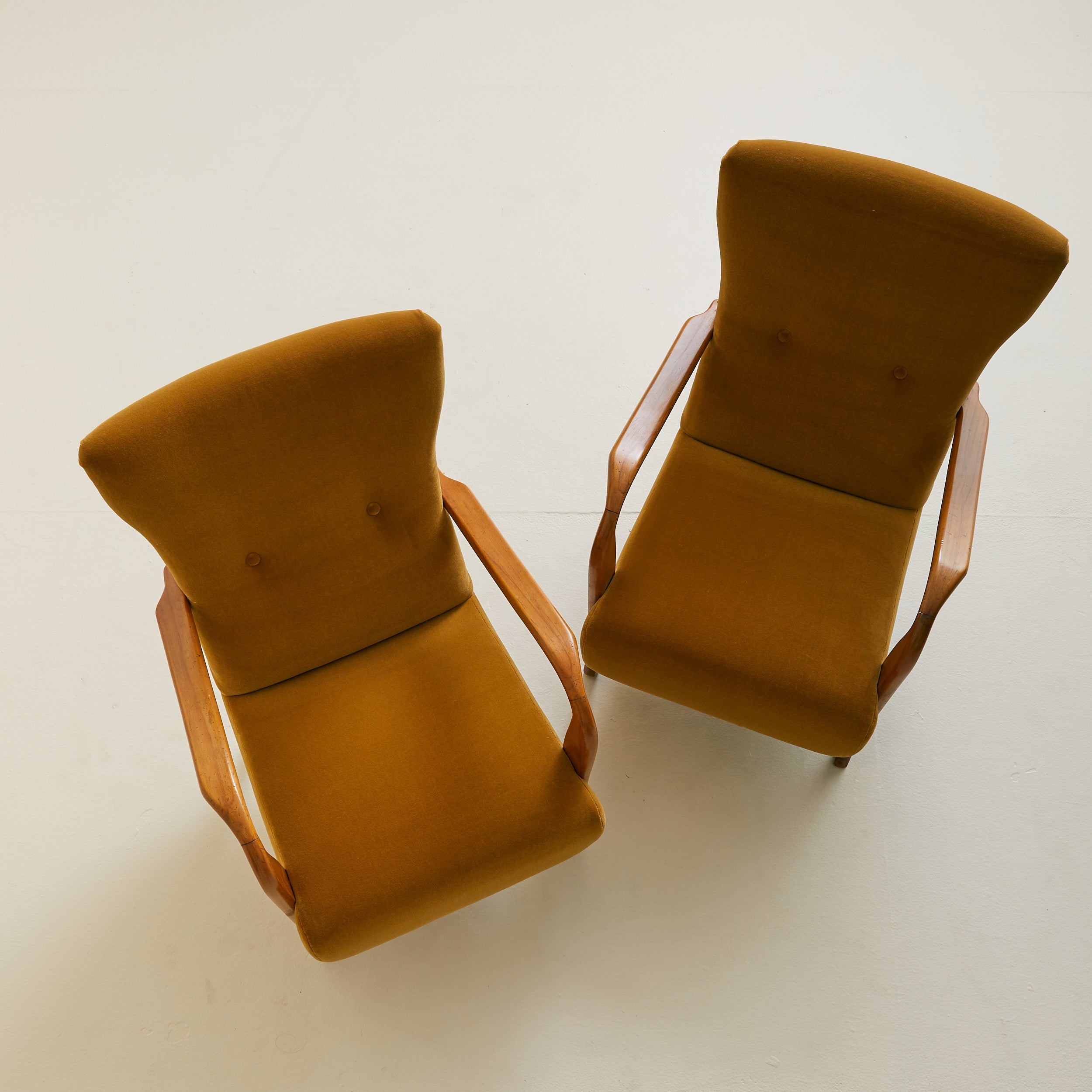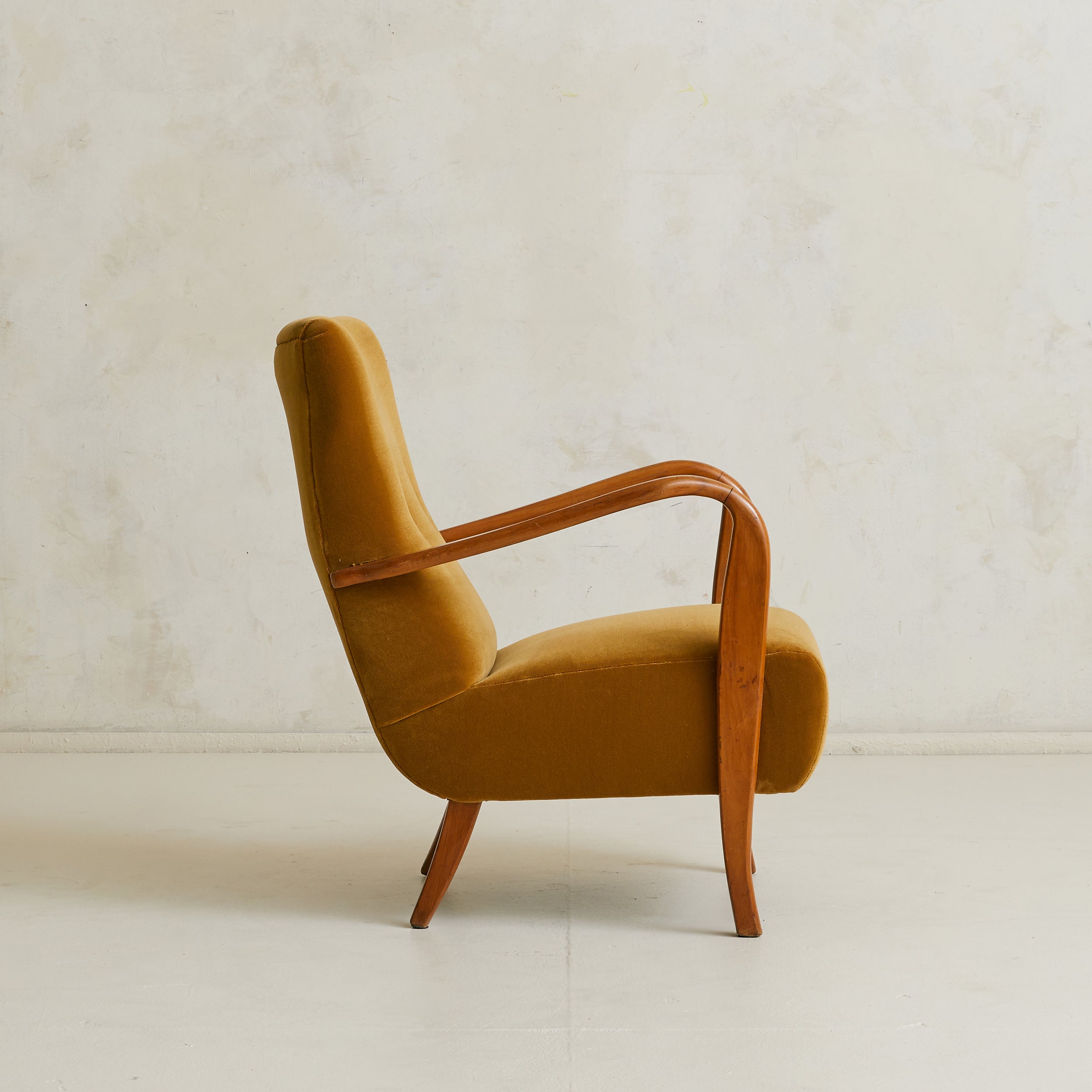 Italian Wood + Cognac Velvet Armchair, 1960s - 2 Available