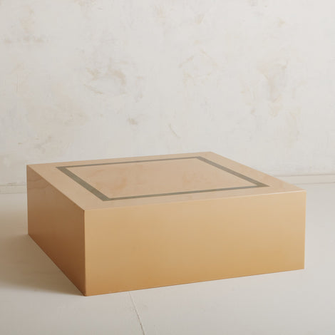 A lacquered cube coffee table sourced in France. This stunning table has a lovely amber hue and feature a patinated brass inlay. Late 20th Century.