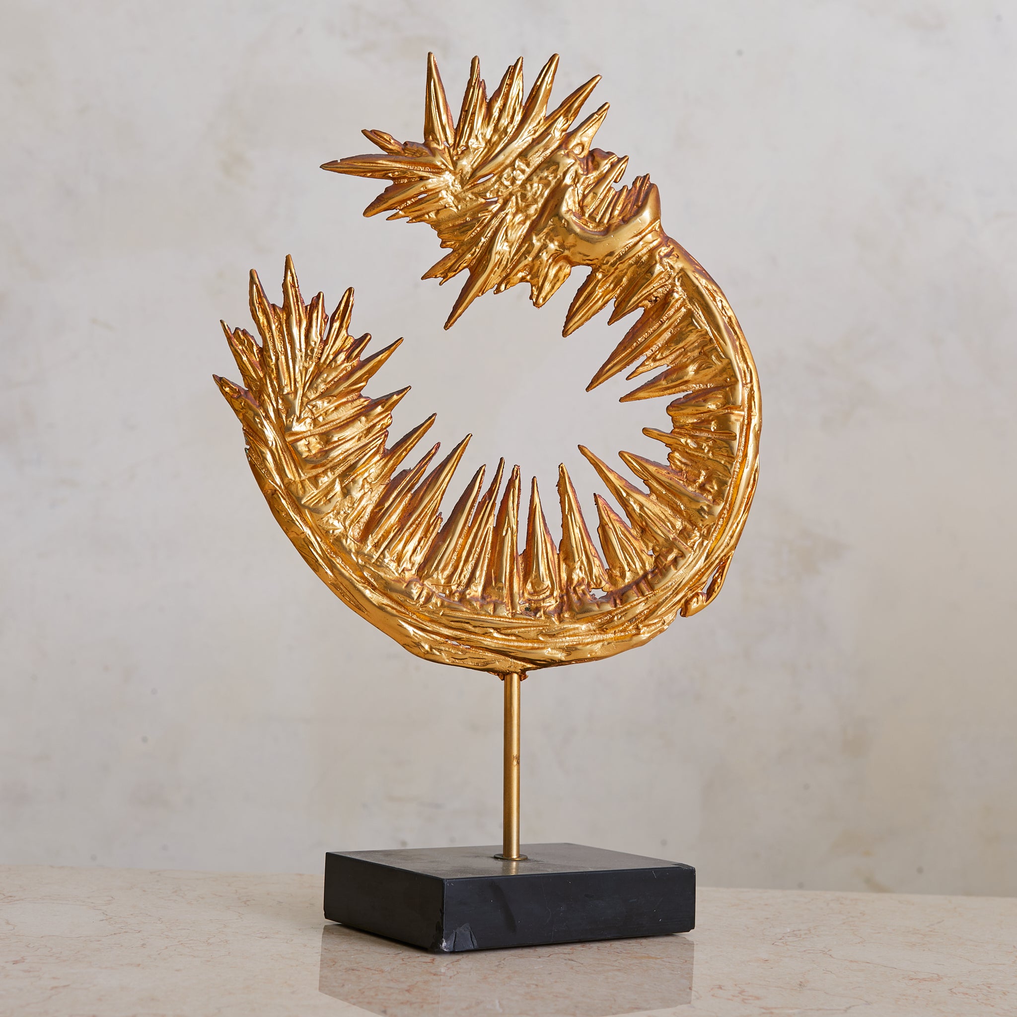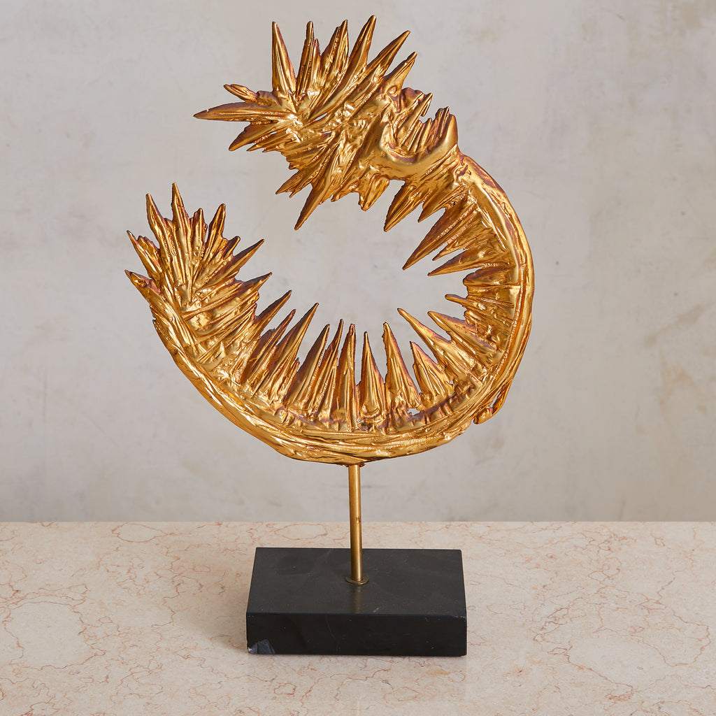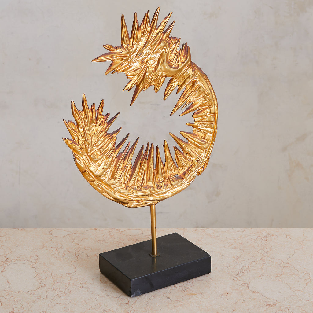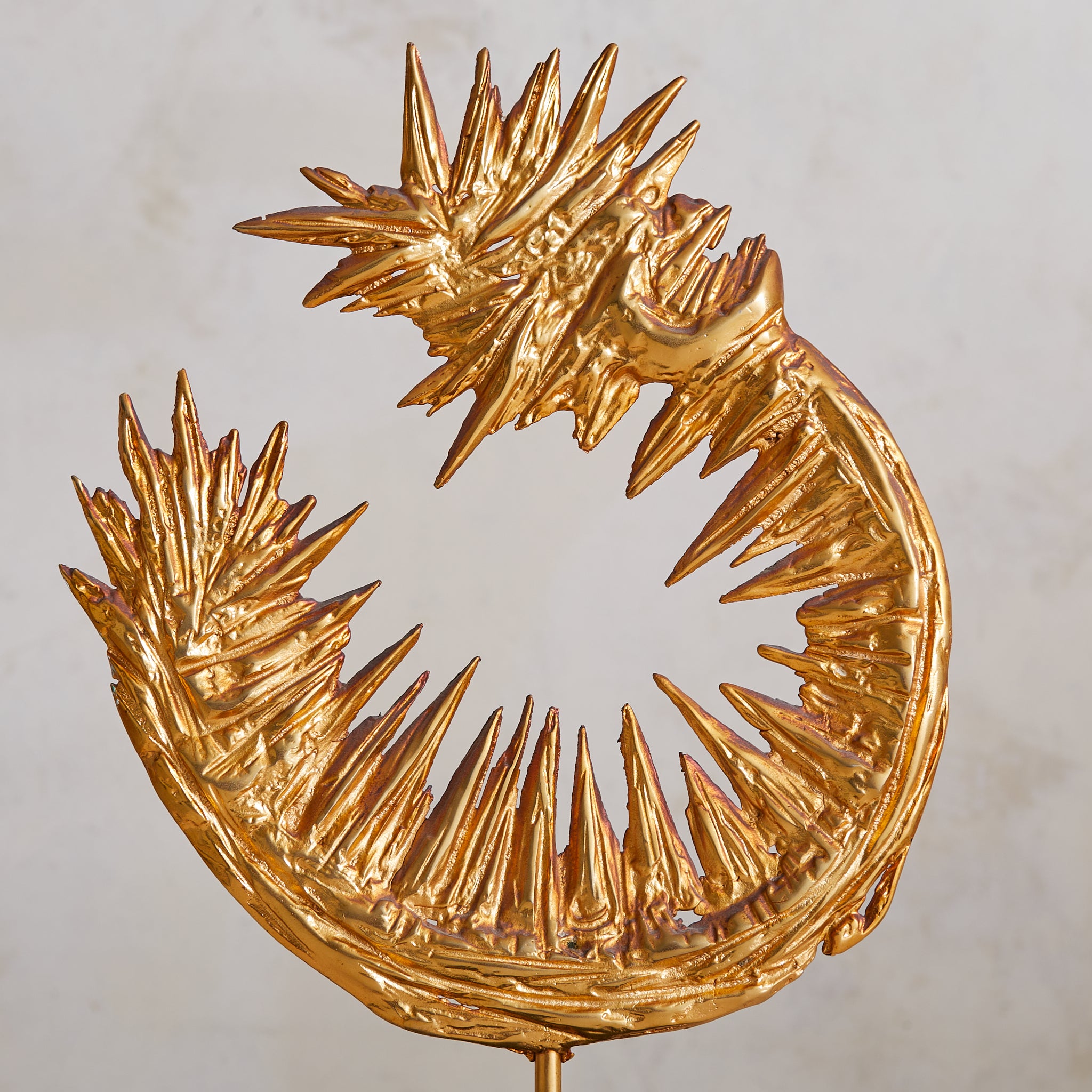 An abstract sculpture by French artist Philippe Cheverny, rendered in gilded metal. Its Brutalist form emerges from molten metal, poured and shaped into a freeform silhouette. Rests on a minimalist, rectangular base.