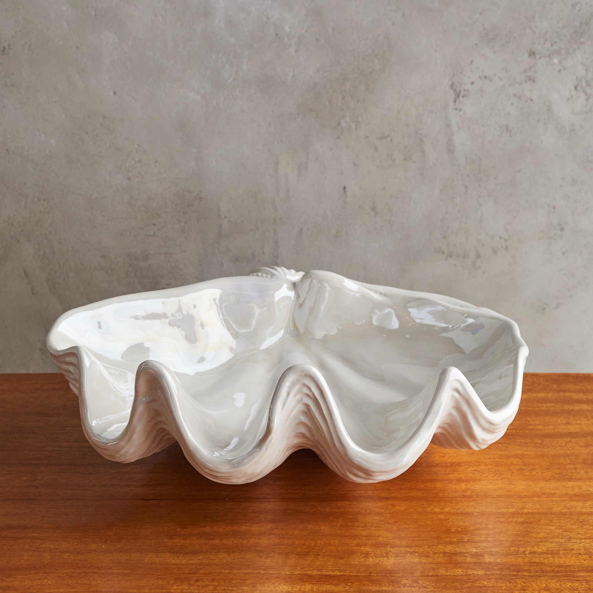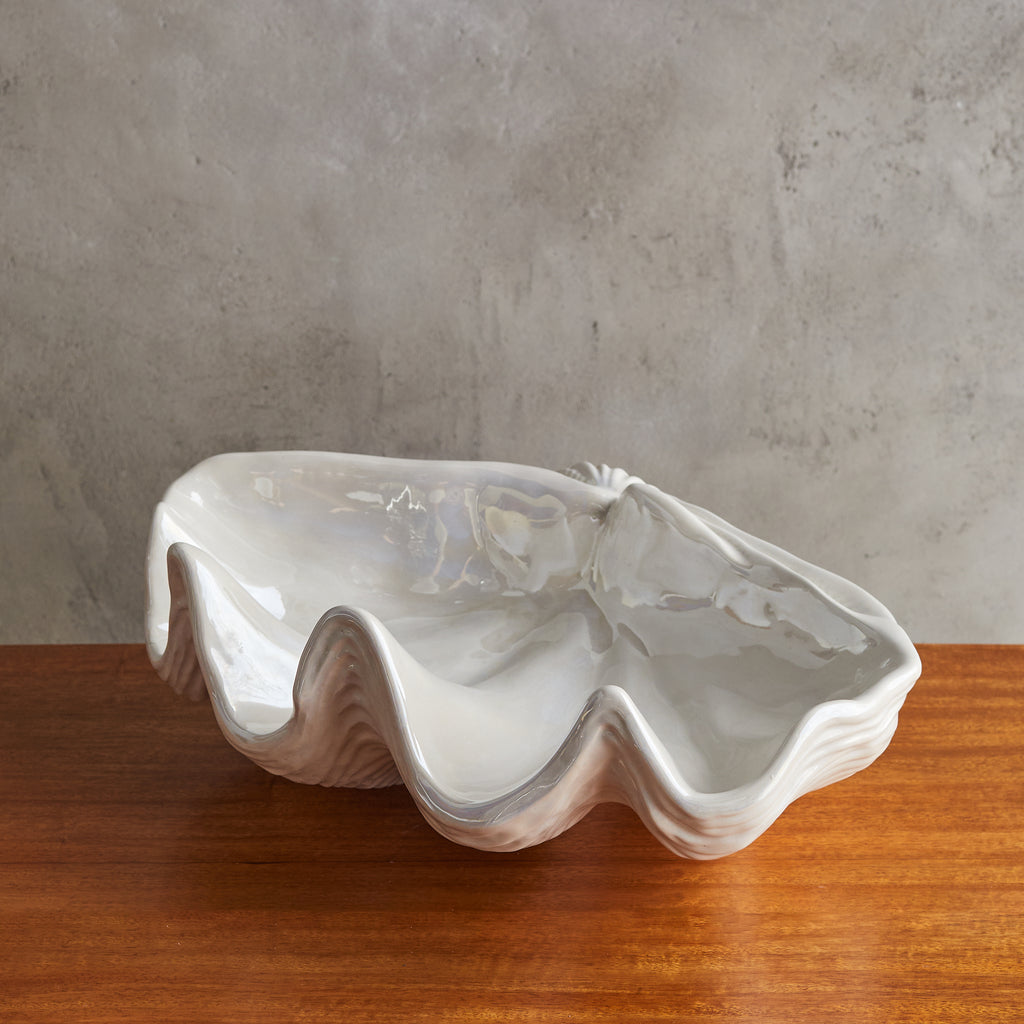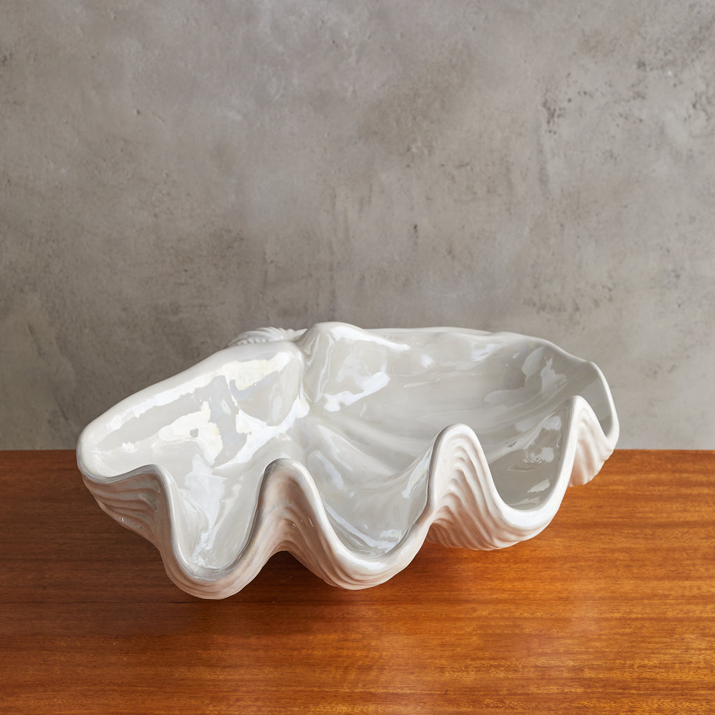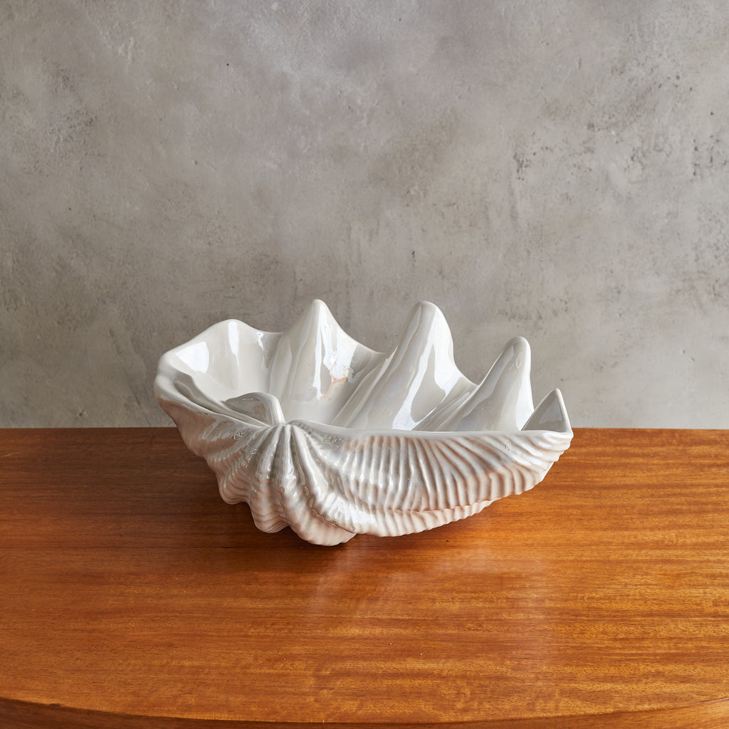 A large French ceramic shell bowl from the 1970s, echoing the organic grandeur of the sea. Its sculptural, undulating form is accentuated by a glossy ivory glaze that catches the light like rippling water. Signed along the underside.