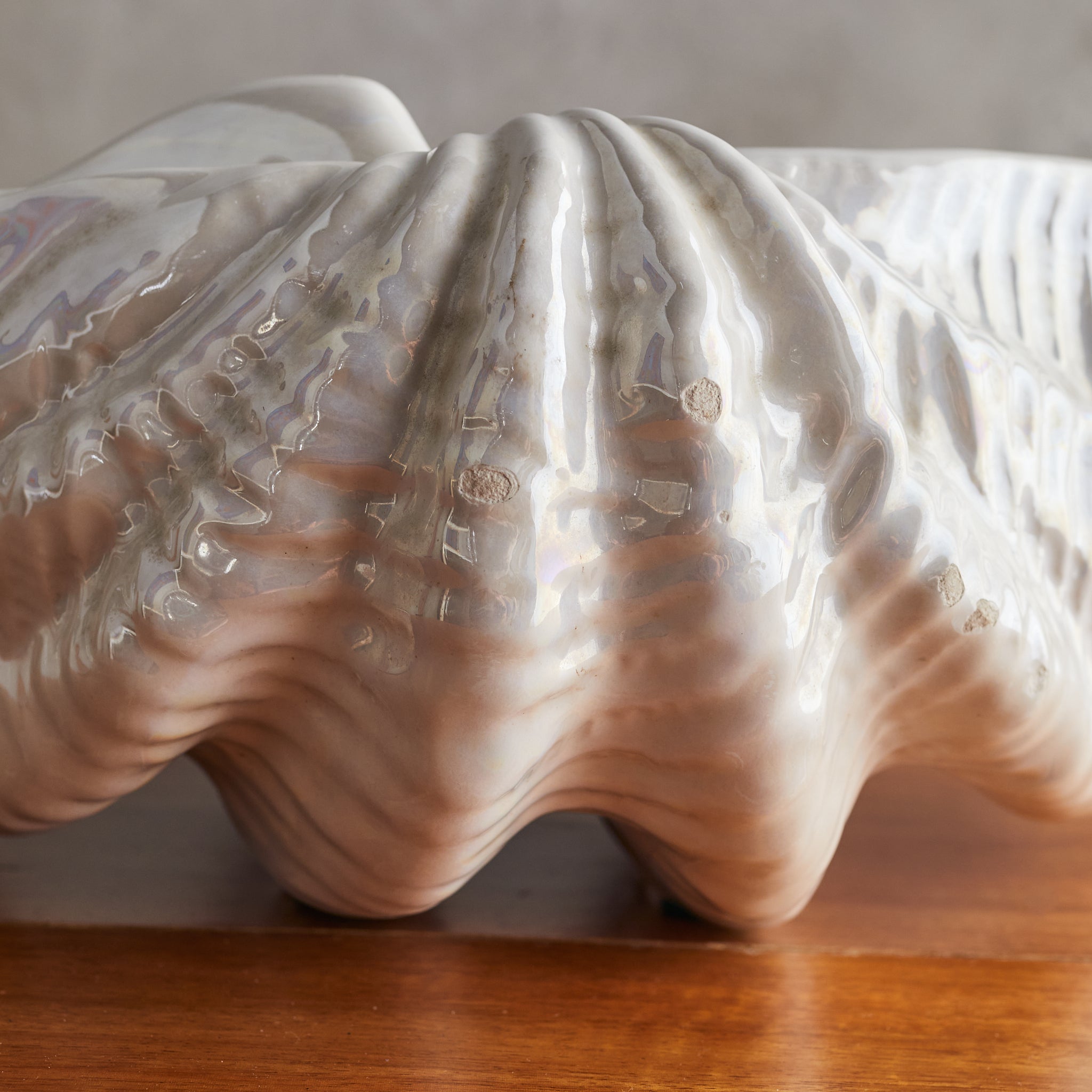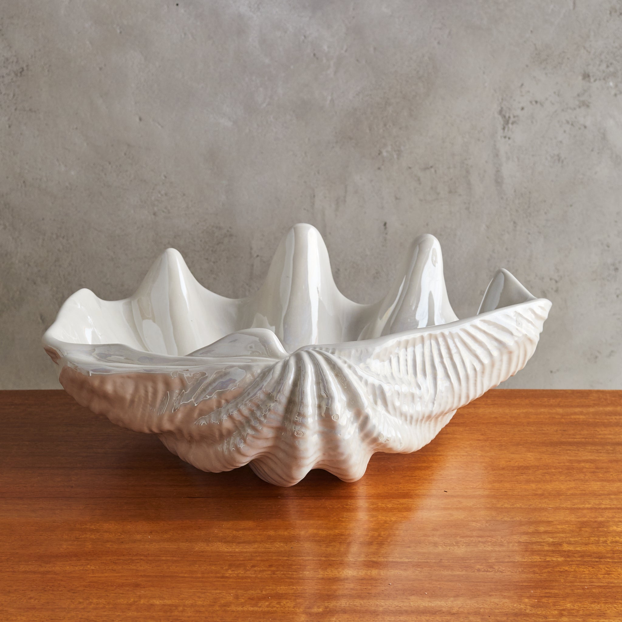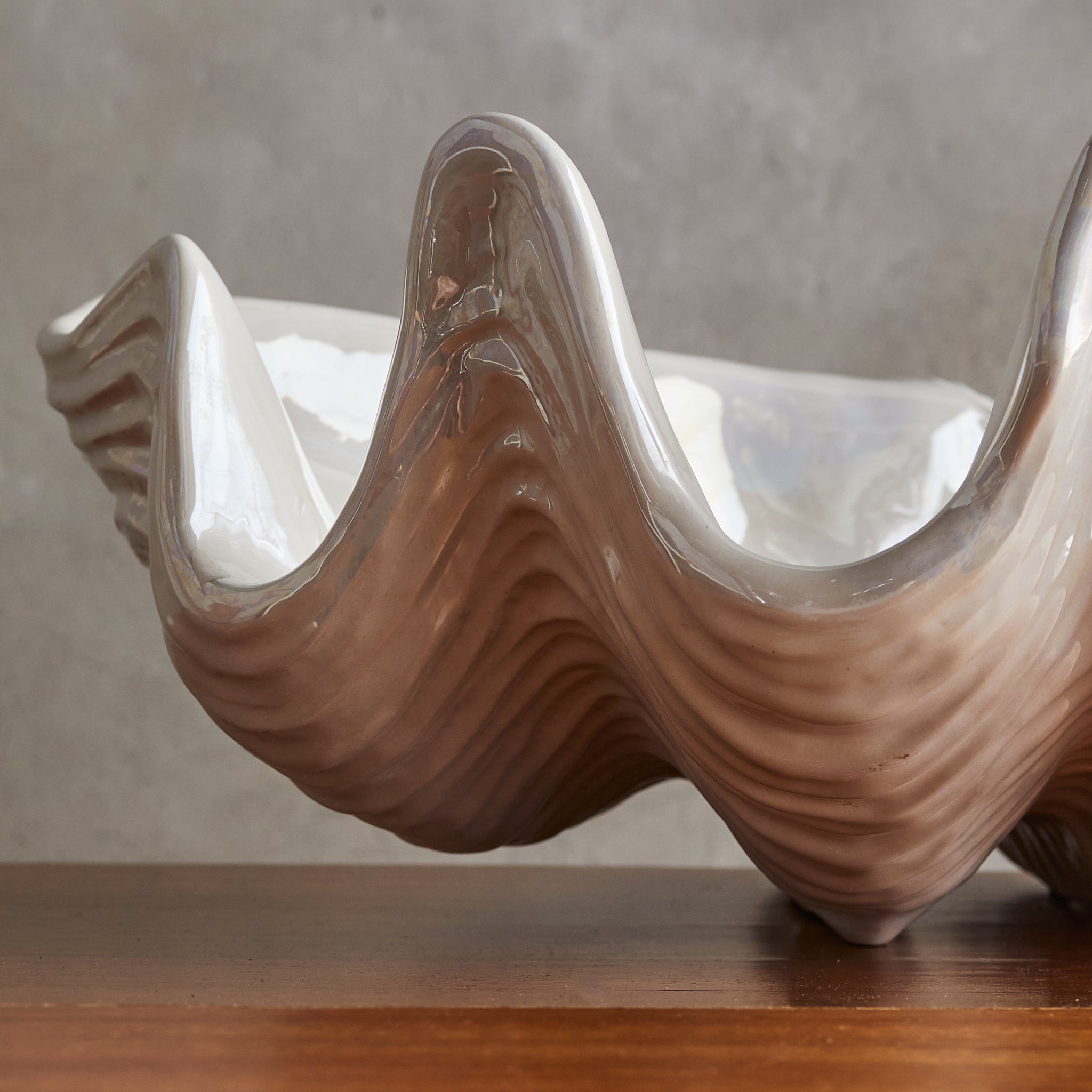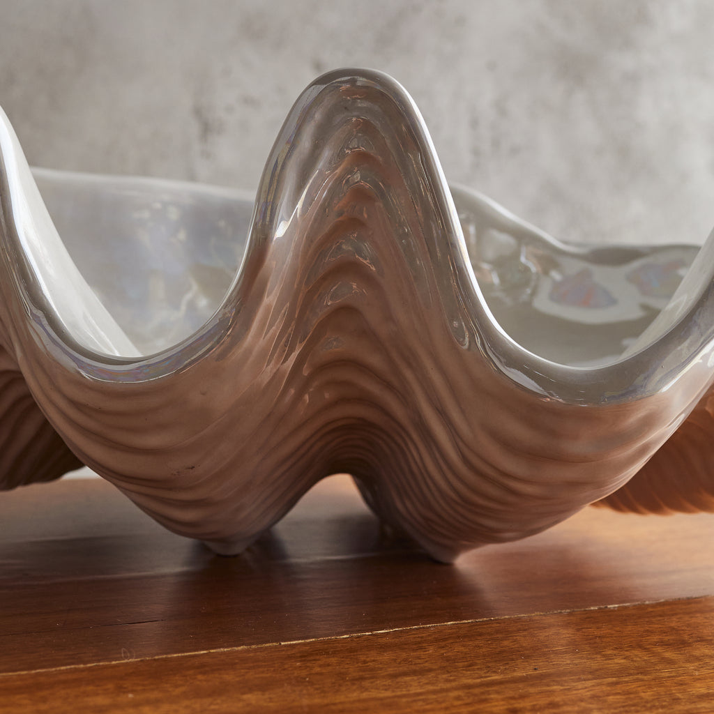 A large French ceramic shell bowl from the 1970s, echoing the organic grandeur of the sea. Its sculptural, undulating form is accentuated by a glossy ivory glaze that catches the light like rippling water. Signed along the underside.