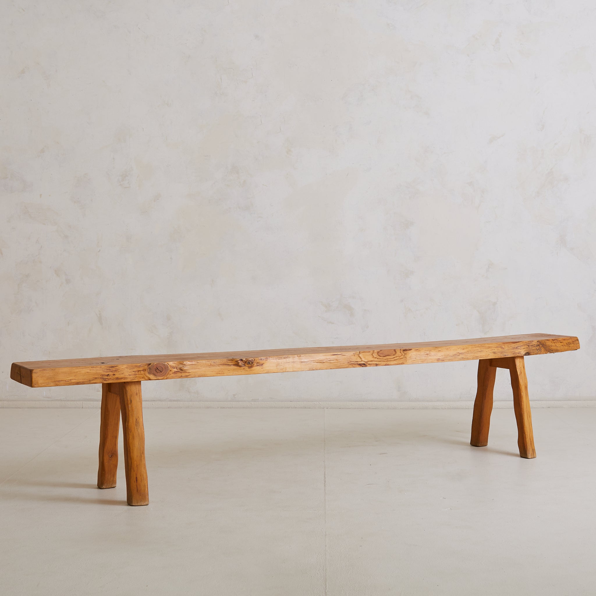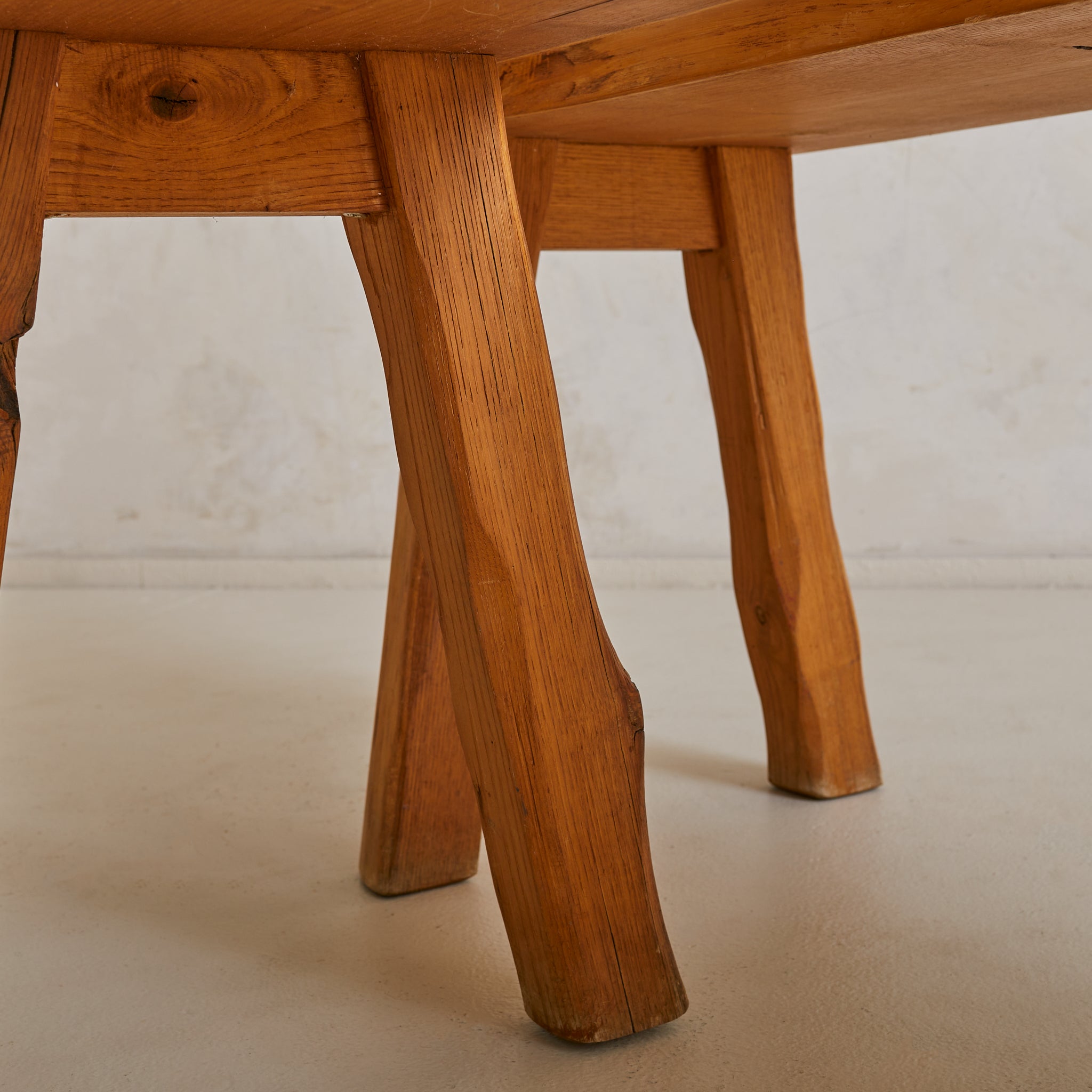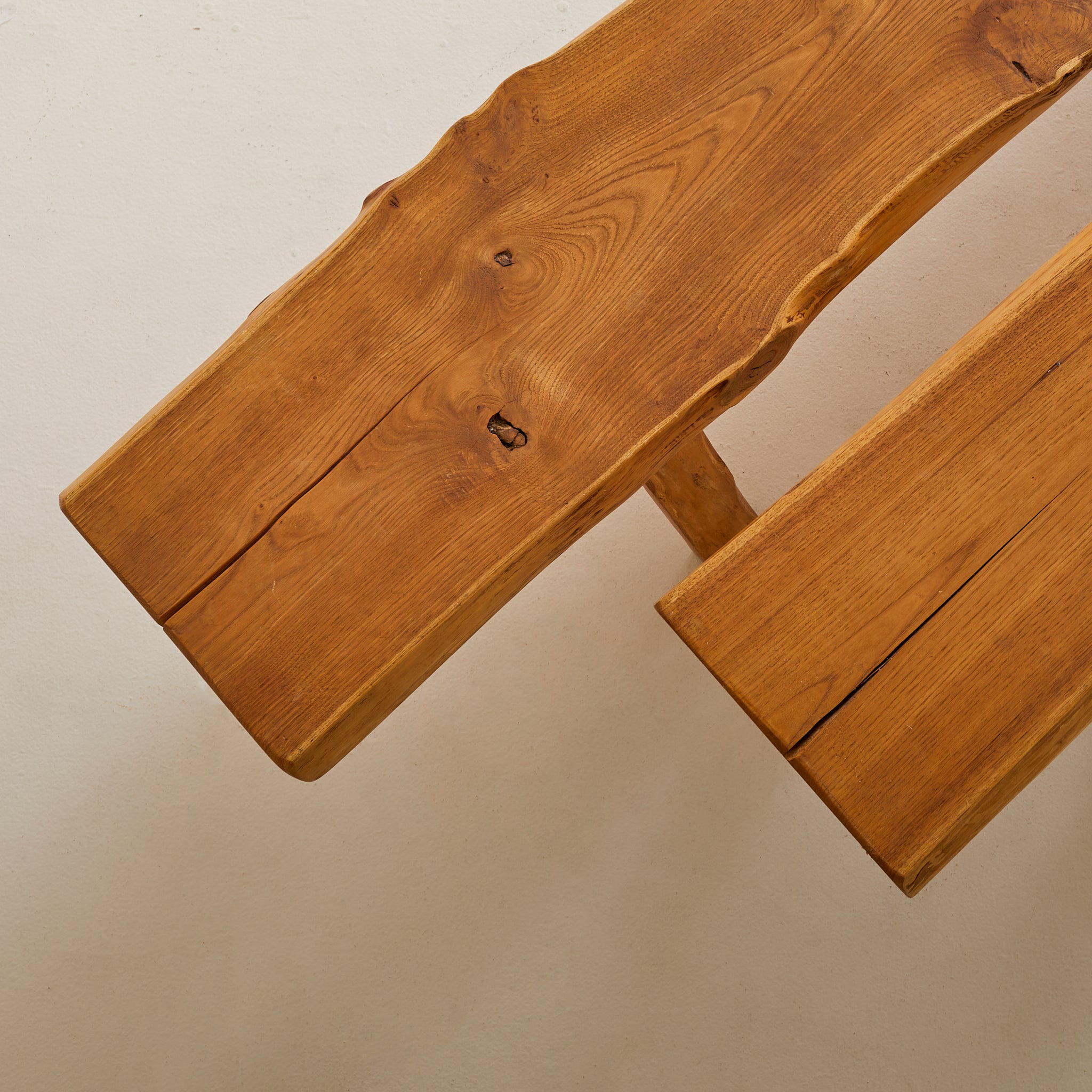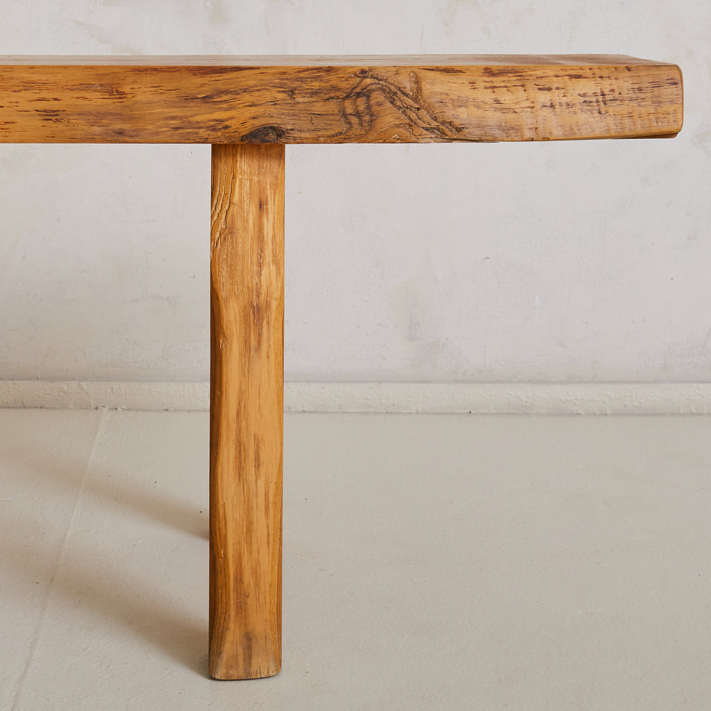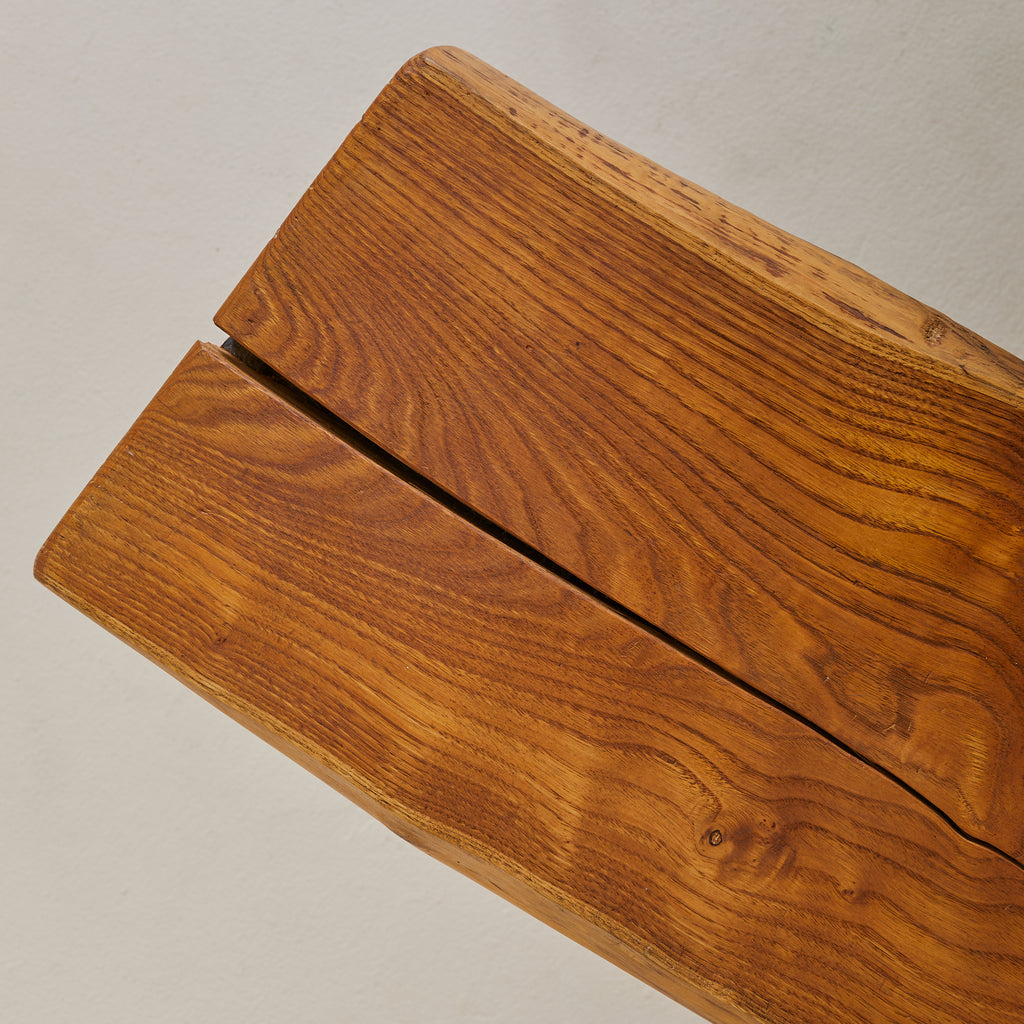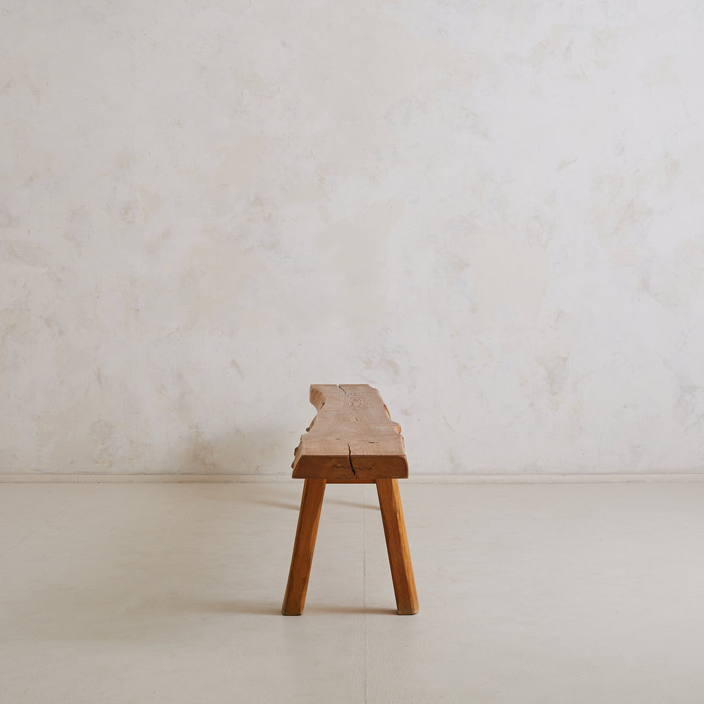 This large French bench from the 1960s is hewn entirely from solid wood, its form carved by hand and intuition. Featuring an irregular silhouette and subtly tapered legs, it showcases a raw finish that retains the honesty of the material—knots, grain, and tonal variation are celebrated rather than concealed.
