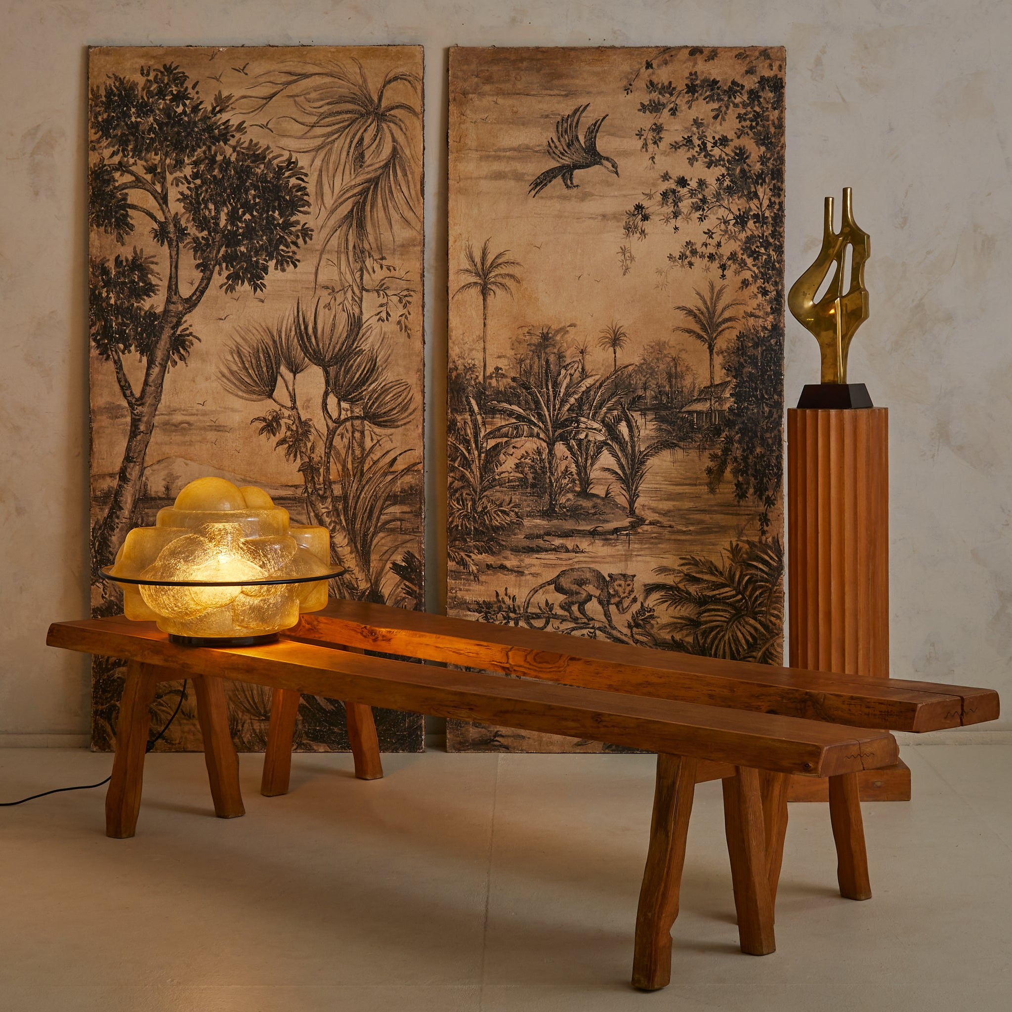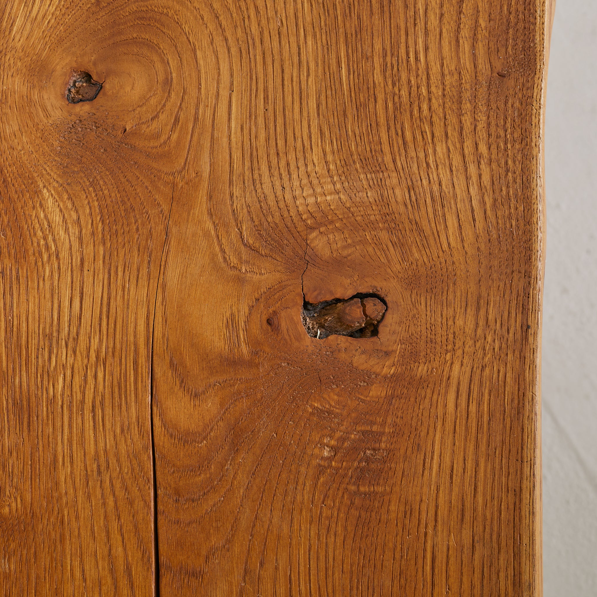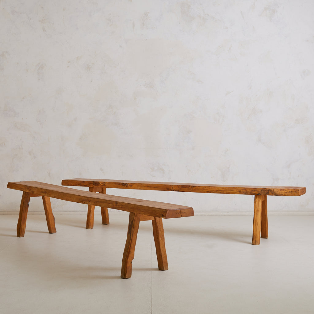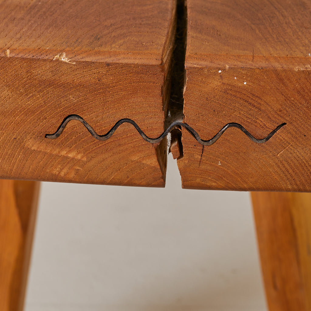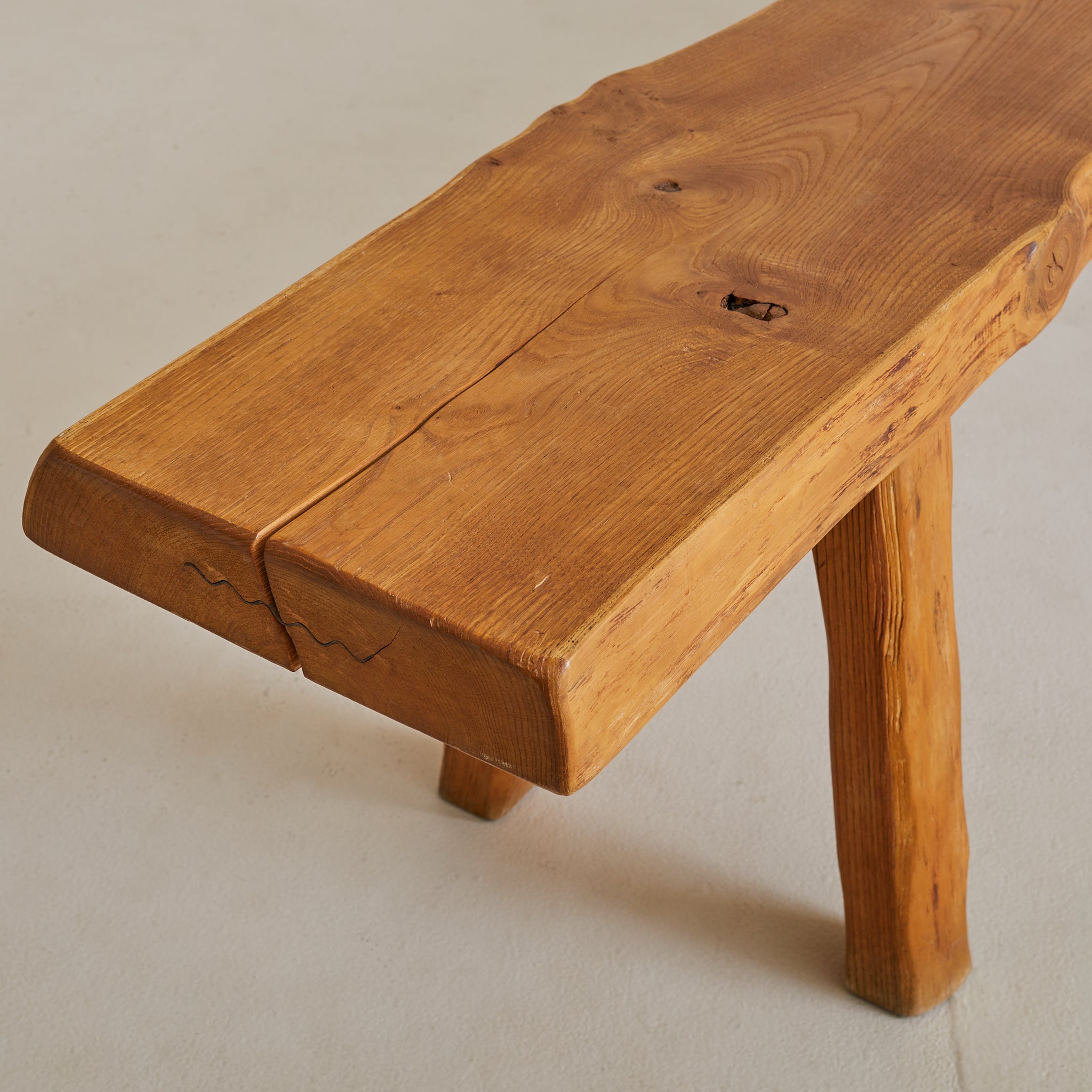 This large French bench from the 1960s is hewn entirely from solid wood, its form carved by hand and intuition. Featuring an irregular silhouette and subtly tapered legs, it showcases a raw finish that retains the honesty of the material—knots, grain, and tonal variation are celebrated rather than concealed.