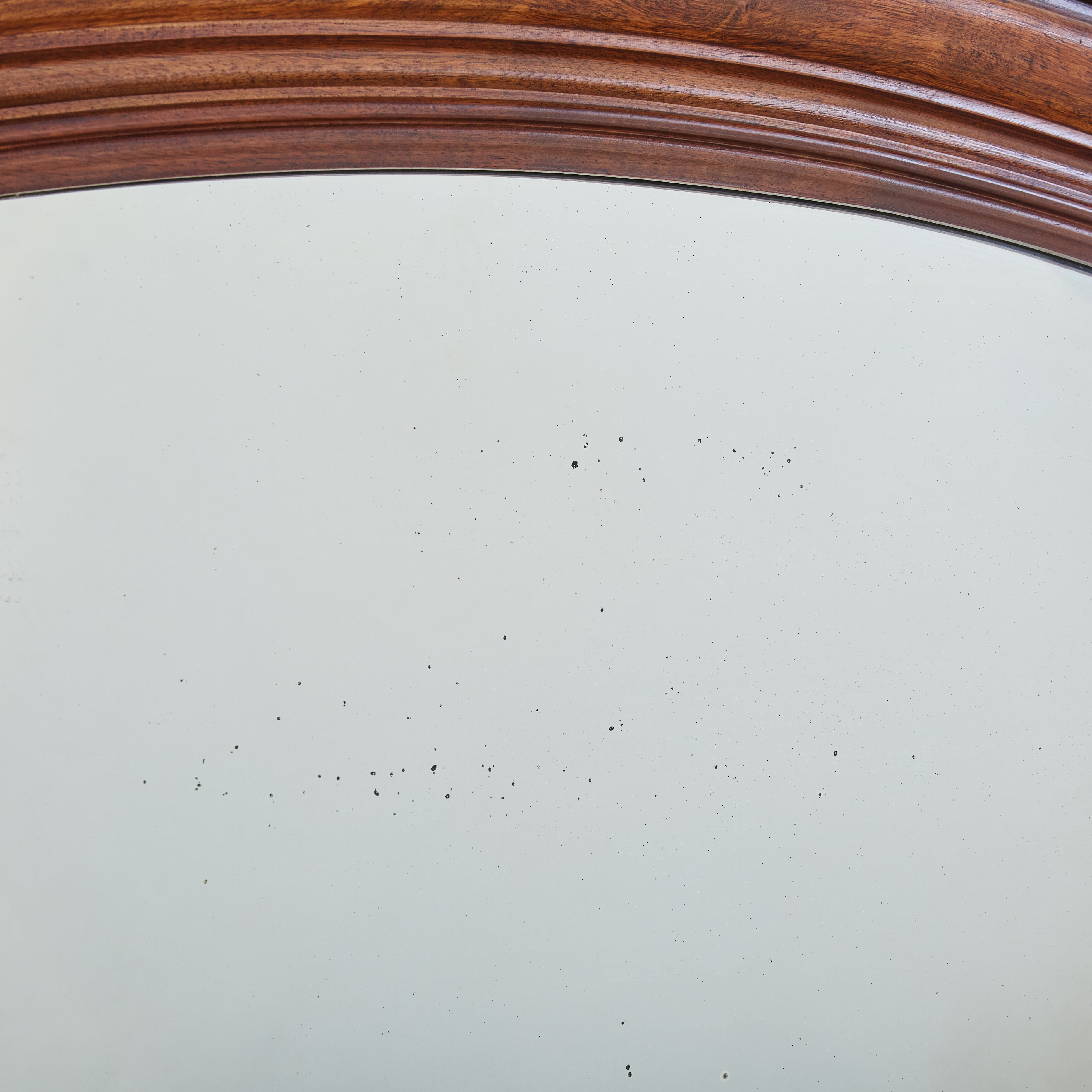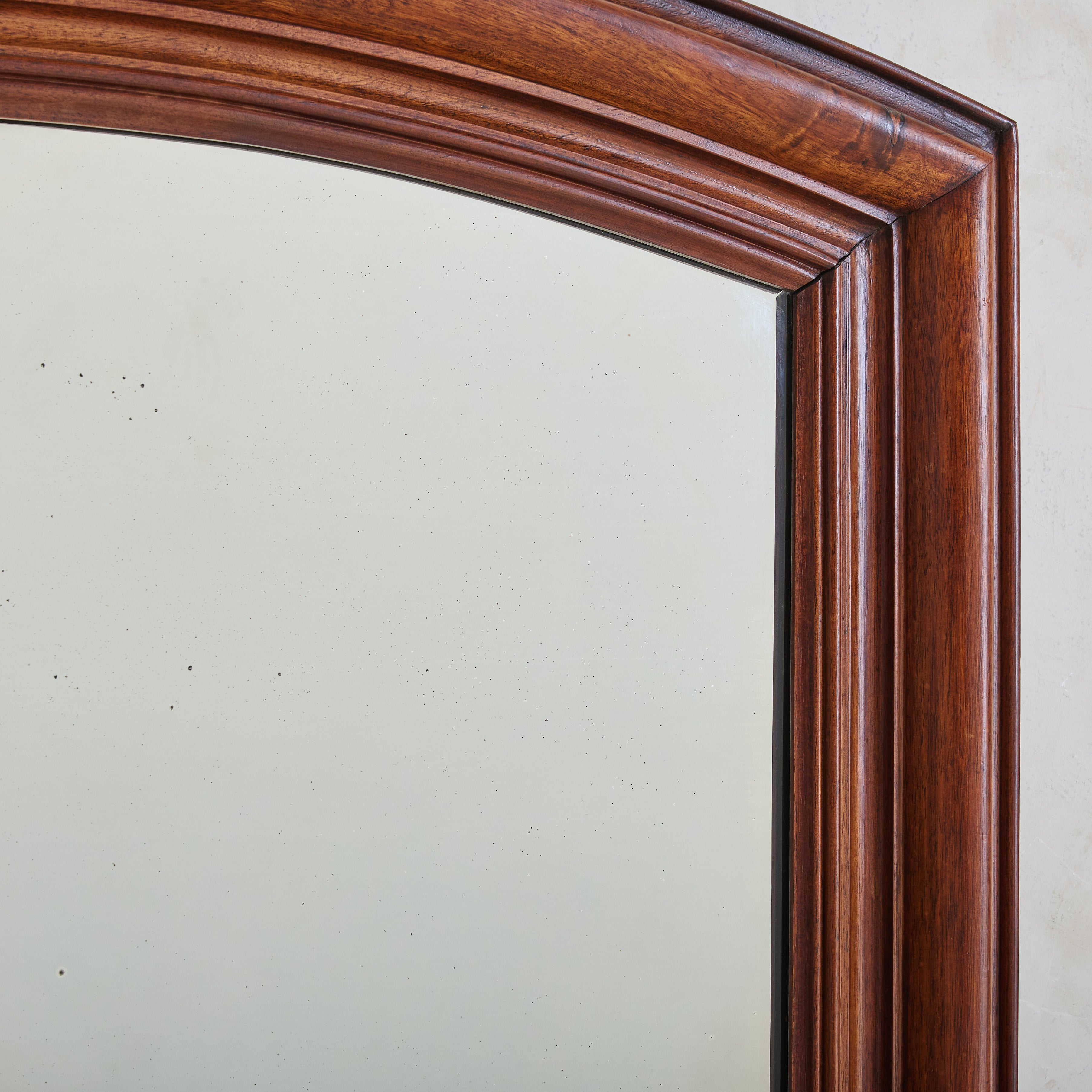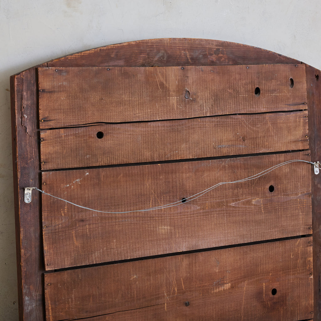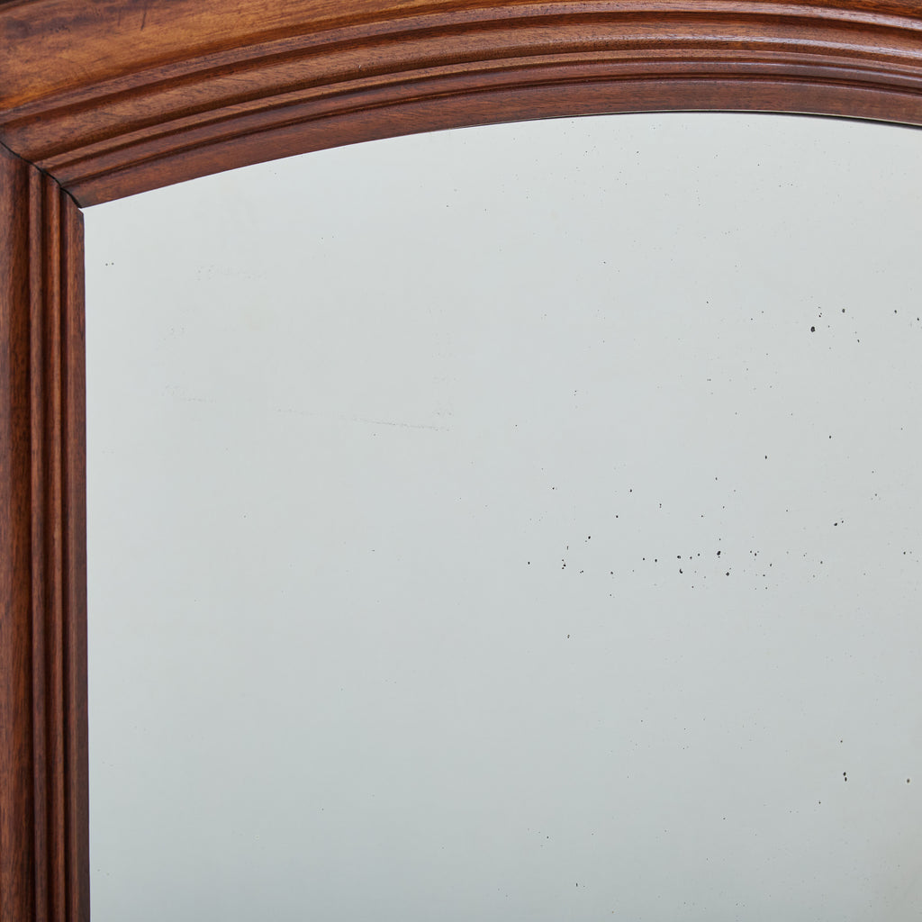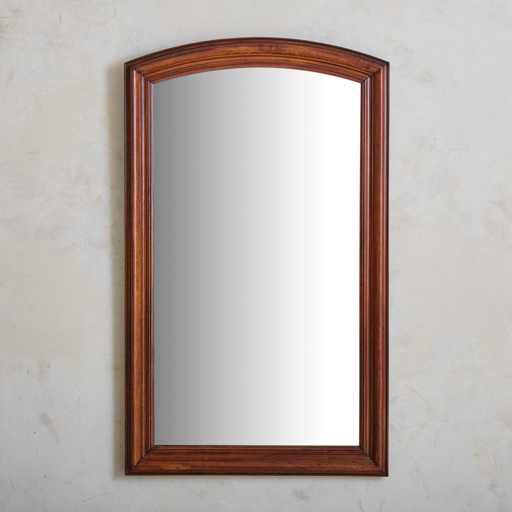 Crafted in France over one hundred years ago, this early 20th-century mirror has a stately arched solid walnut frame accented with hand-carved details. At 4.5 feet tall, the mirror’s generous proportions make it well suited to hang above a fireplace, in a hallway, or over a bed.