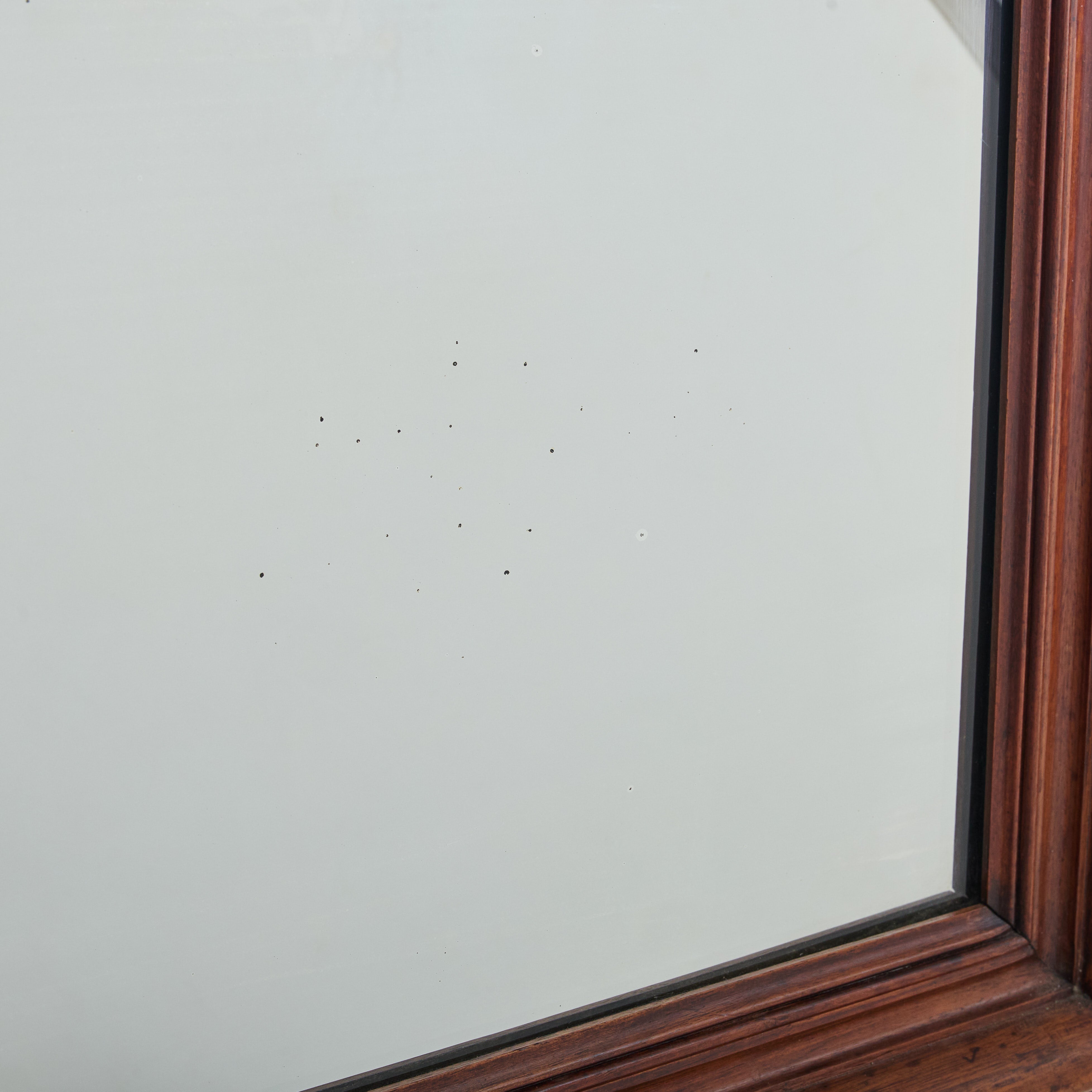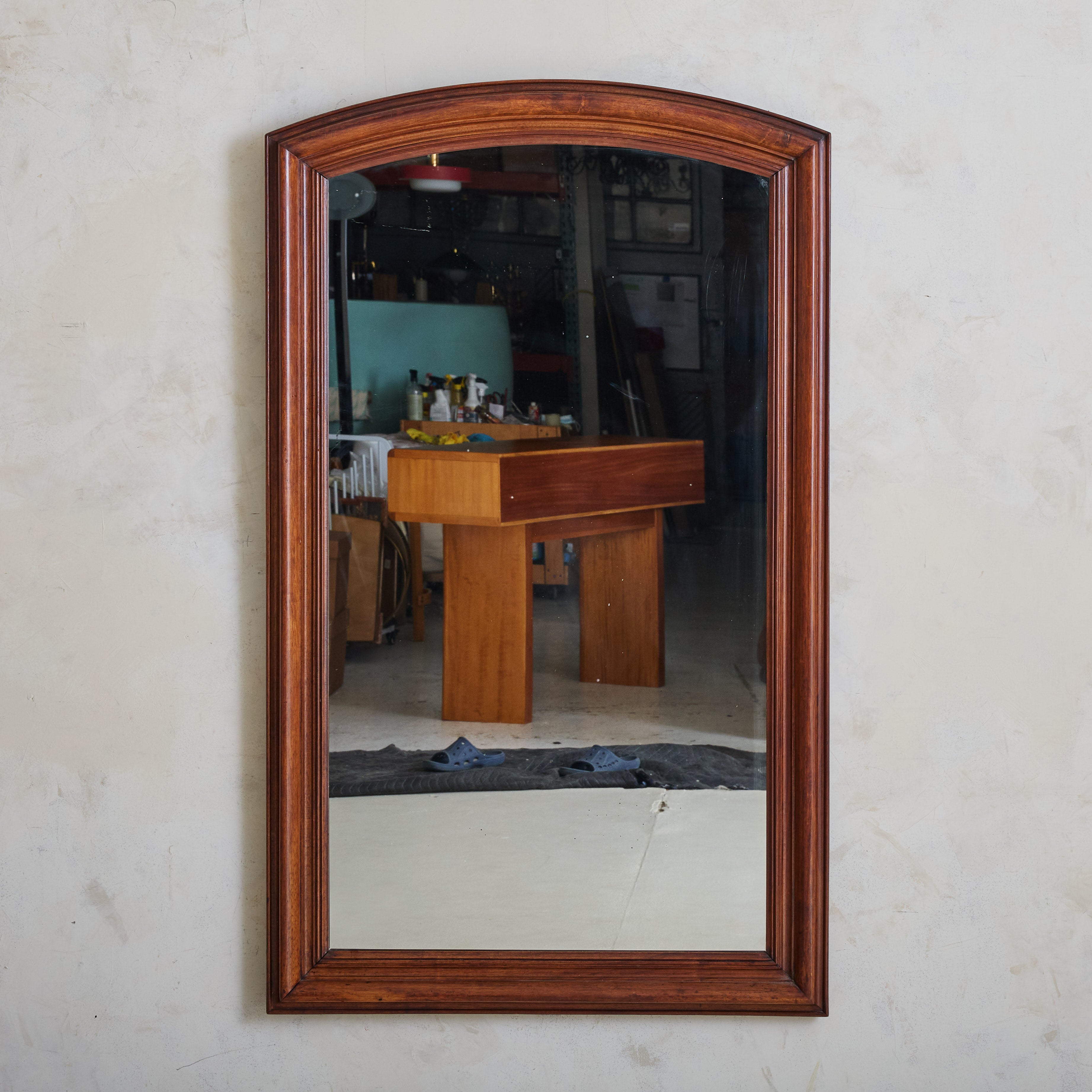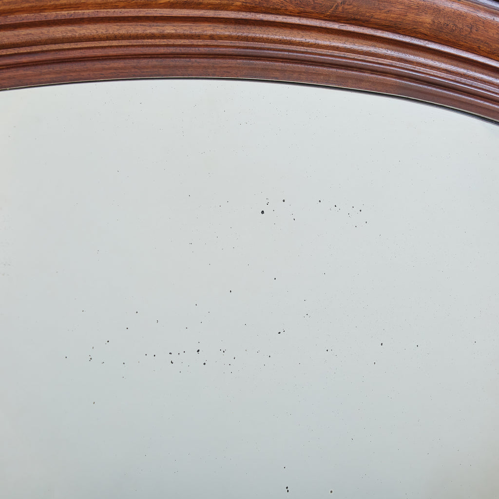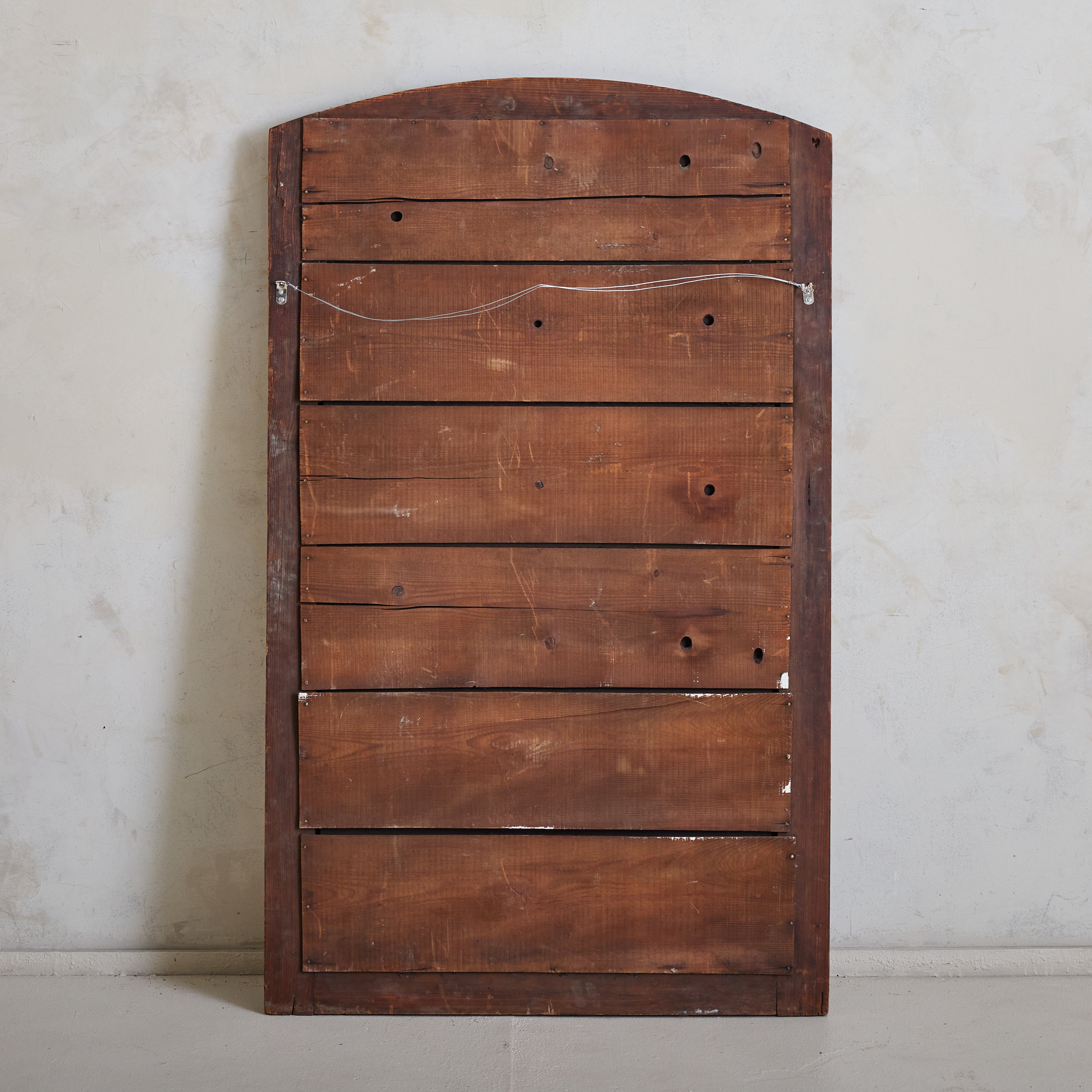 Crafted in France over one hundred years ago, this early 20th-century mirror has a stately arched solid walnut frame accented with hand-carved details. At 4.5 feet tall, the mirror’s generous proportions make it well suited to hang above a fireplace, in a hallway, or over a bed.