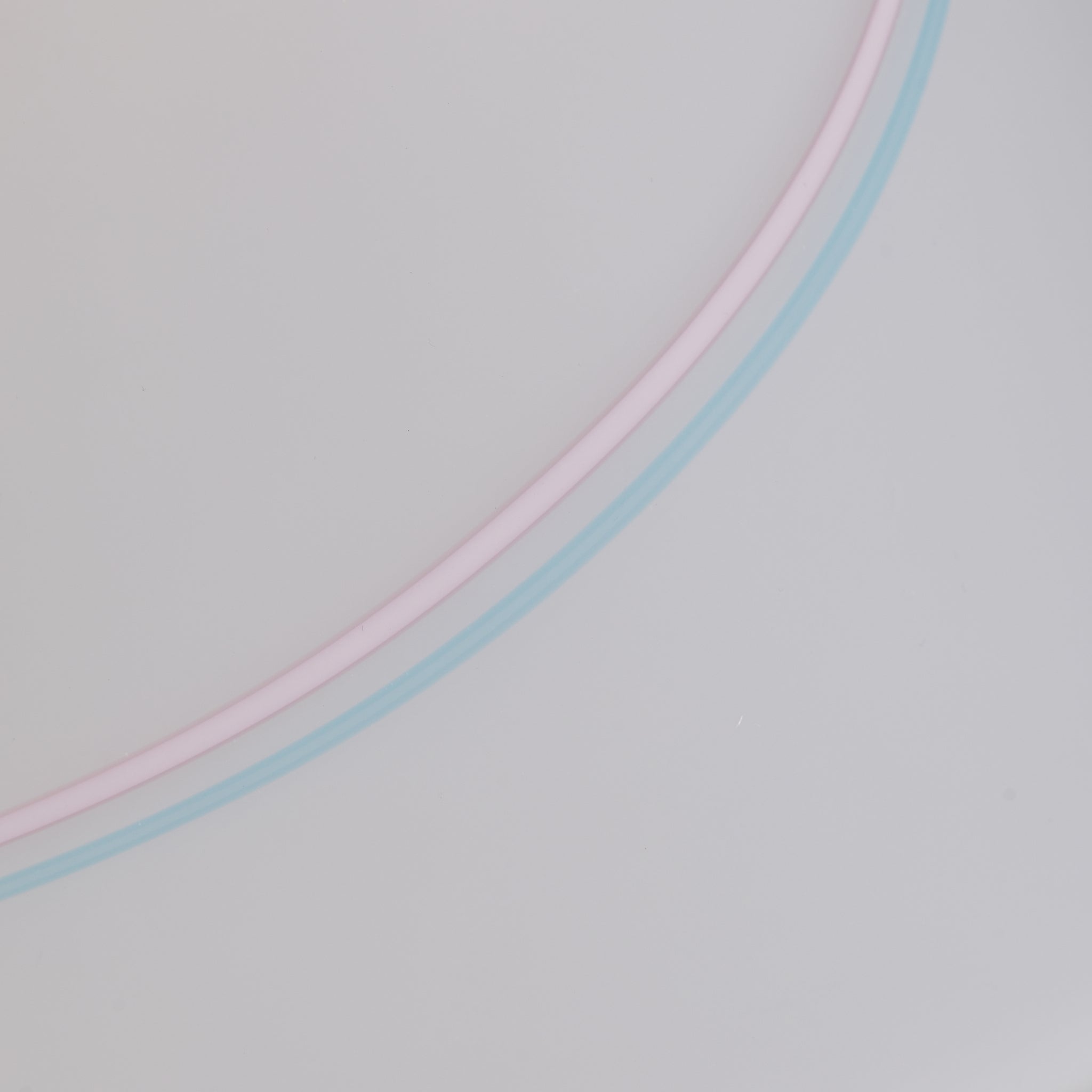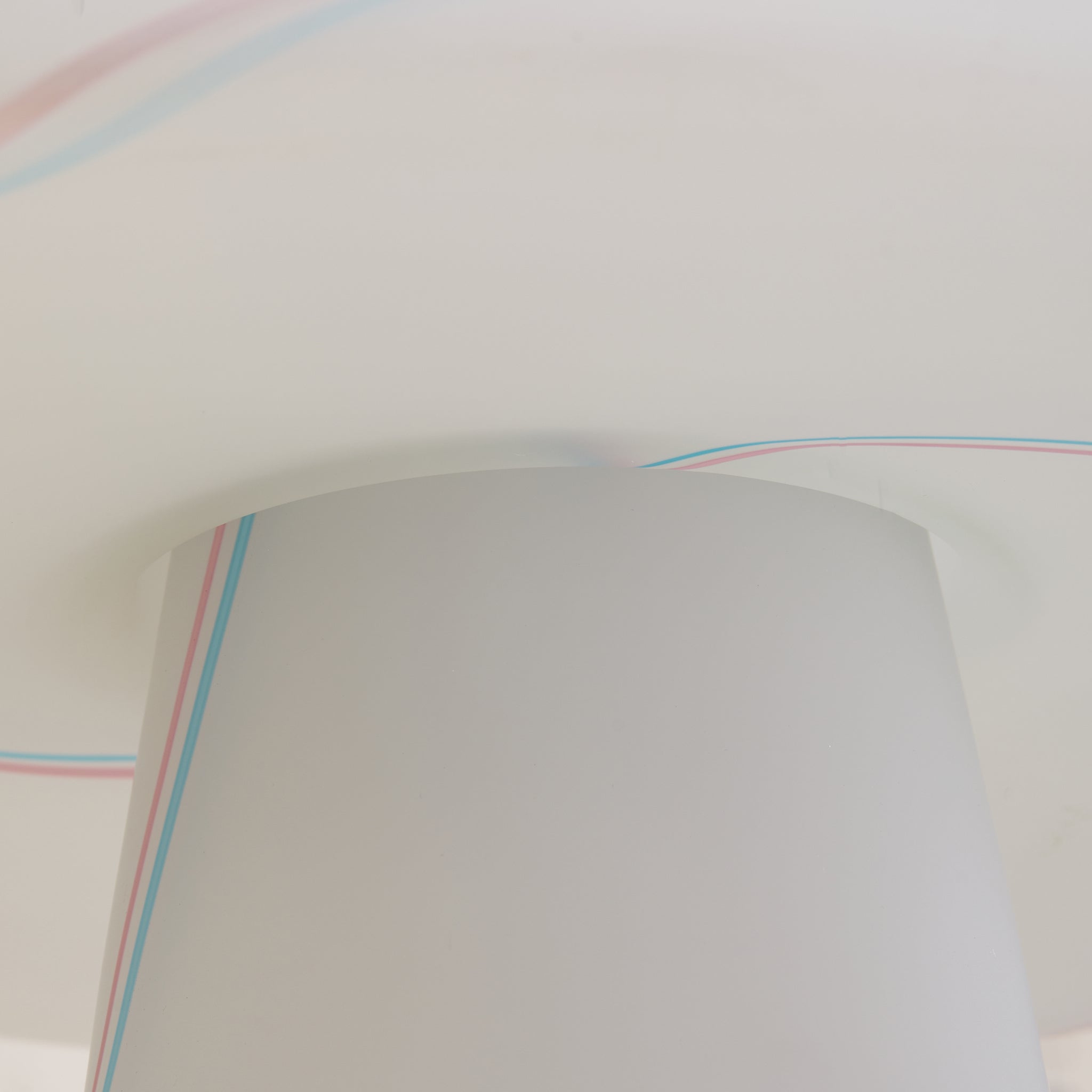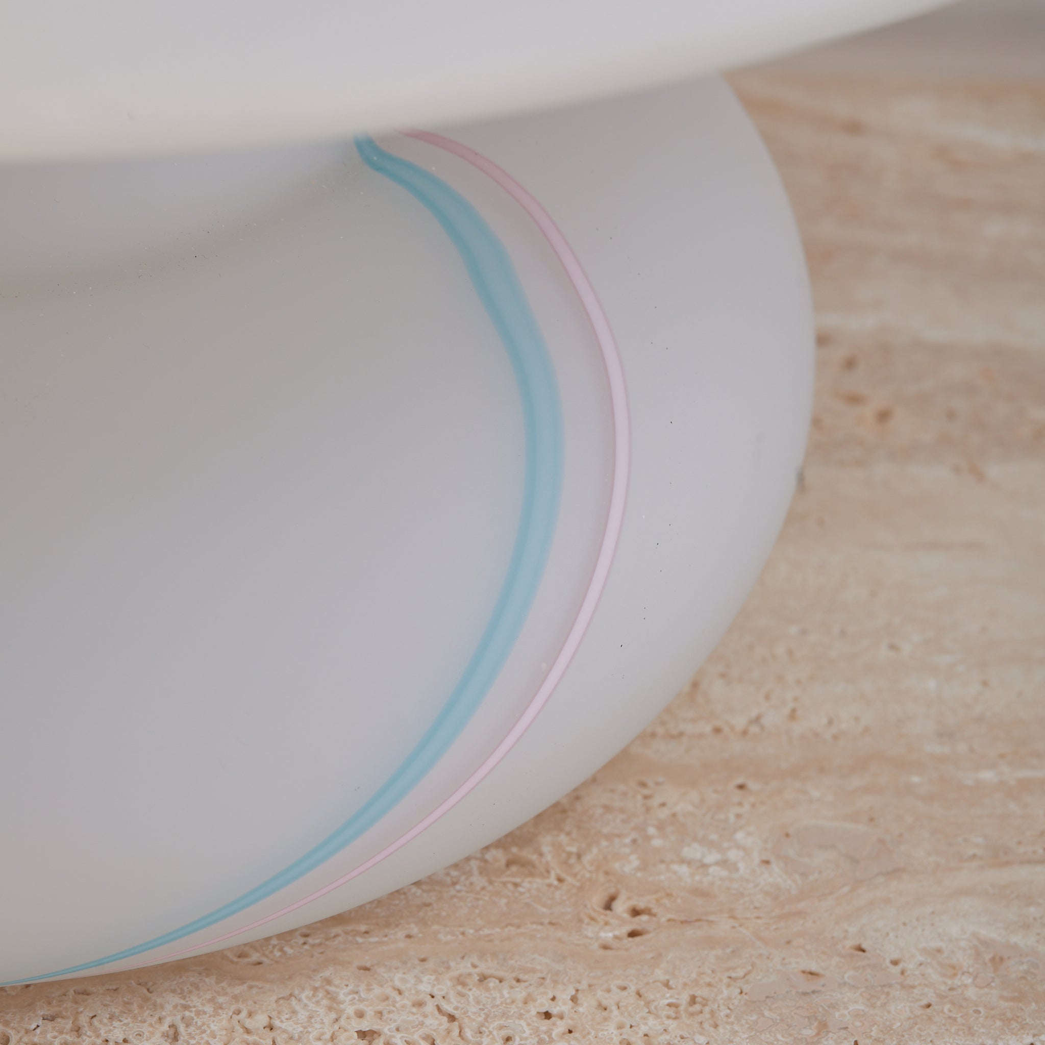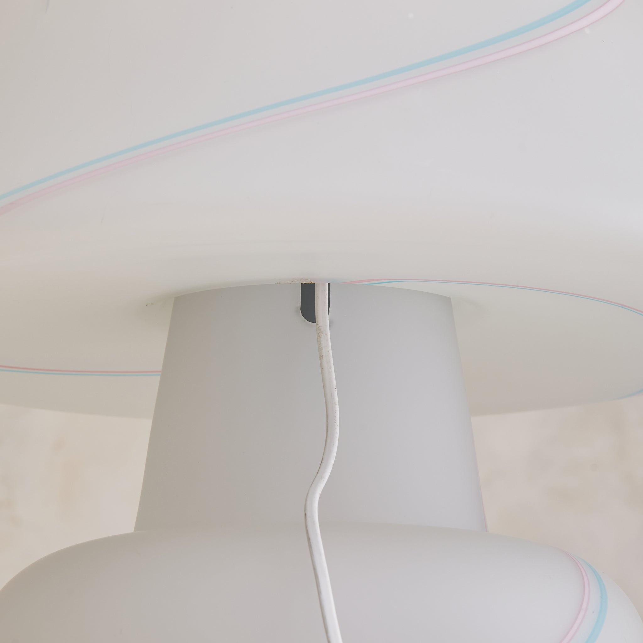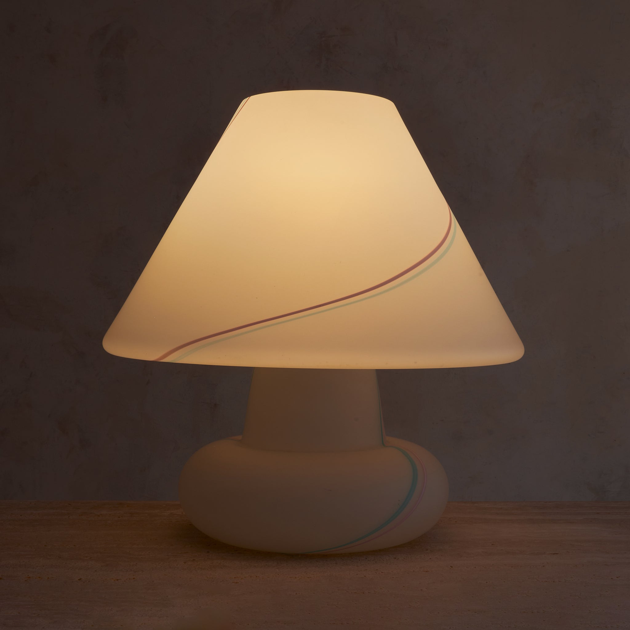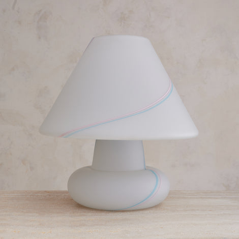 An Italian Murano glass table lamp designed by Vetri in the 1970s. Monumental in scale, the sculptural form is composed of satin-finish glass, accented by swirling ribbons of pink and blue. The mushroom silhouette—with its bulbous curves and generous proportions—measures 18 inches in diameter.