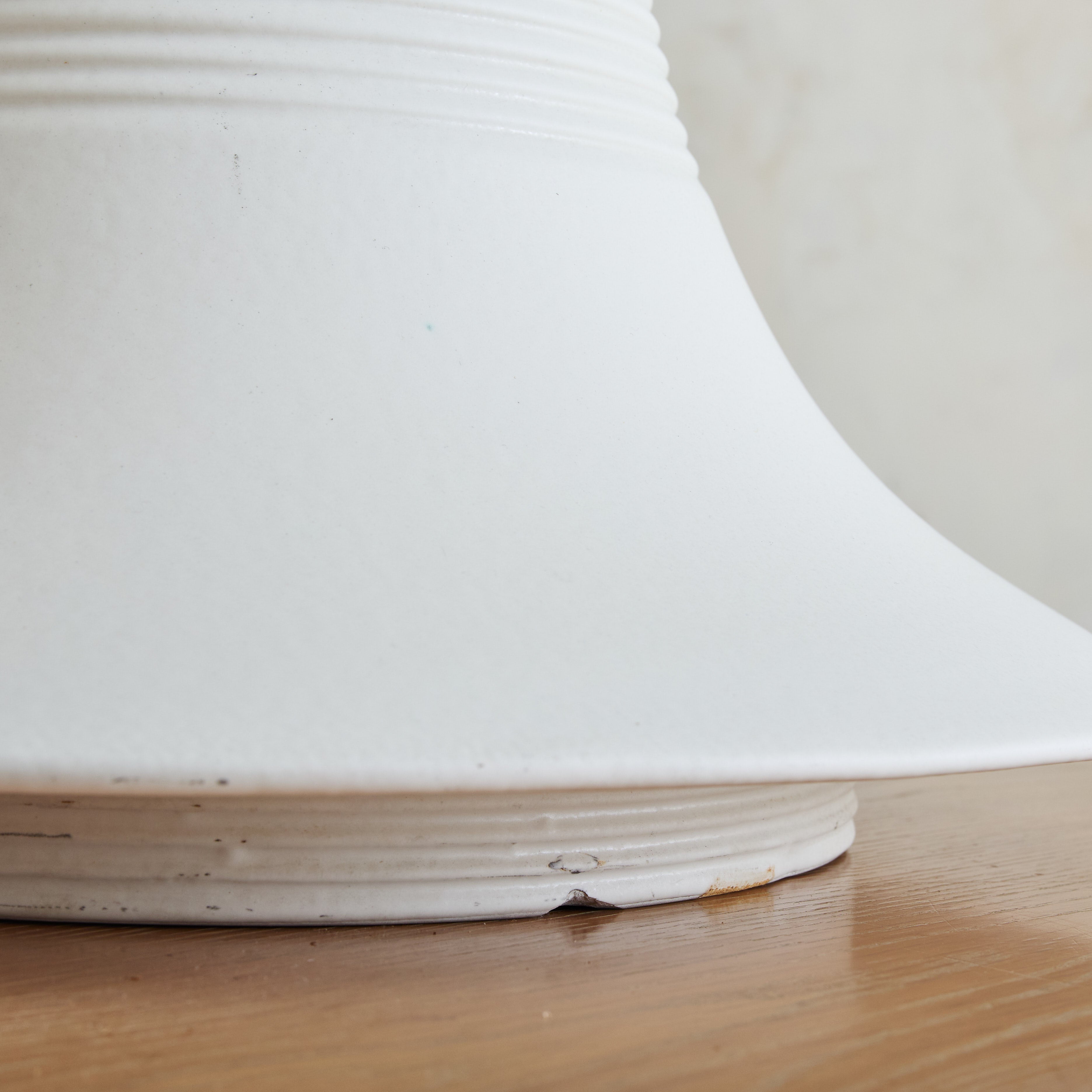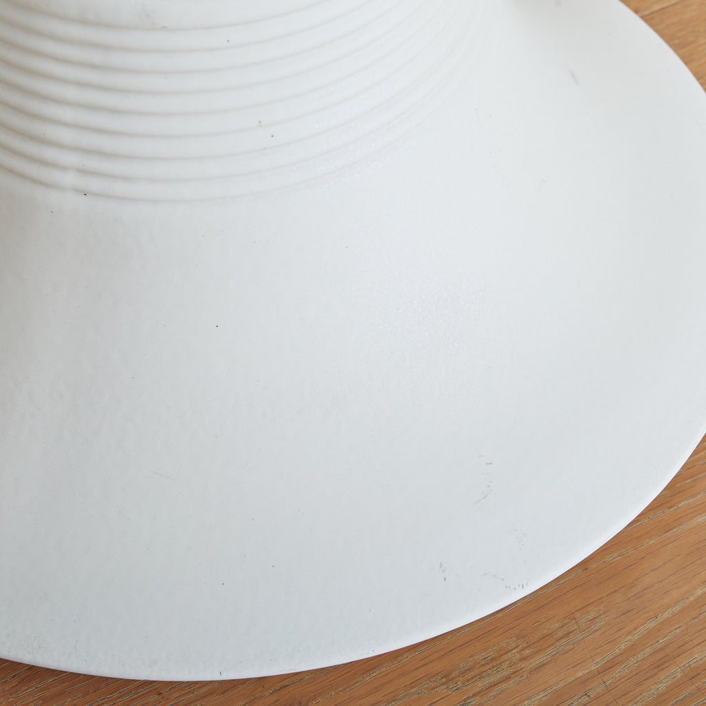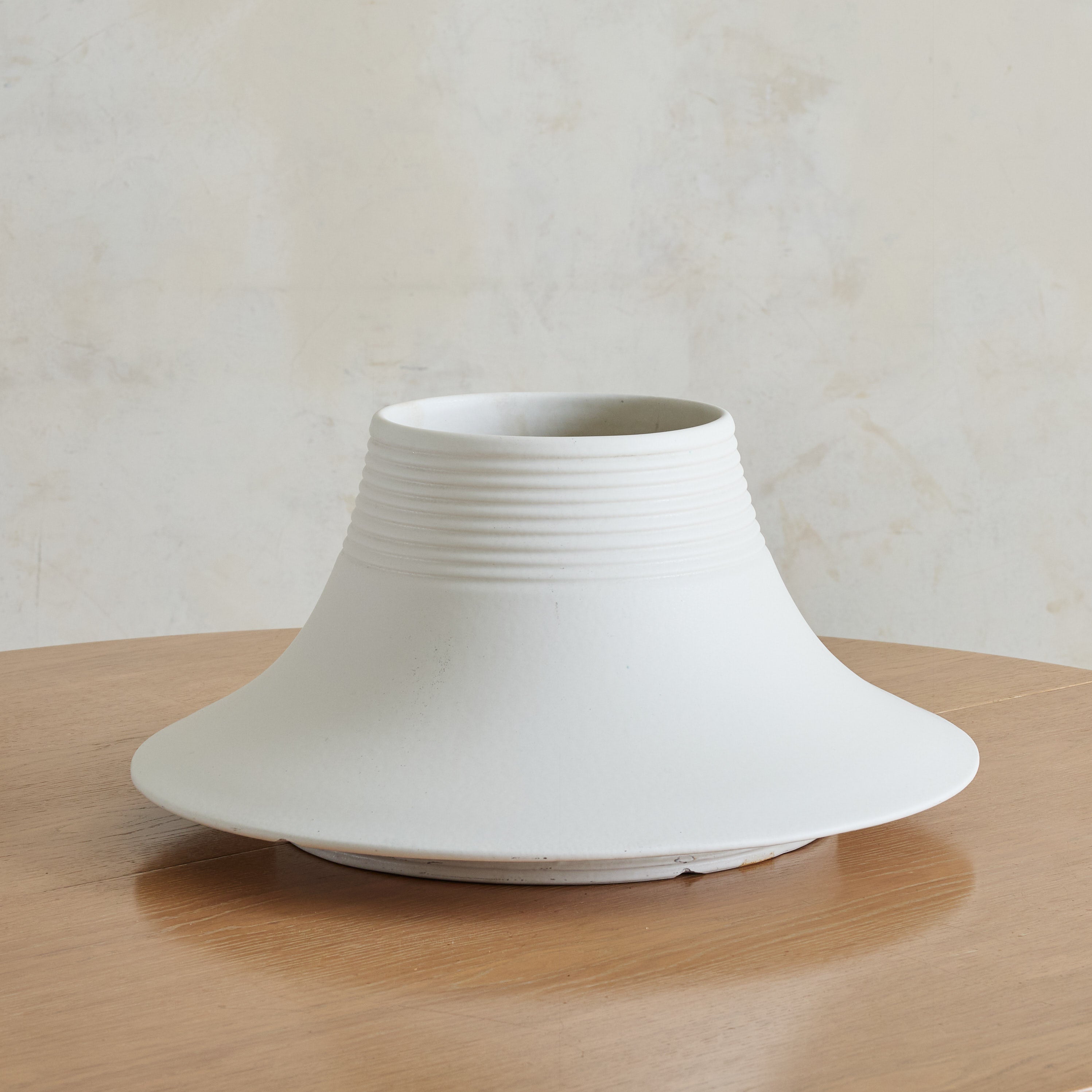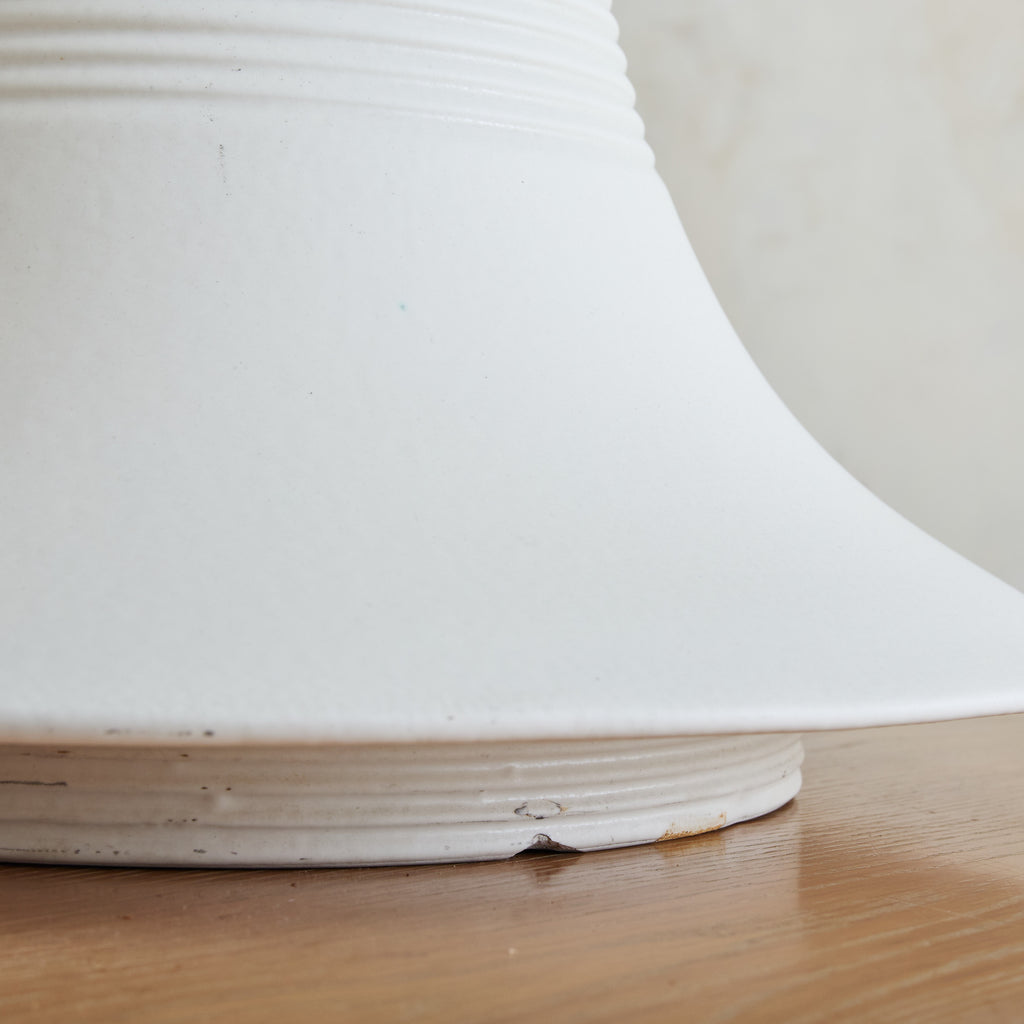 A rare ‘Vesuvio’ vase designed by Angelo Mangiarotti for Gabbianelli in the 1970s. Its modernist, truncated silhouette flares outward in a dramatic gesture, softened by a delicately ribbed neck and recessed base. Crafted in matte white ceramic, the piece strikes a balance between fluidity and structure. Marked with the Gabbianelli 'G' logo on the underside.