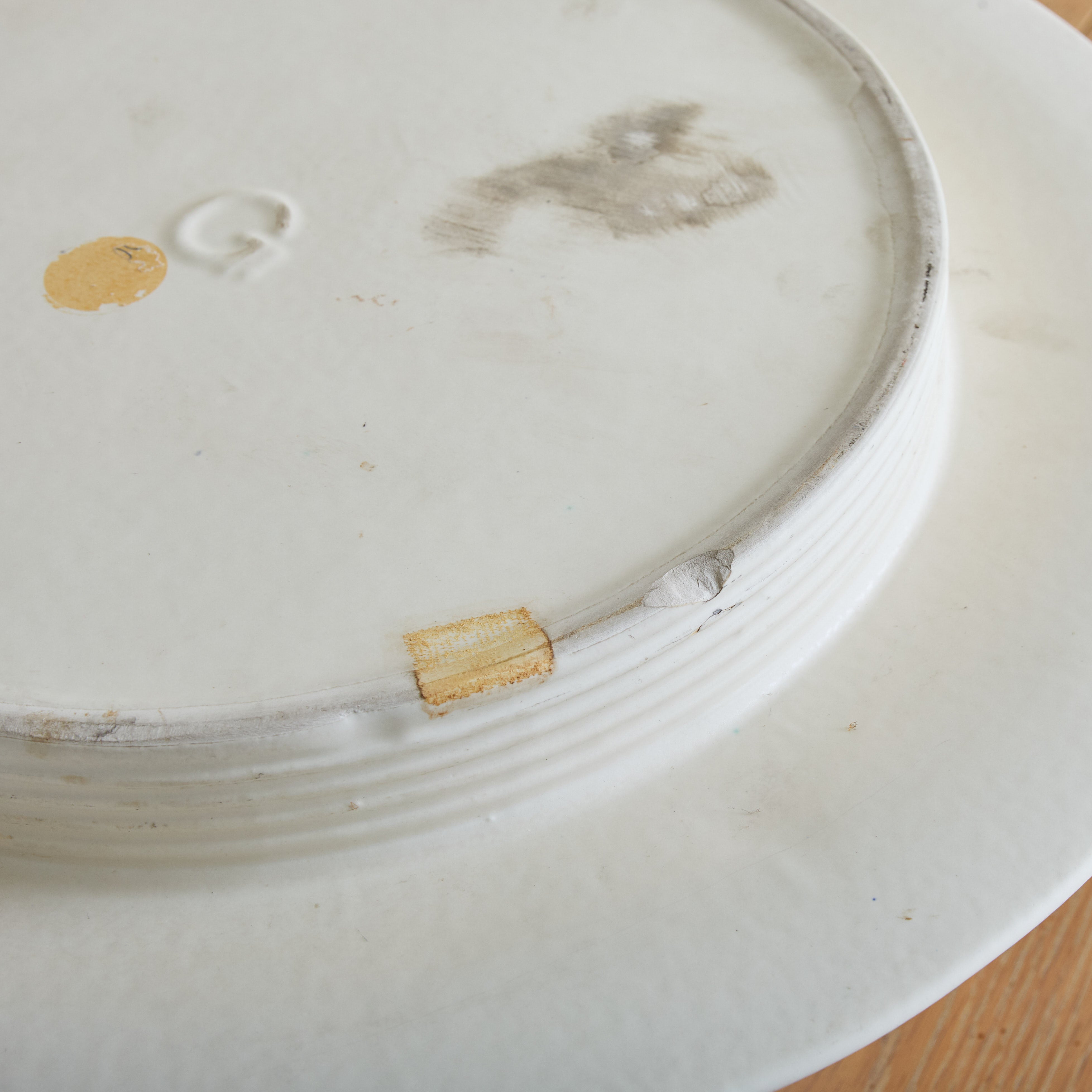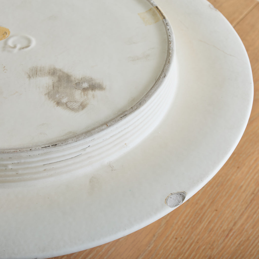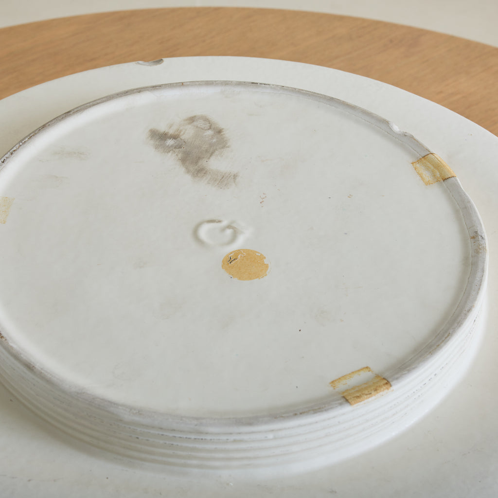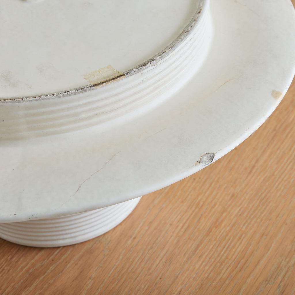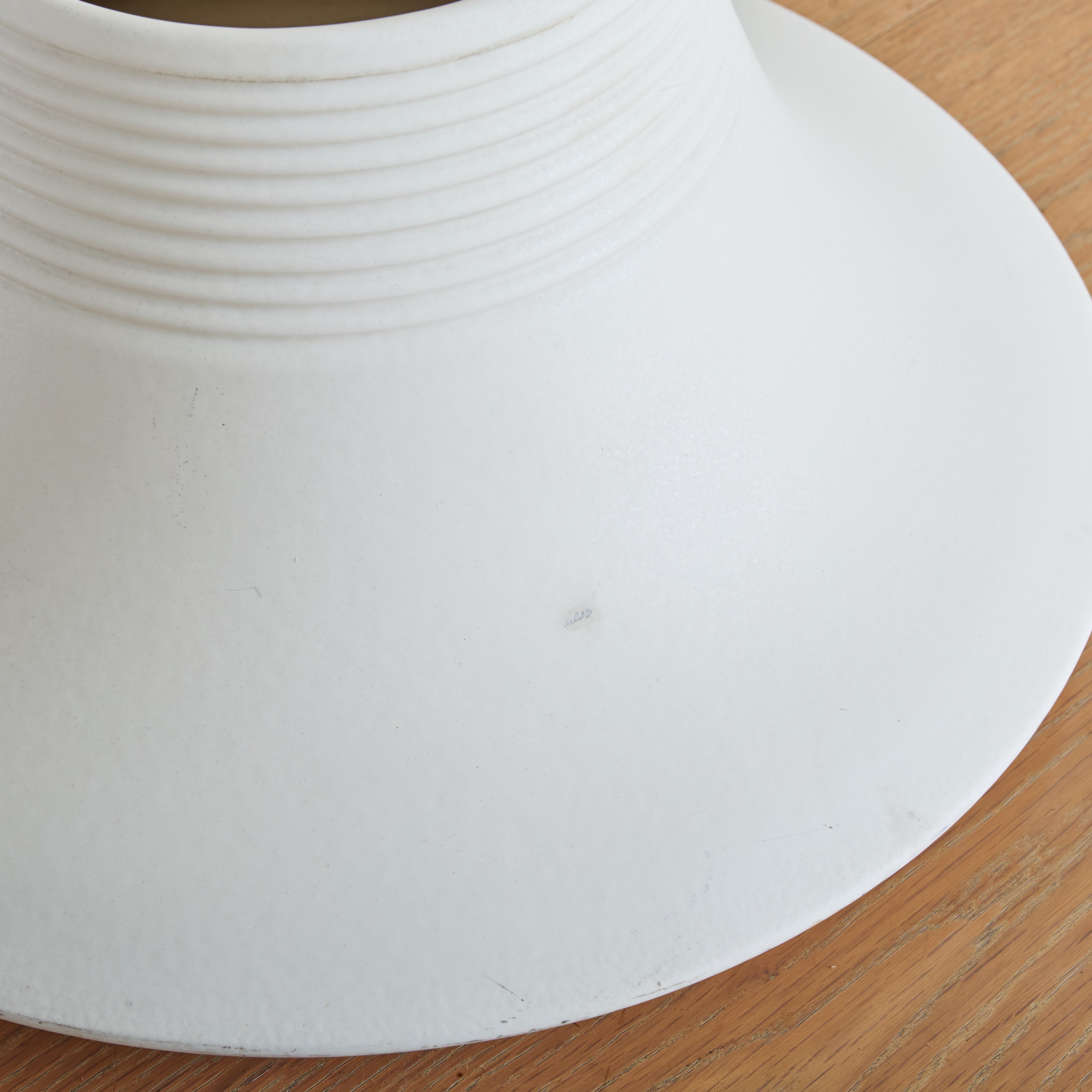 A rare ‘Vesuvio’ vase designed by Angelo Mangiarotti for Gabbianelli in the 1970s. Its modernist, truncated silhouette flares outward in a dramatic gesture, softened by a delicately ribbed neck and recessed base. Crafted in matte white ceramic, the piece strikes a balance between fluidity and structure. Marked with the Gabbianelli 'G' logo on the underside.
