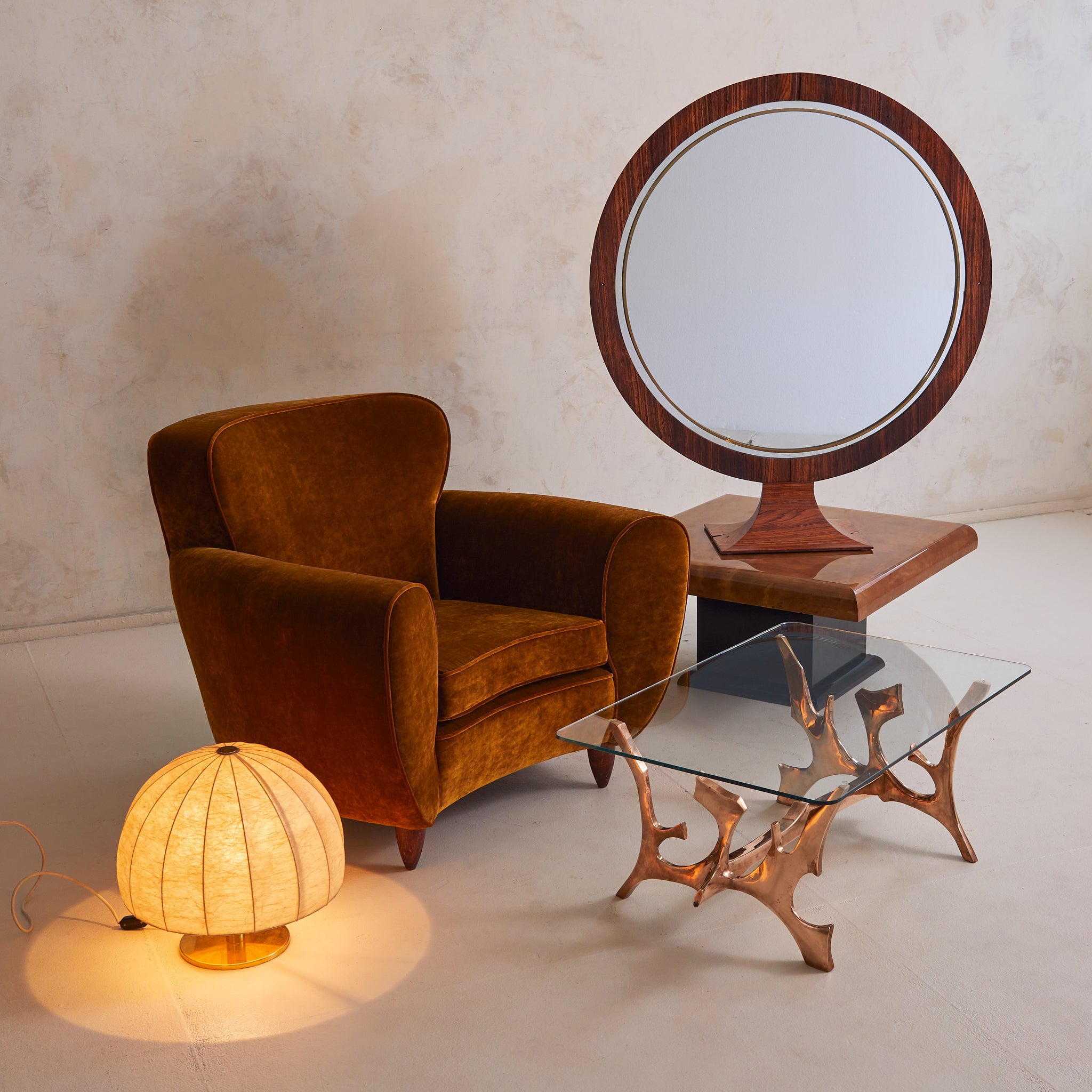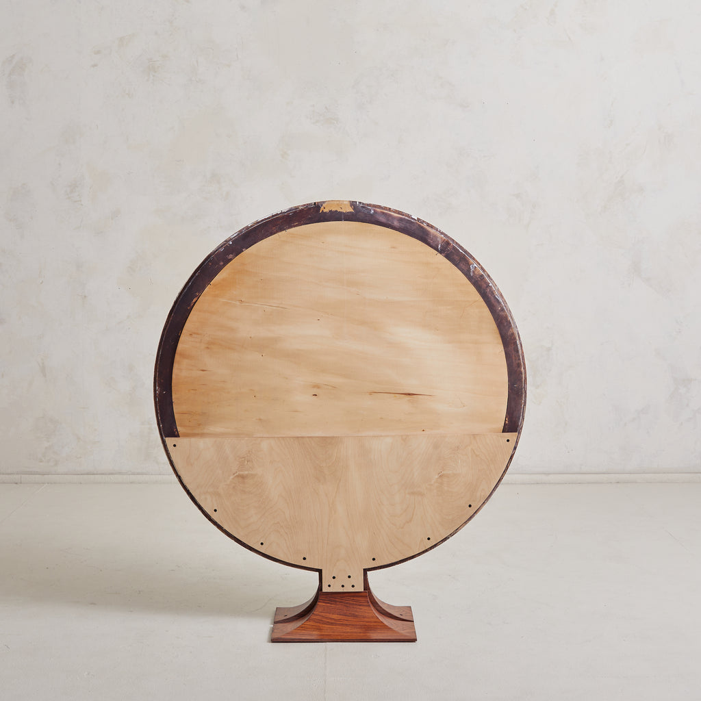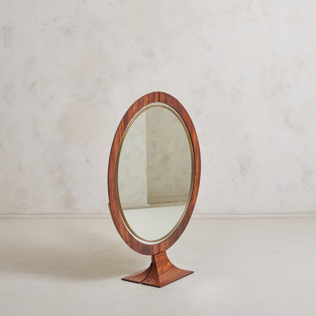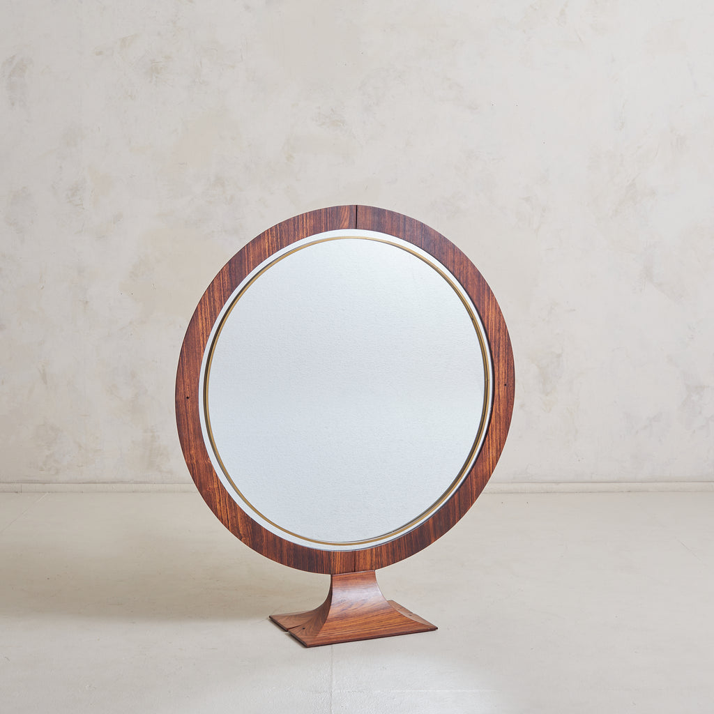 A 1970s Italian freestanding mirror, defined by its sculptural presence and exquisite materials. Its large circular frame is clad in richly grained rosewood, its warmth complemented by a slim brass inlay that subtly outlines the mirrored glass. Elevated on a pedestal base with a flared profile, the design exudes a sense of balance.