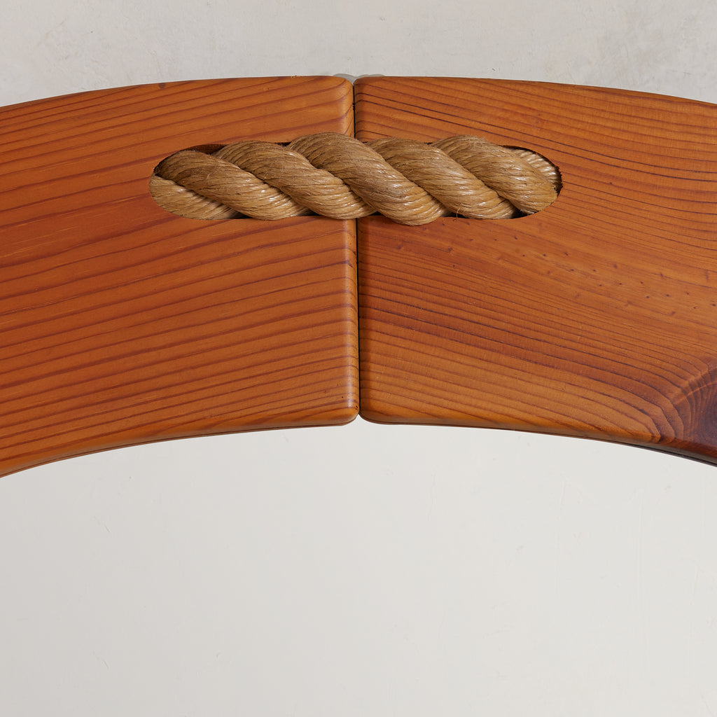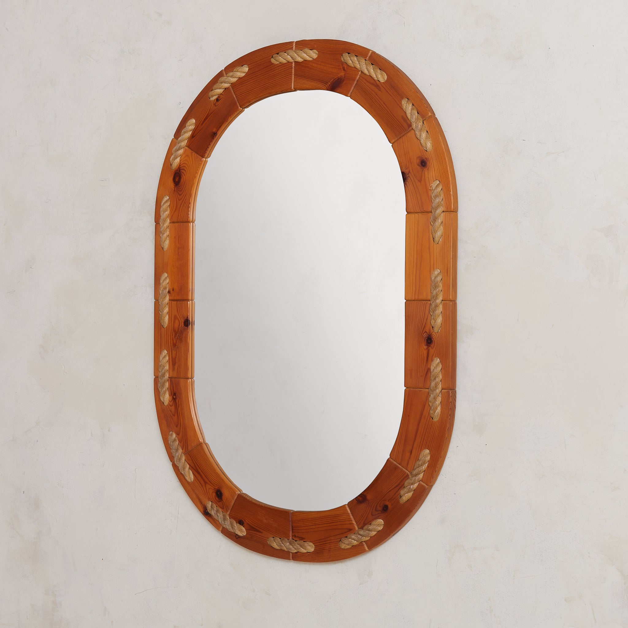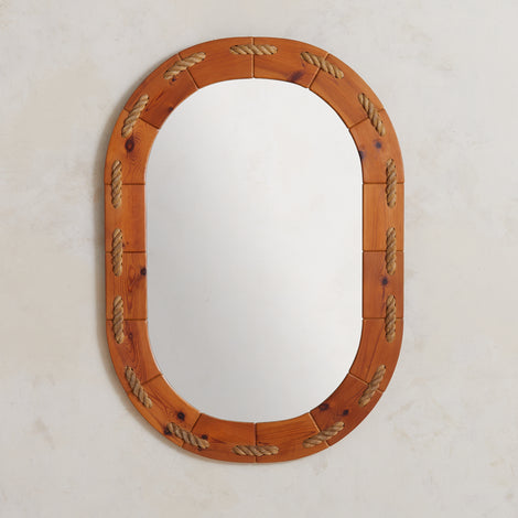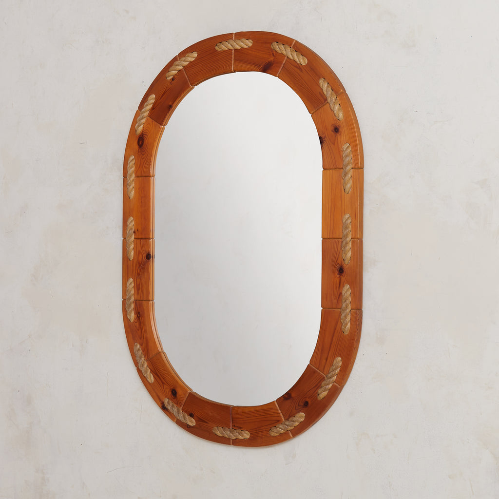 A tactile ode to Nordic craftsmanship, this 1970s Scandinavian wall mirror pairs honest materials with sculptural simplicity. The generously scaled oval frame is crafted from richly grained pine, joined in distinct segments, each hand-inlaid with twisted rope.