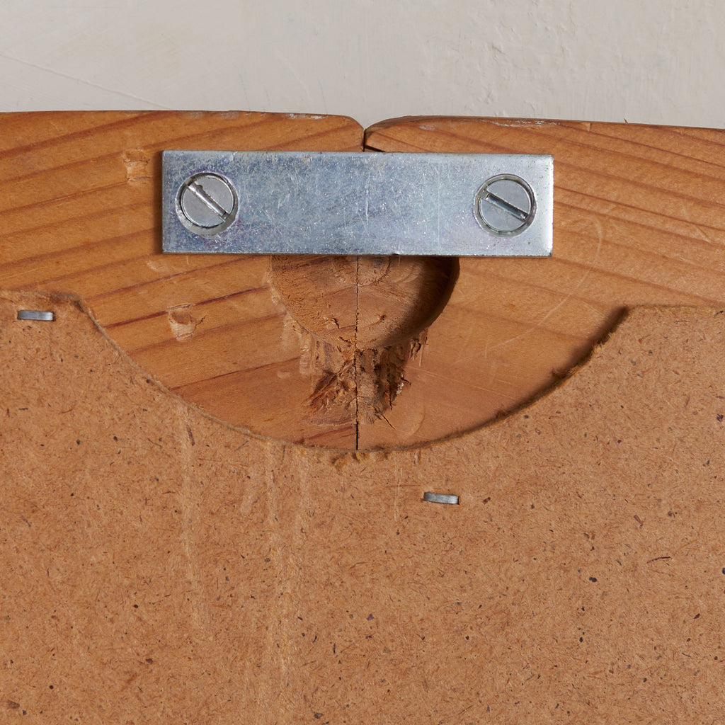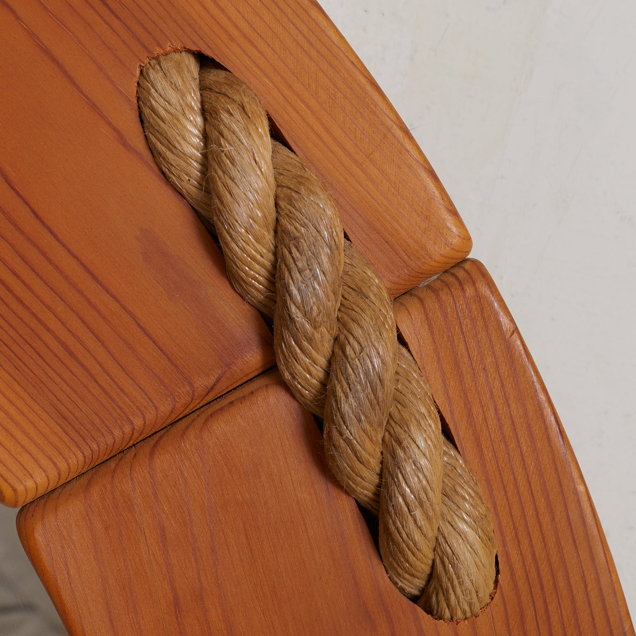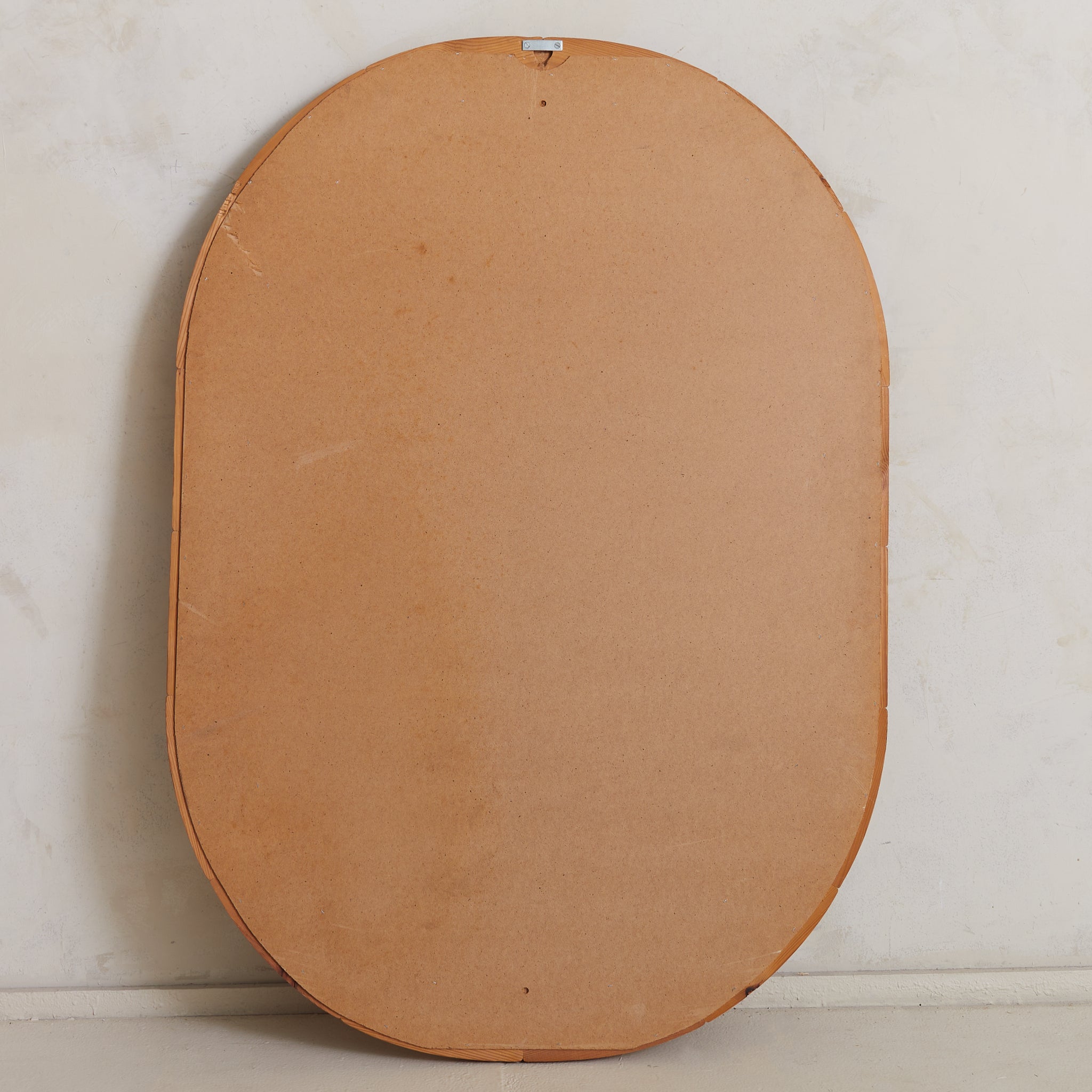 A tactile ode to Nordic craftsmanship, this 1970s Scandinavian wall mirror pairs honest materials with sculptural simplicity. The generously scaled oval frame is crafted from richly grained pine, joined in distinct segments, each hand-inlaid with twisted rope.