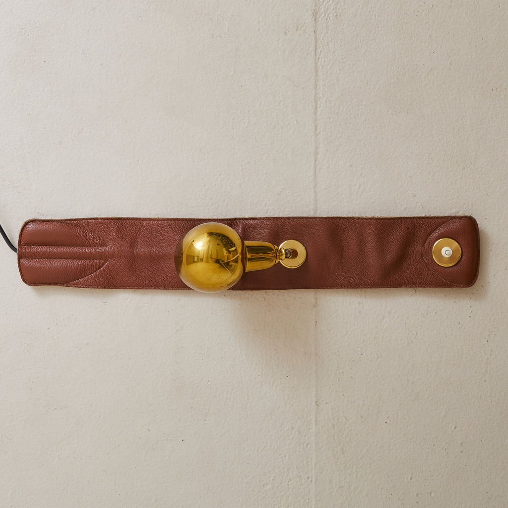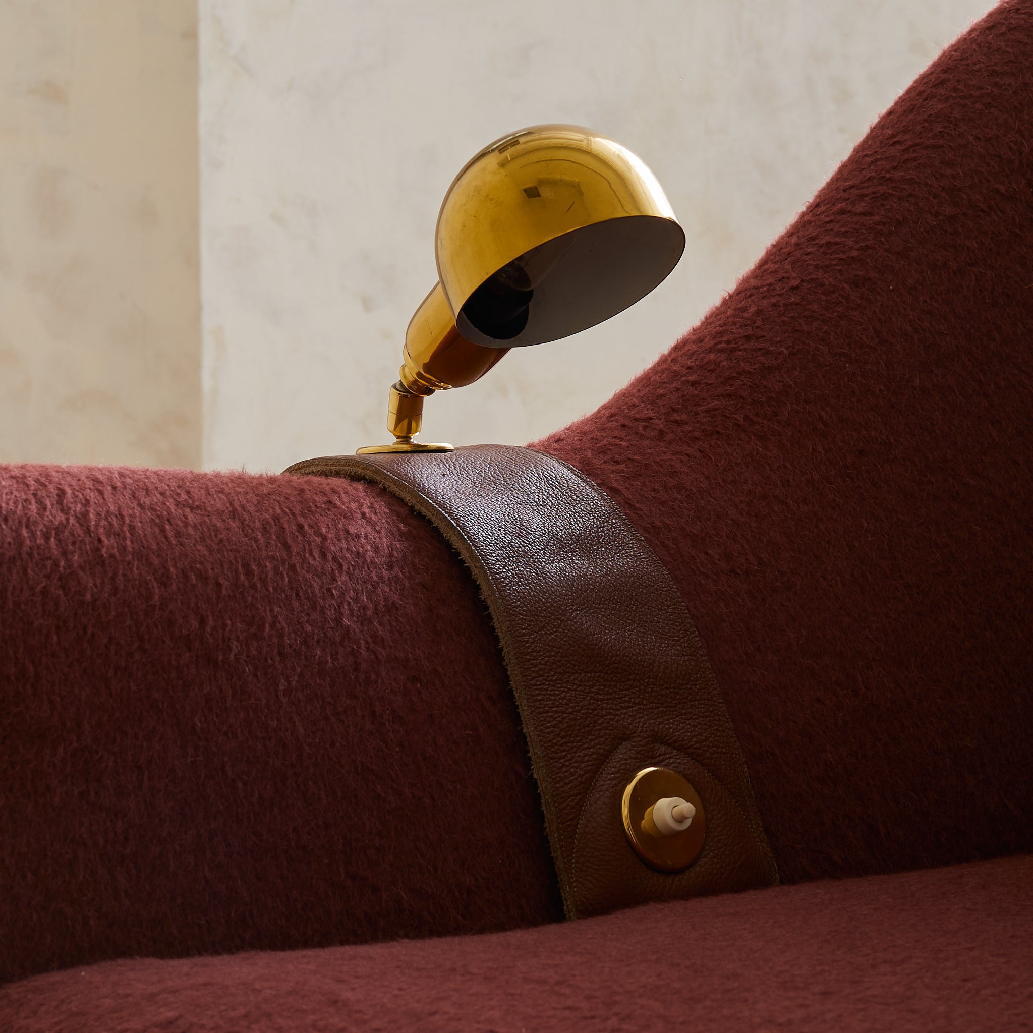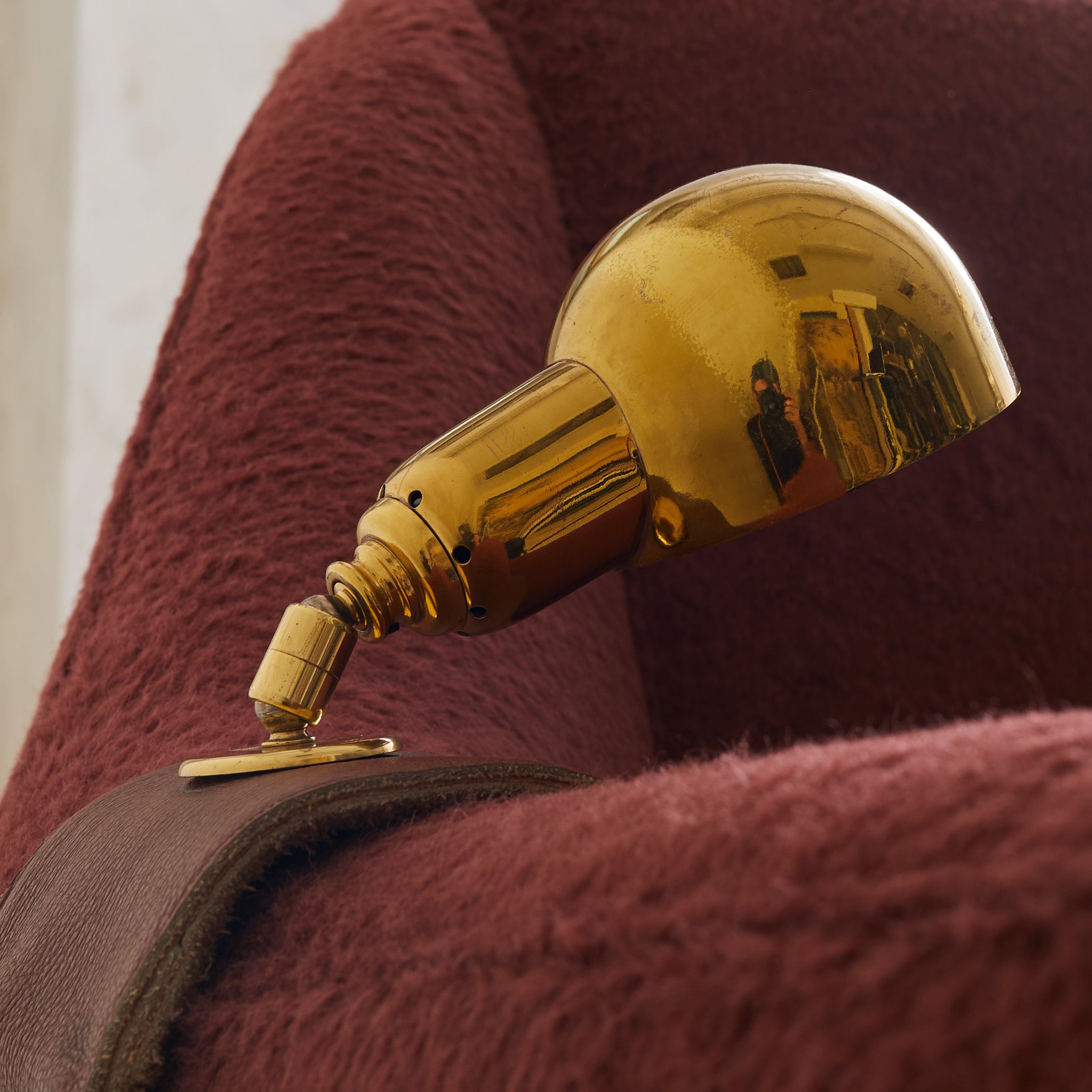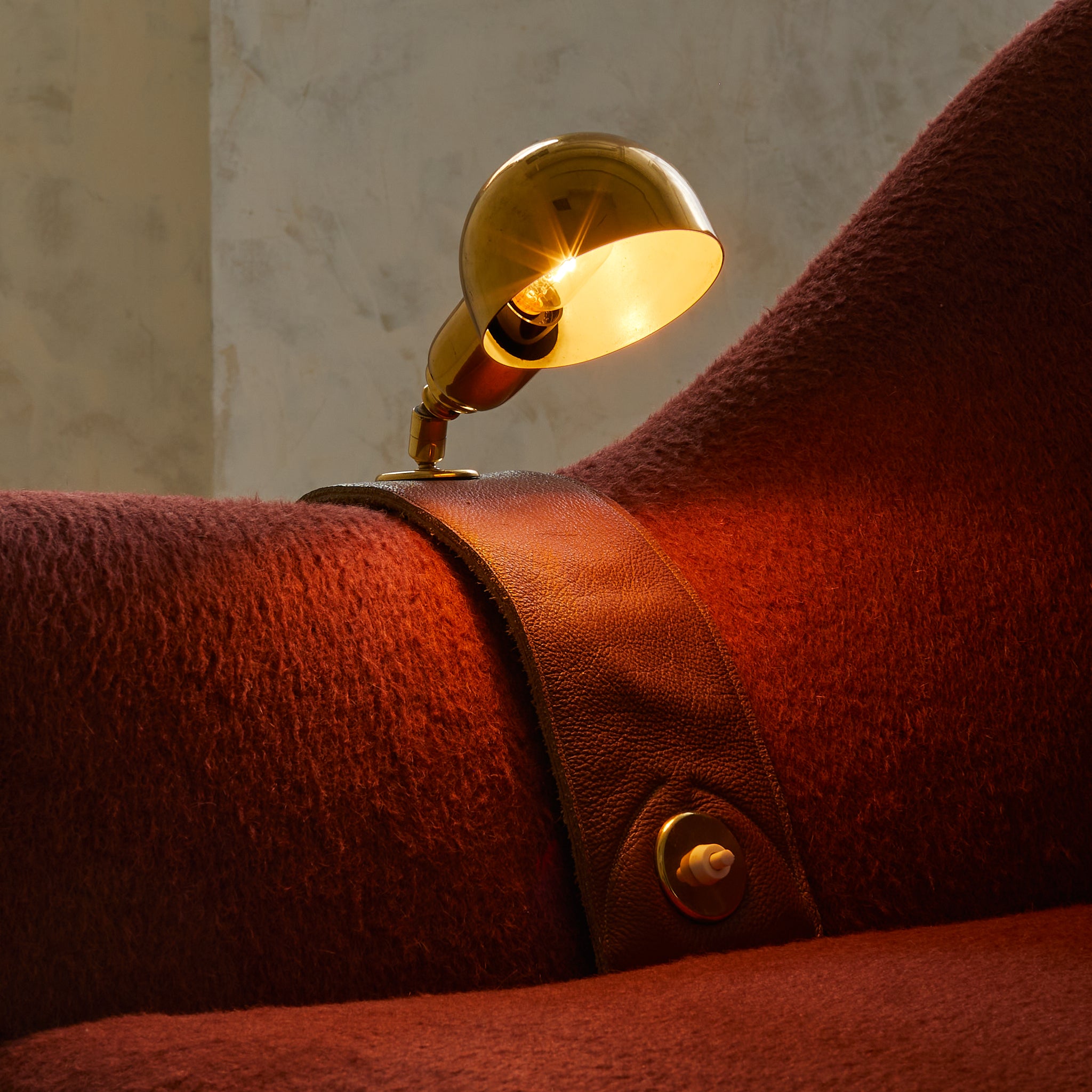 The 'LP01' lamp was designed by Luigi Caccia Dominioni for Azucena in 1970. Crafted to rest on the arm of a chair, it features a brown leather strap paired with a brass arm, swiveling shade, and switch. Its form is understated, yet luxurious, emanating a soft, diffused glow. Stamped ‘Azucena’ along the brass.