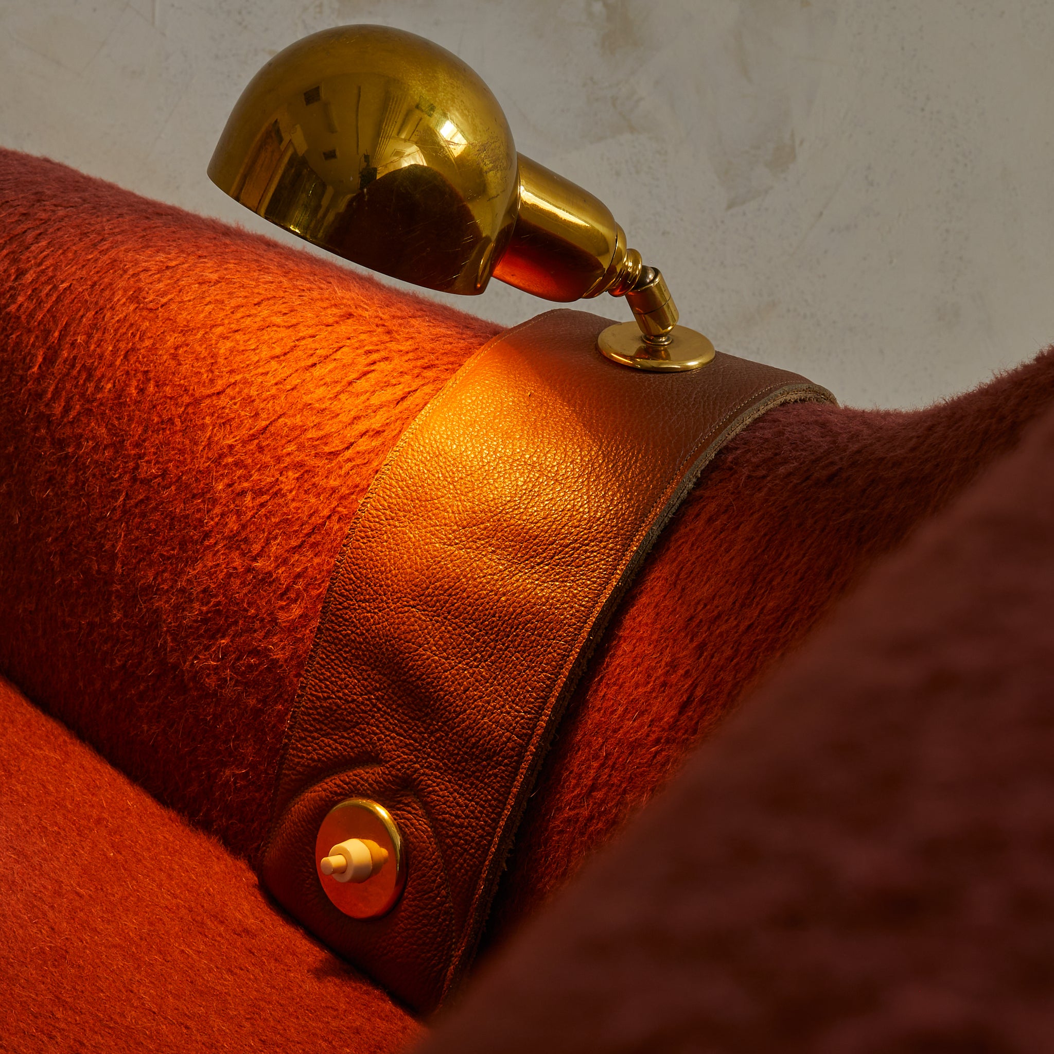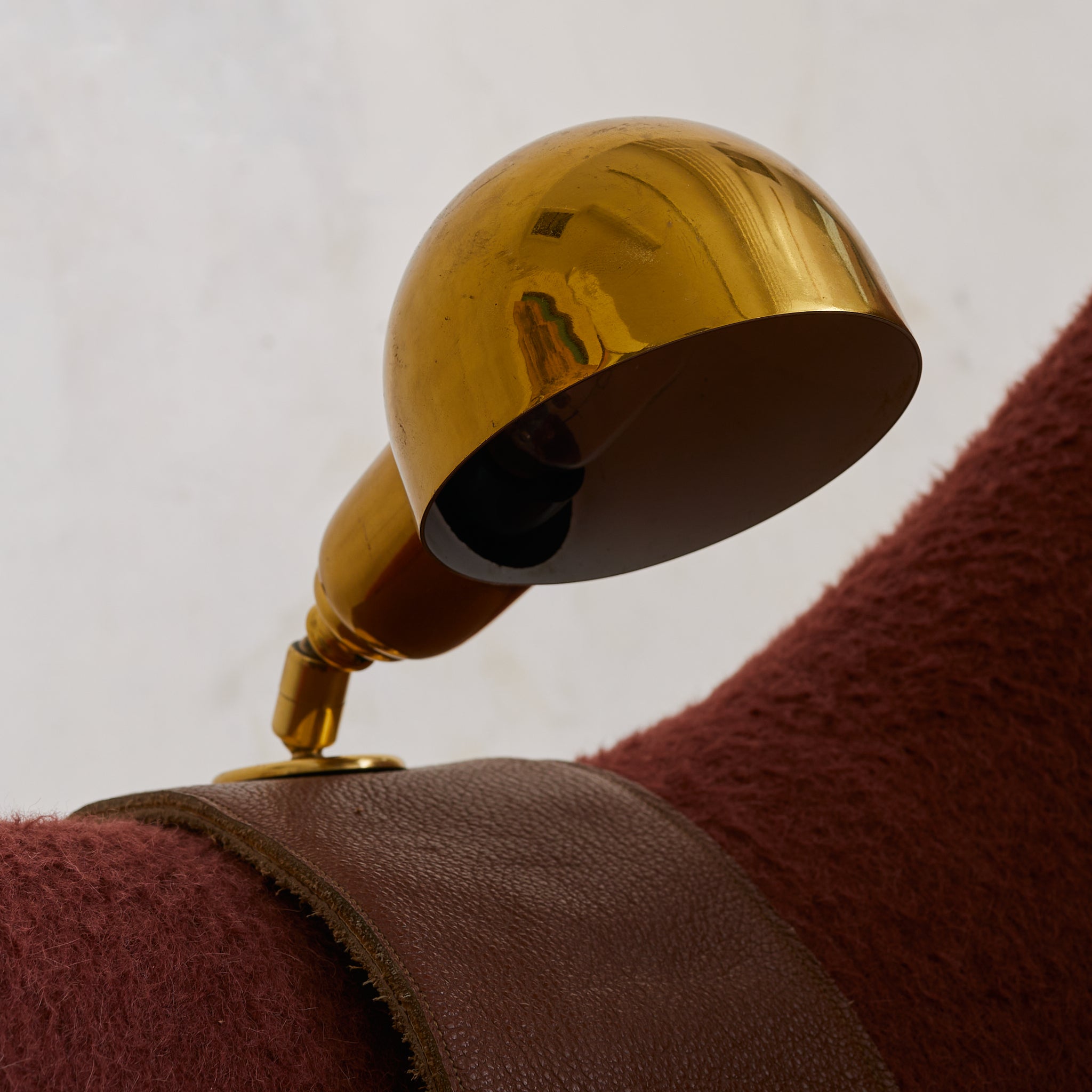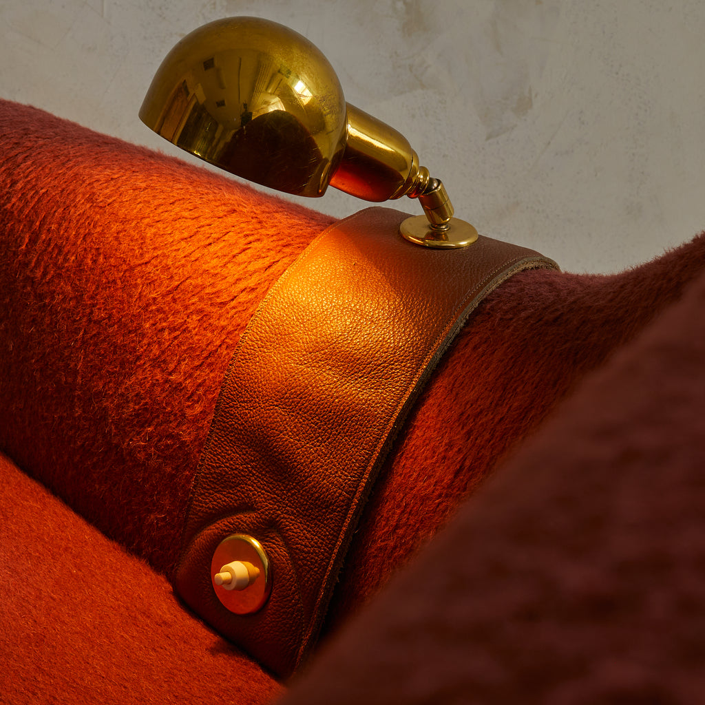 The 'LP01' lamp was designed by Luigi Caccia Dominioni for Azucena in 1970. Crafted to rest on the arm of a chair, it features a brown leather strap paired with a brass arm, swiveling shade, and switch. Its form is understated, yet luxurious, emanating a soft, diffused glow. Stamped ‘Azucena’ along the brass.