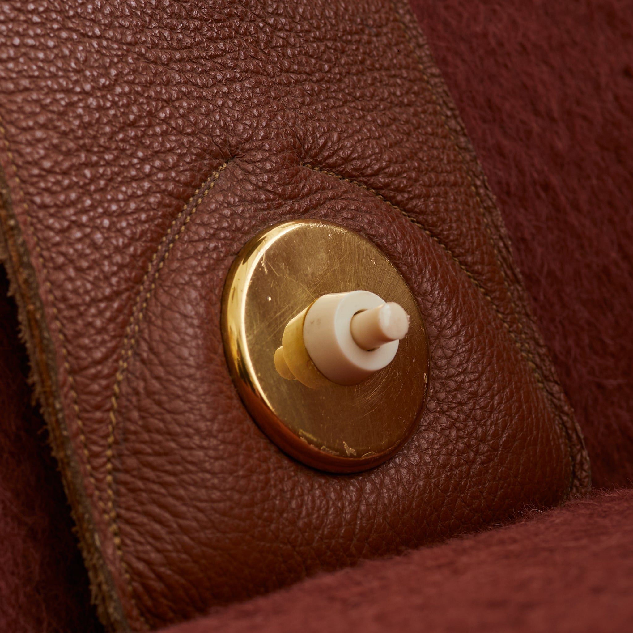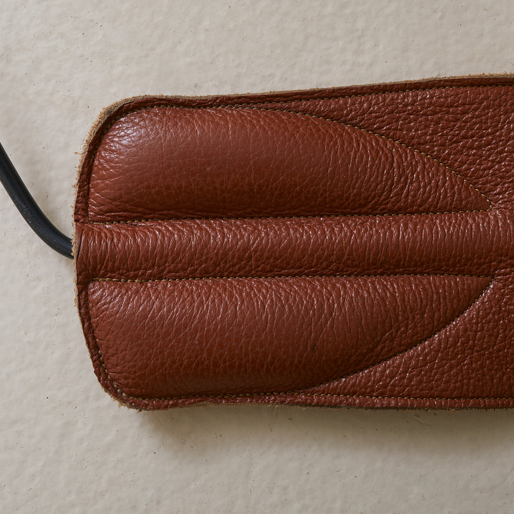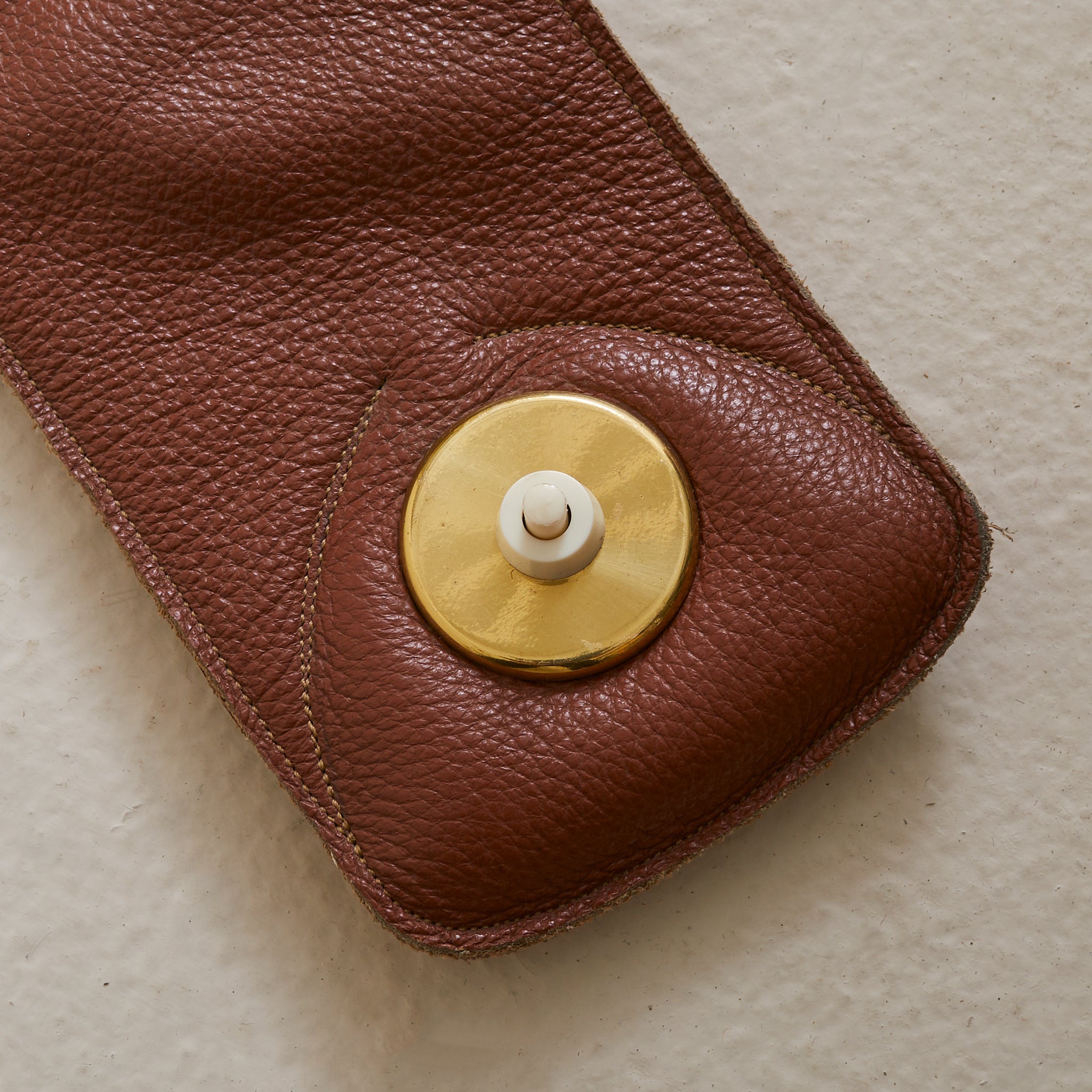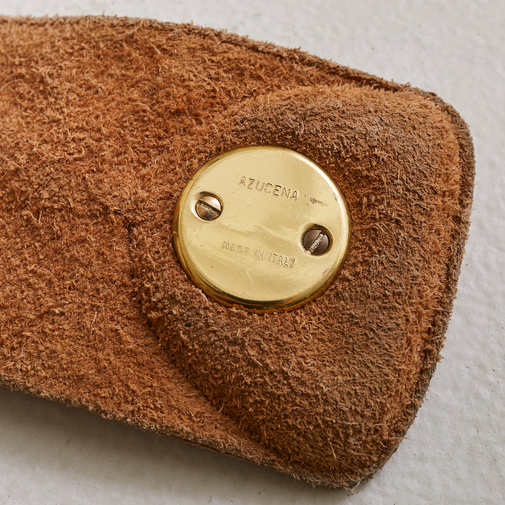 The 'LP01' lamp was designed by Luigi Caccia Dominioni for Azucena in 1970. Crafted to rest on the arm of a chair, it features a brown leather strap paired with a brass arm, swiveling shade, and switch. Its form is understated, yet luxurious, emanating a soft, diffused glow. Stamped ‘Azucena’ along the brass.