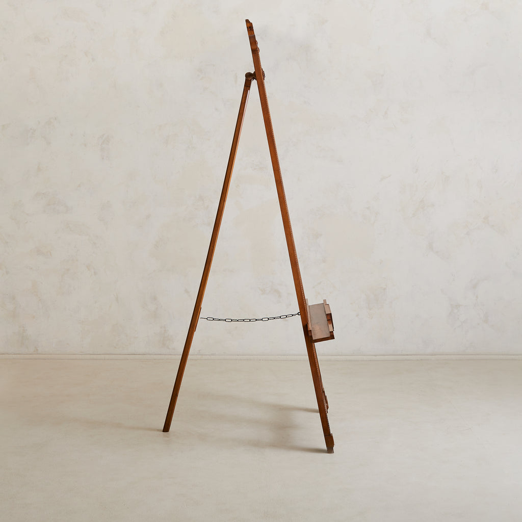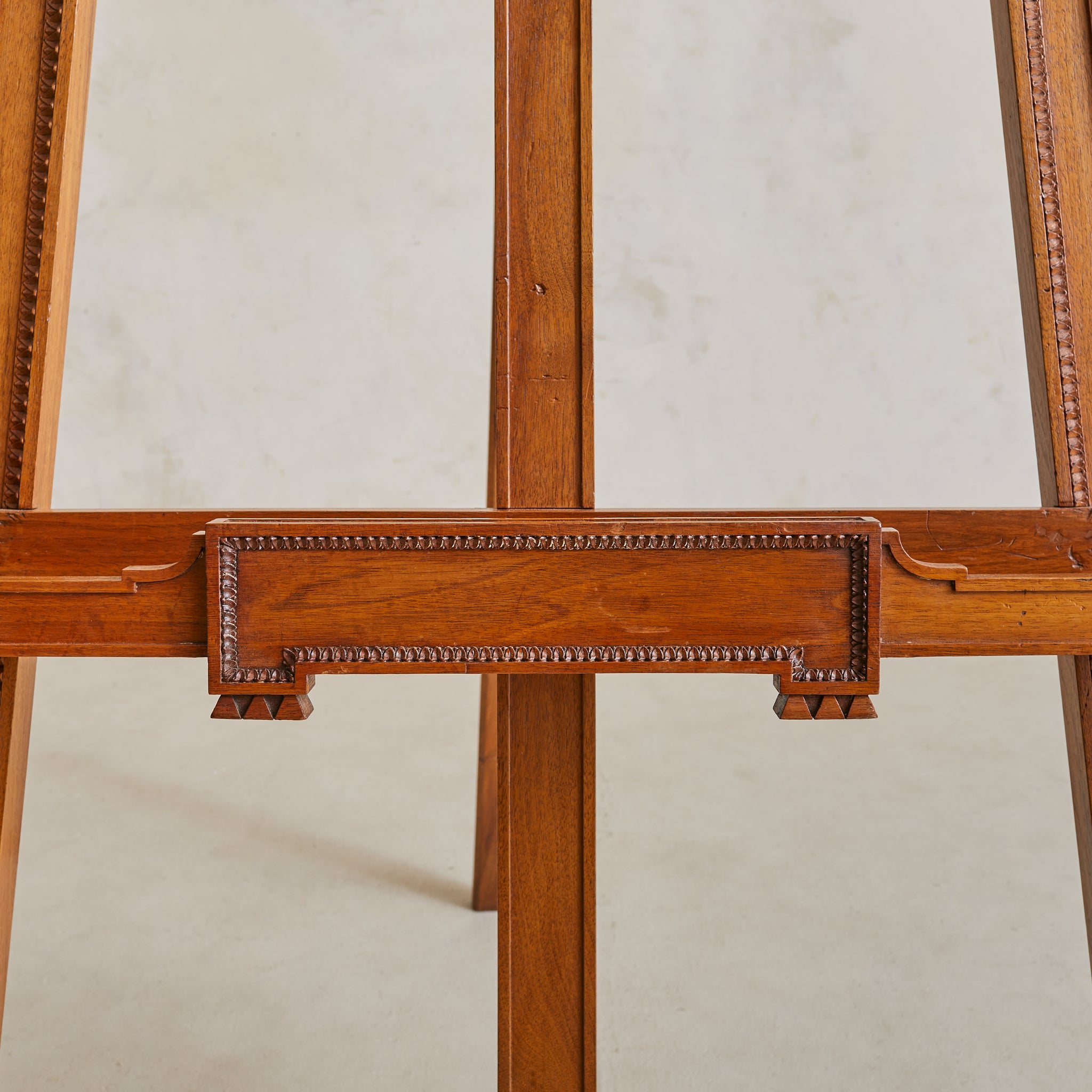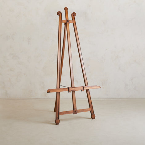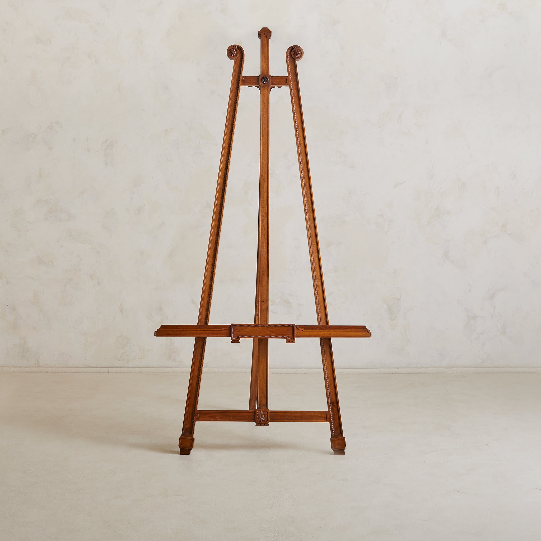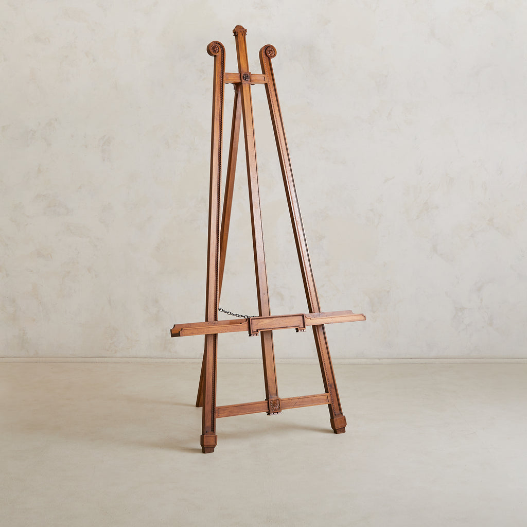 A monumental antique French easel, hand-carved circa 1910. Standing over eight feet tall, the frame features classical scroll motifs, botanical details, and a refined, architectural stance. Constructed of solid wood with a rich patina, its proportions and craftsmanship speak to the grandeur of early 20th-century ateliers. Adjustable via a brass chain support, the easel is functional and sculptural in equal measure.